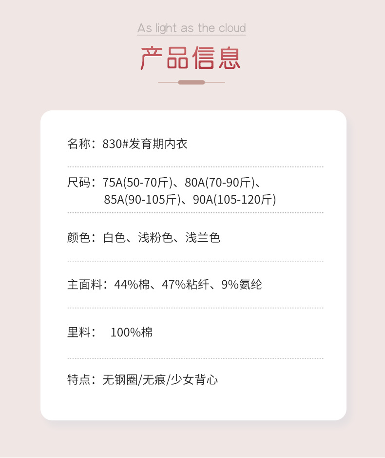 830 # 여자 속옷 중학생 2 ~ 3 단계 청소년 발달 기간 여자 조끼 순면 스포츠 브라
