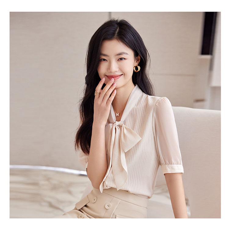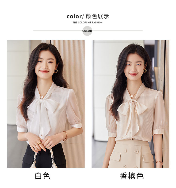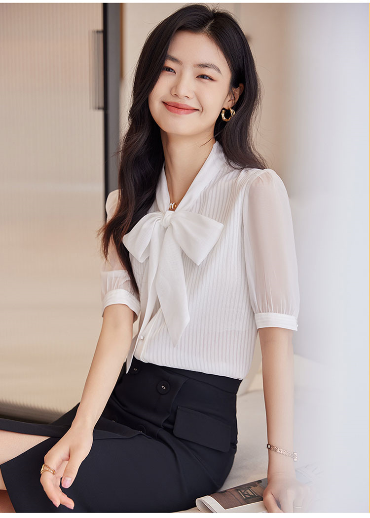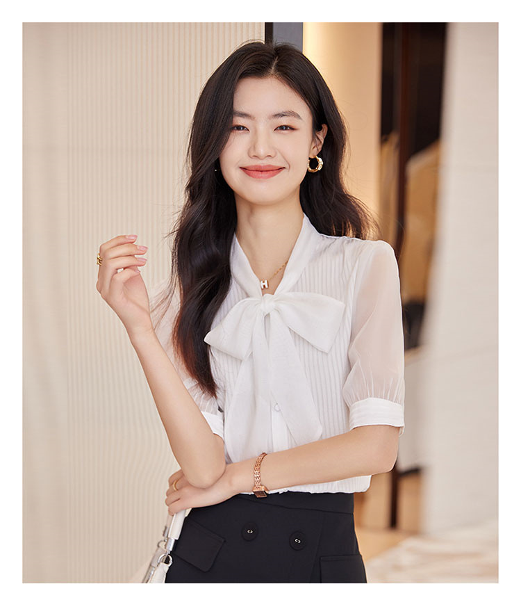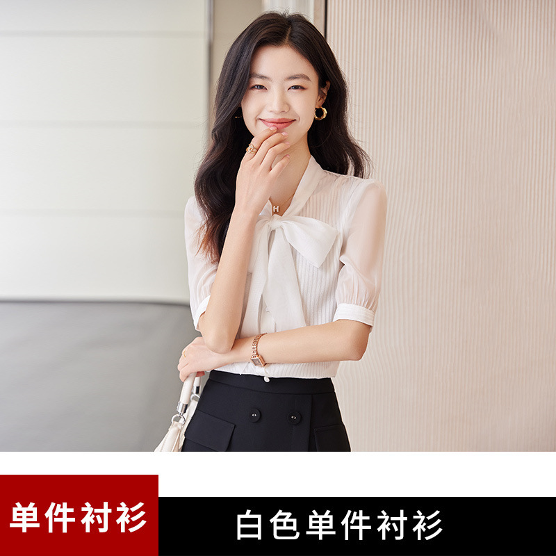 세븐 밸리 니앙 화이트 쉬폰 리본 셔츠 여성용 하이 센스 하프 슬리브 디자인 센스 전문 셔츠 봄과 여름 탑