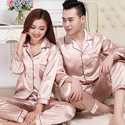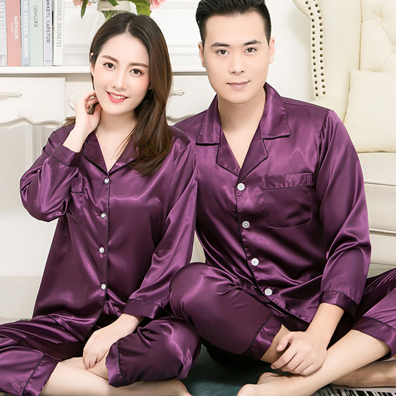 하이 퀄리티 단색 실크 잠옷 얼음 실크 커플 잠옷 봄과 가을 여자의 모조 실크 가정 옷 남자의 세트