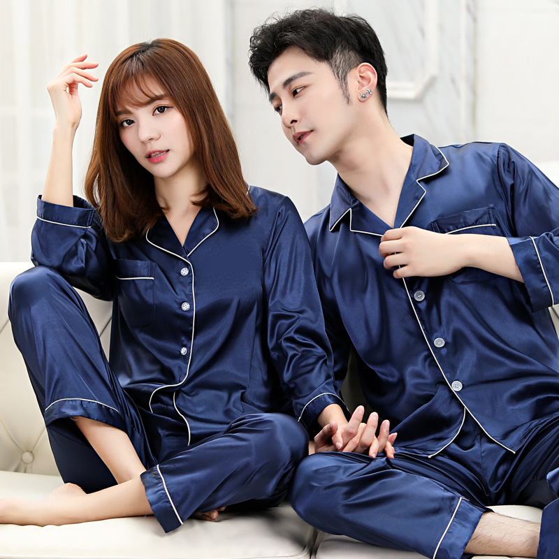 하이 퀄리티 단색 실크 잠옷 얼음 실크 커플 잠옷 봄과 가을 여자의 모조 실크 가정 옷 남자의 세트스토어 가기