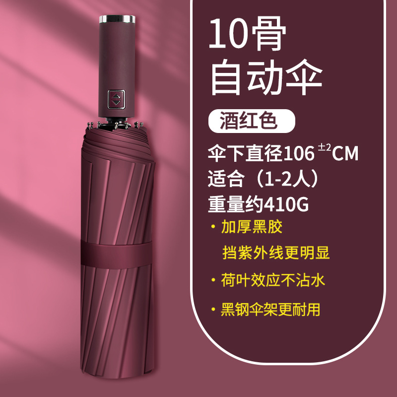 • 10 뼈 검은 접착제 간단한 자동 우산 "버건디"
