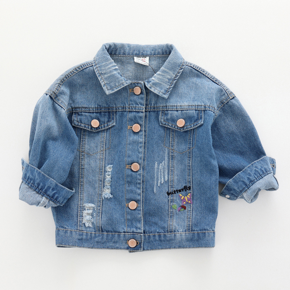 2023春季新款 磨破猫爪痕 女童字母绣花水洗翻领牛仔外套