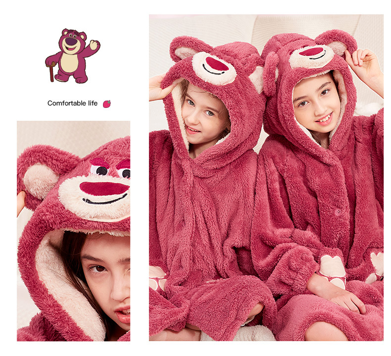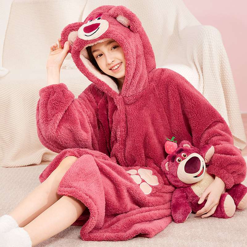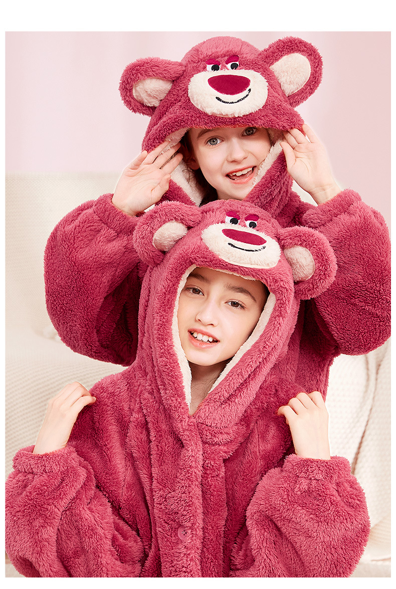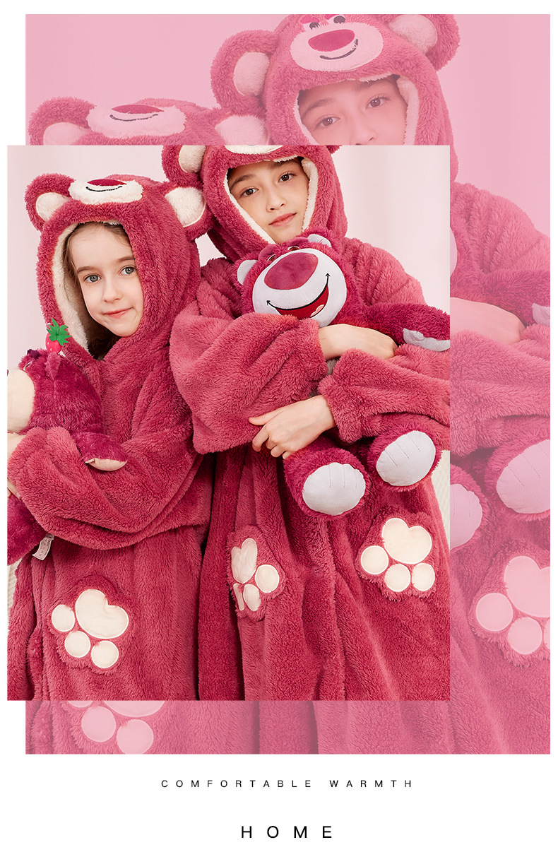 어린이 잠옷 봄과 가을 새로운 스타일 여자 아이 빨간 딸기 곰 플러스 벨벳 두꺼운 코랄 벨벳 따뜻한 잠옷 세트
