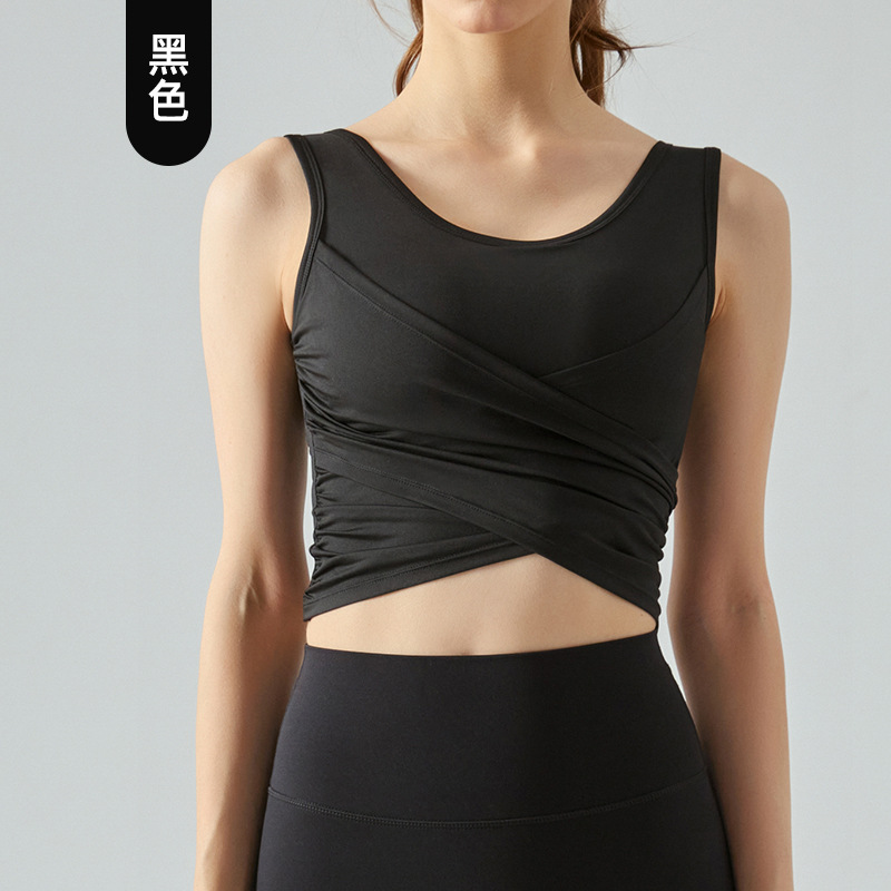 가슴 패드와 크로스 플리츠 요가 조끼 탑 여성 반 고정 컵 피트니스 스포츠 요가 의류 조끼