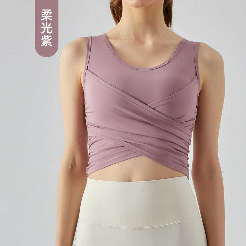 가슴 패드와 크로스 플리츠 요가 조끼 탑 여성 반 고정 컵 피트니스 스포츠 요가 의류 조끼스토어 가기