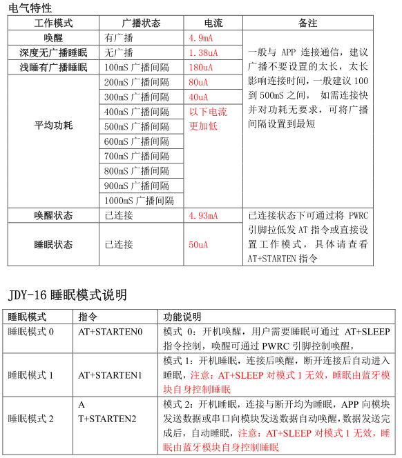 2:射频TX与RX峰值电流5至6mA,CC2541峰值电流十几个MA,在低功耗上JDY-16要比CC2541模块更加省电,功耗更加低,如电子锁、或电池供电的产品,一般更加建议使用JDY-16模块,平均功耗至少是JDY-08的一半。