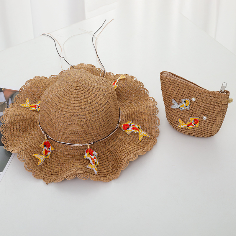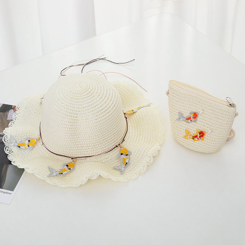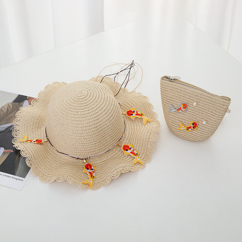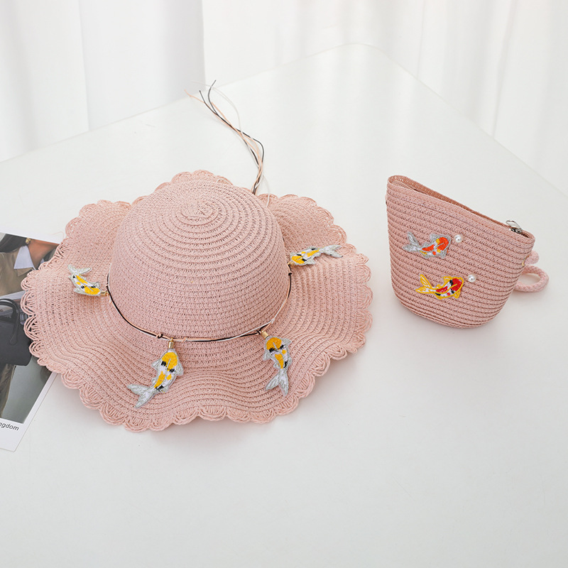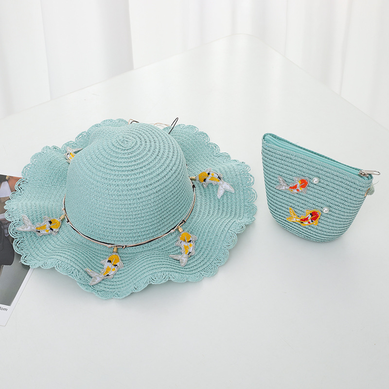 어린이 밀짚 모자 가방 세트 자외선 차단제 태양 모자 소녀 여름 해변 모자 웨이브 밀짚 모자 태양 모자 멋진 모자