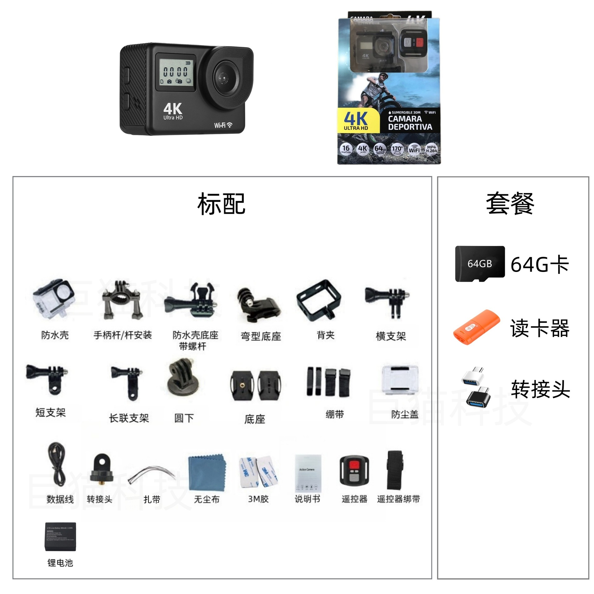 Packing list 包装清单 | 主机*1,防水壳+支架*1,单车支架*1,相机支架*1,头盔座(含3M胶)*2,转接头1*1,转接头2*1,转接头*1,底座*1,数据线*1,录音后盖*1,背夹*1,绑带*,4,扎带*4,擦拭布*1,遥控器*1,遥控器绑带*1,说明书%1,彩盒(含吸塑)*1 |