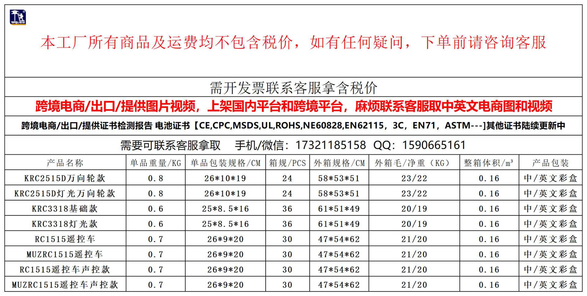 我们原则上不接受退货,产品因出厂质量问题的可协商换货,(多数问题都可以通过更换电池、调整电池安放位置、线头连接...等简单的方式来解决,卖玩具要会修玩具哦)但所产生运输费用需要由买家负责,换货产品务必确保不影响二次销售,收到退回产品后我们会在客户下次进货时将换货一起发出,无法接受下次发货时一起发的情况,运费由客户自理!寄回前必须告知本厂旺旺客服!!!