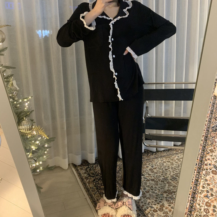 사이버 연예인 레이스 긴팔 심플 블랙 봄과 가을 긴팔 바지 가디건 잠옷 여성용 달콤한 느슨한 가정복