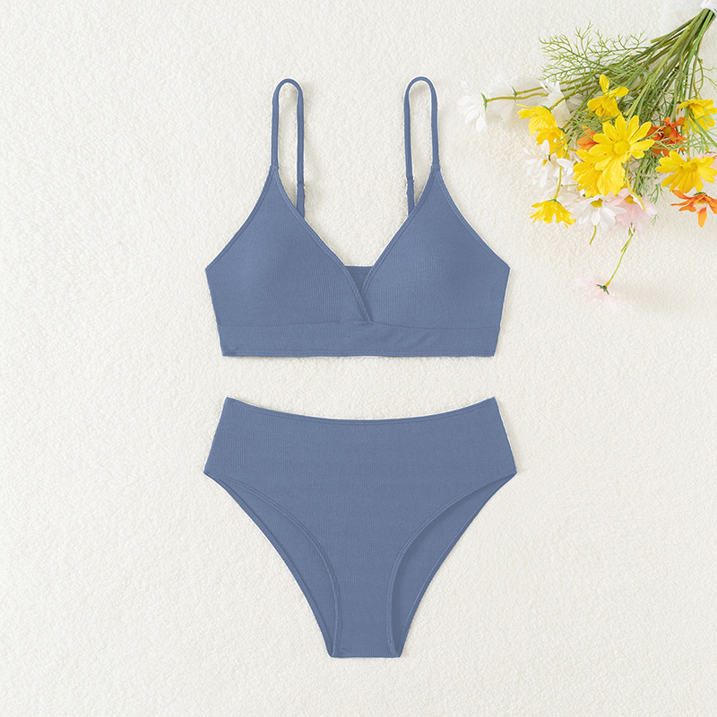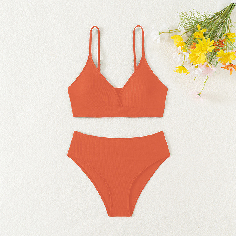 2024新款速卖通欧美纯色分体泳衣女款时尚荷叶边性感比基尼游泳装