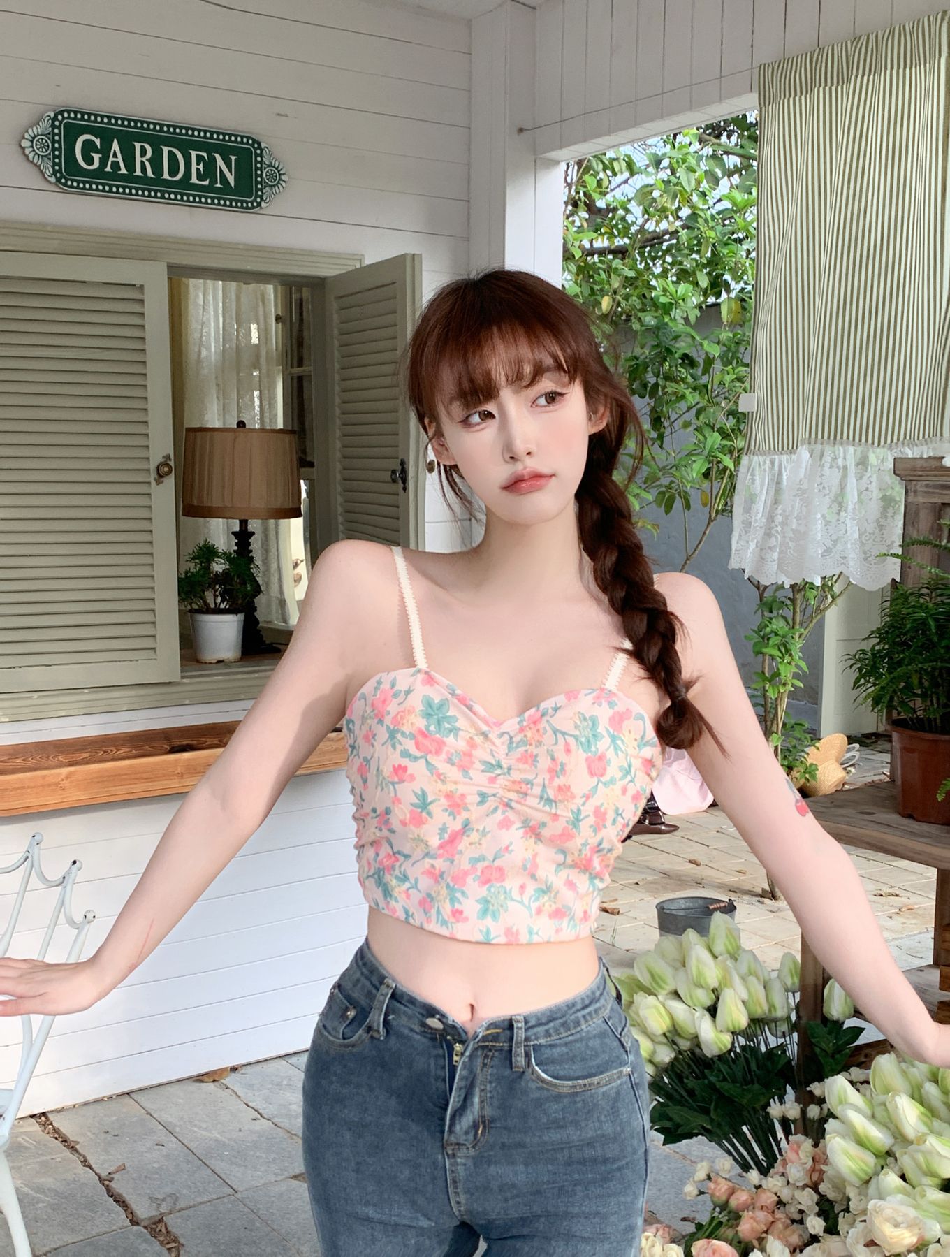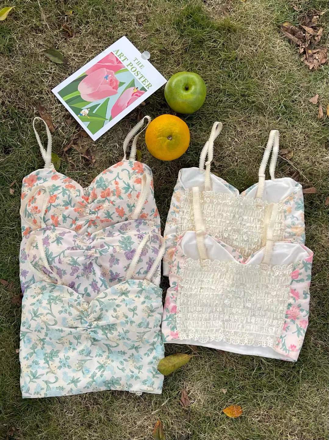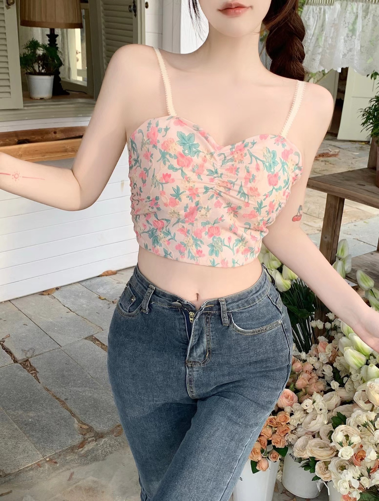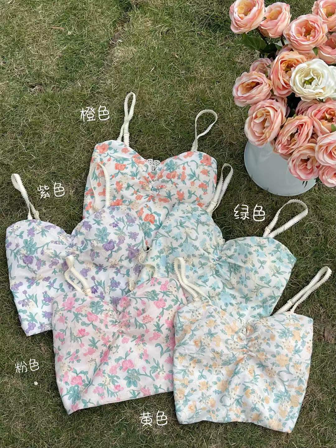 프랑스 스타일 작은 꽃 아름다운 등 슬링 조끼 여성용 벨트 가슴 패드 모든 일치 바닥 튜브 탑 여름 섹시한 달콤한 탑