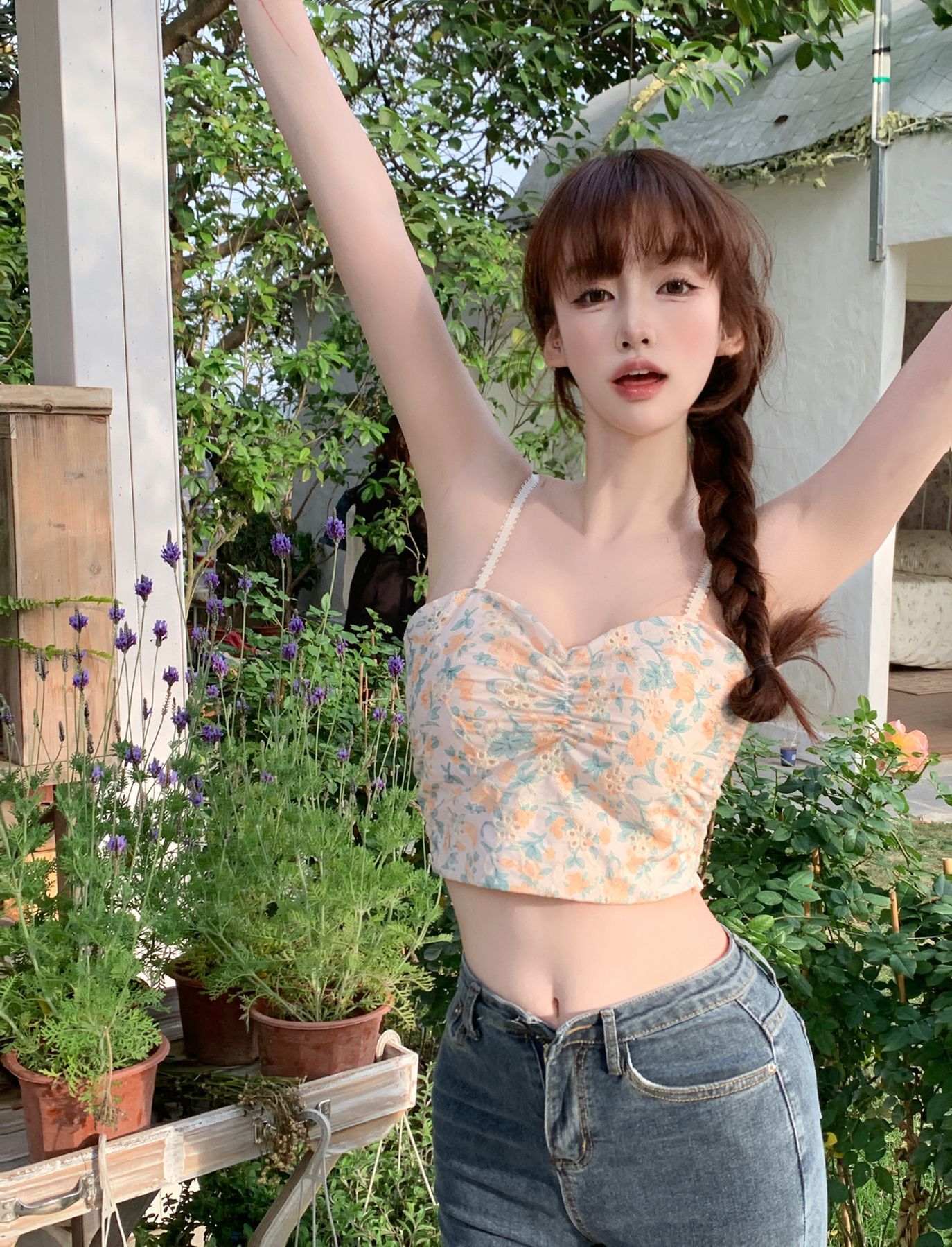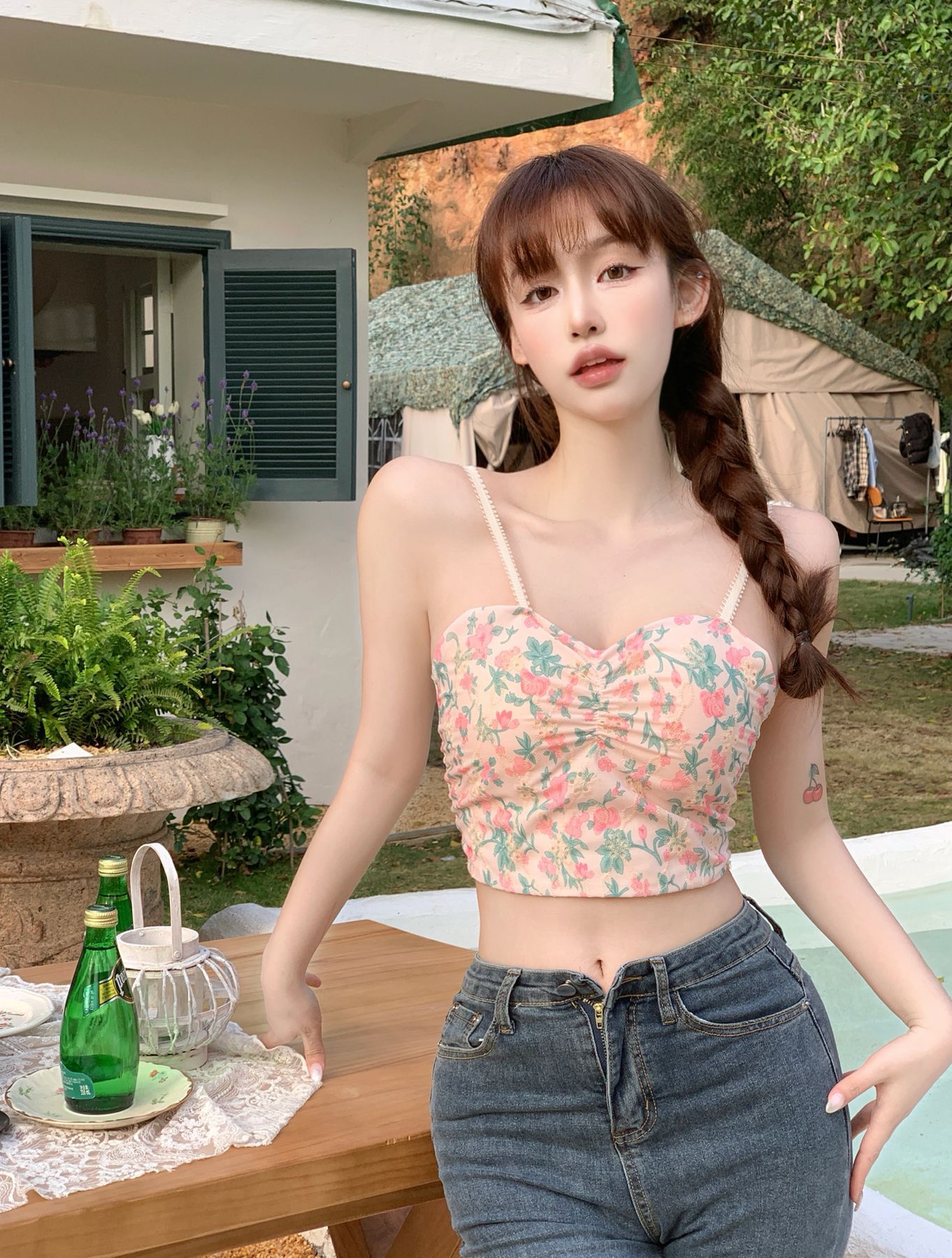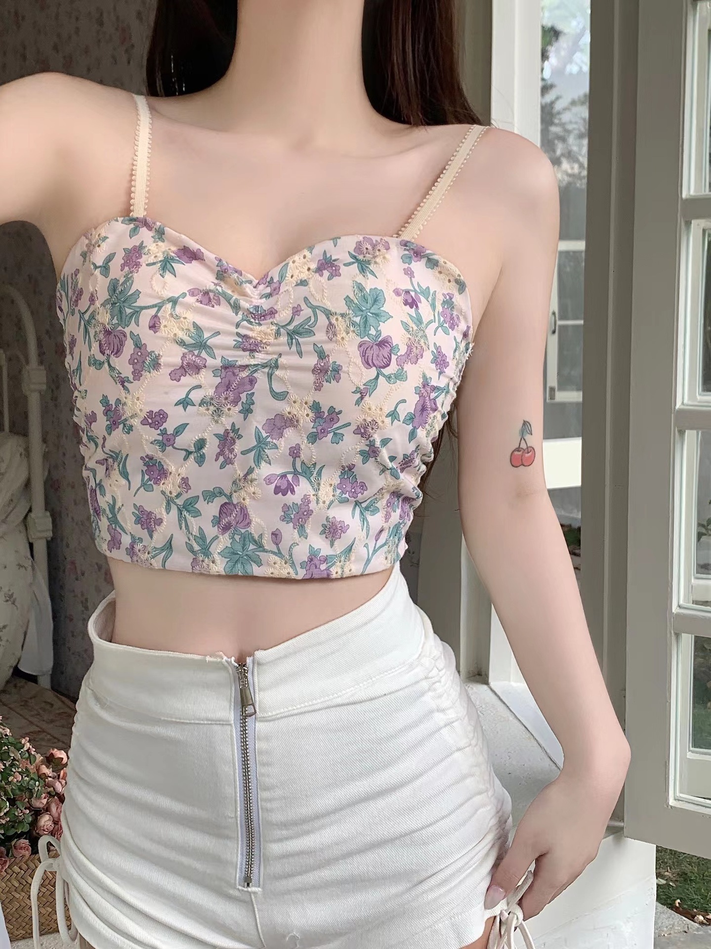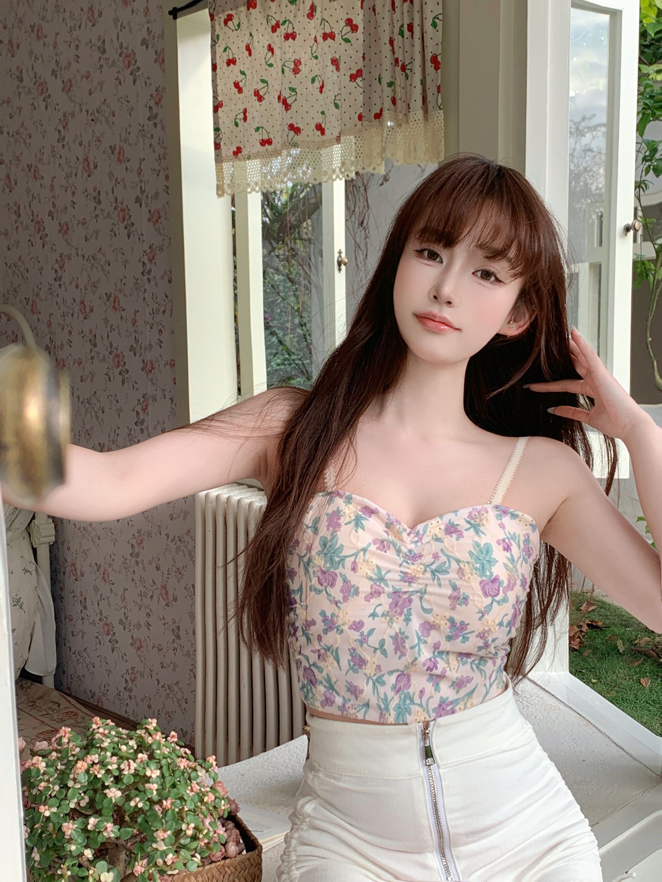 프랑스 스타일 작은 꽃 아름다운 등 슬링 조끼 여성용 벨트 가슴 패드 모든 일치 바닥 튜브 탑 여름 섹시한 달콤한 탑