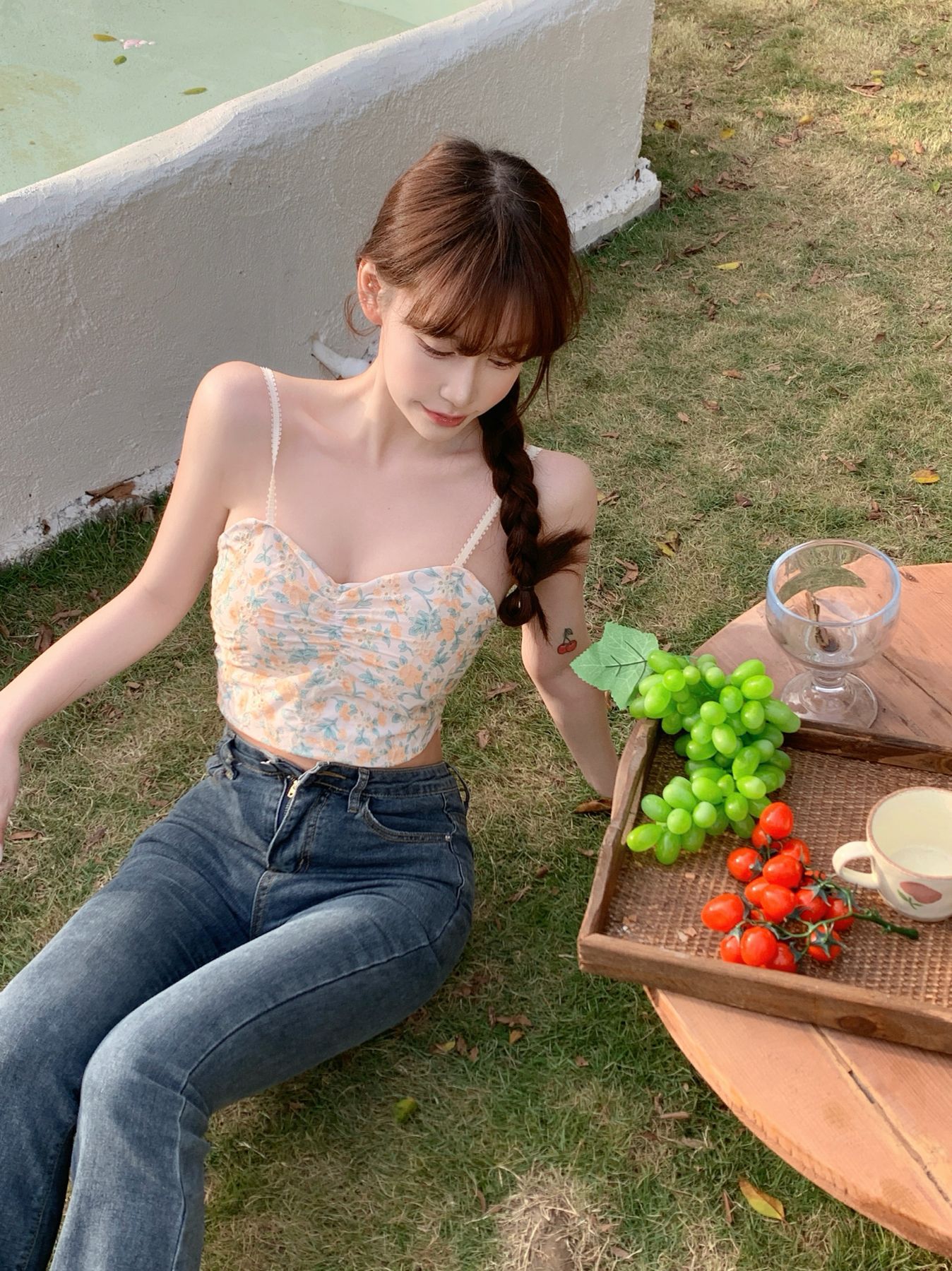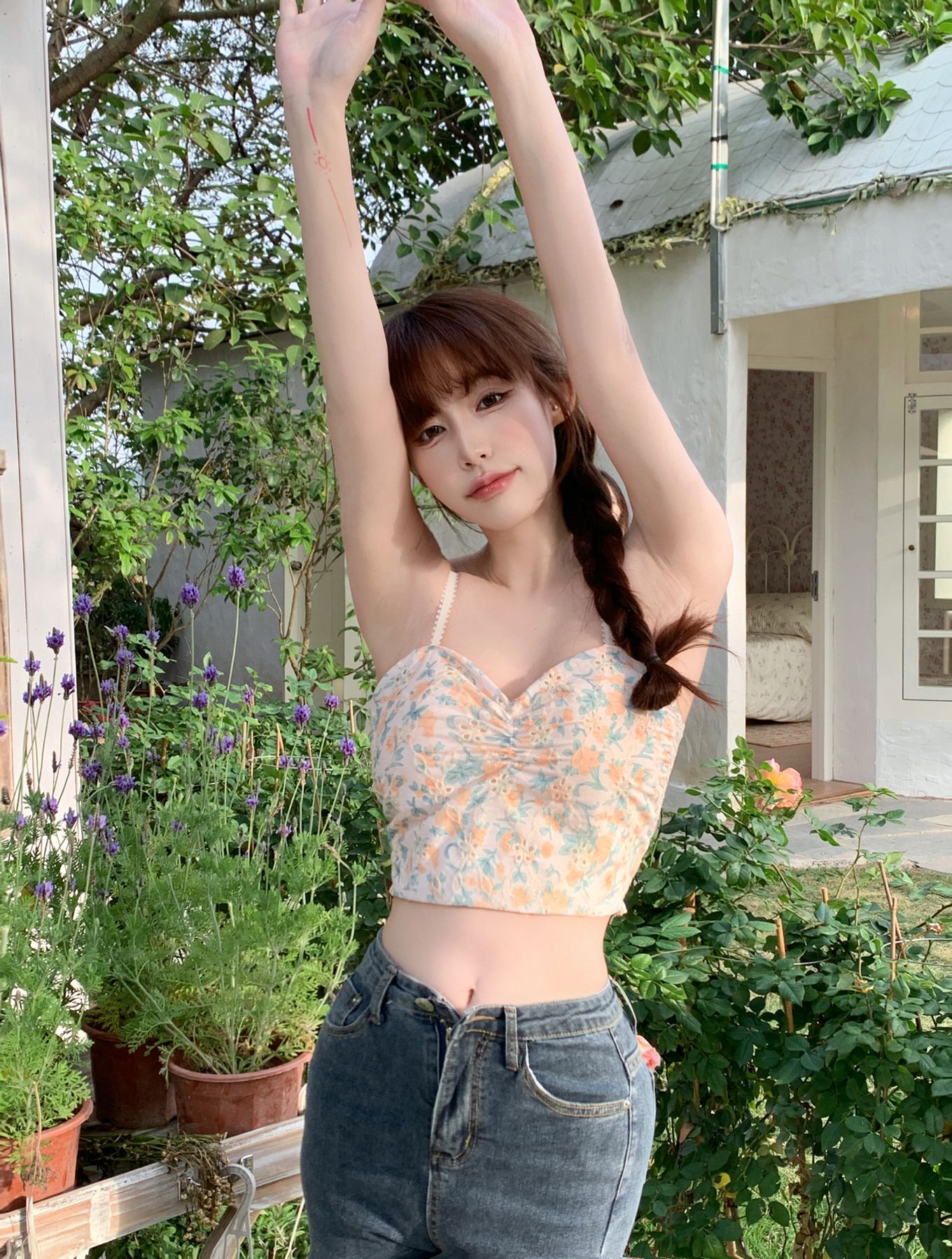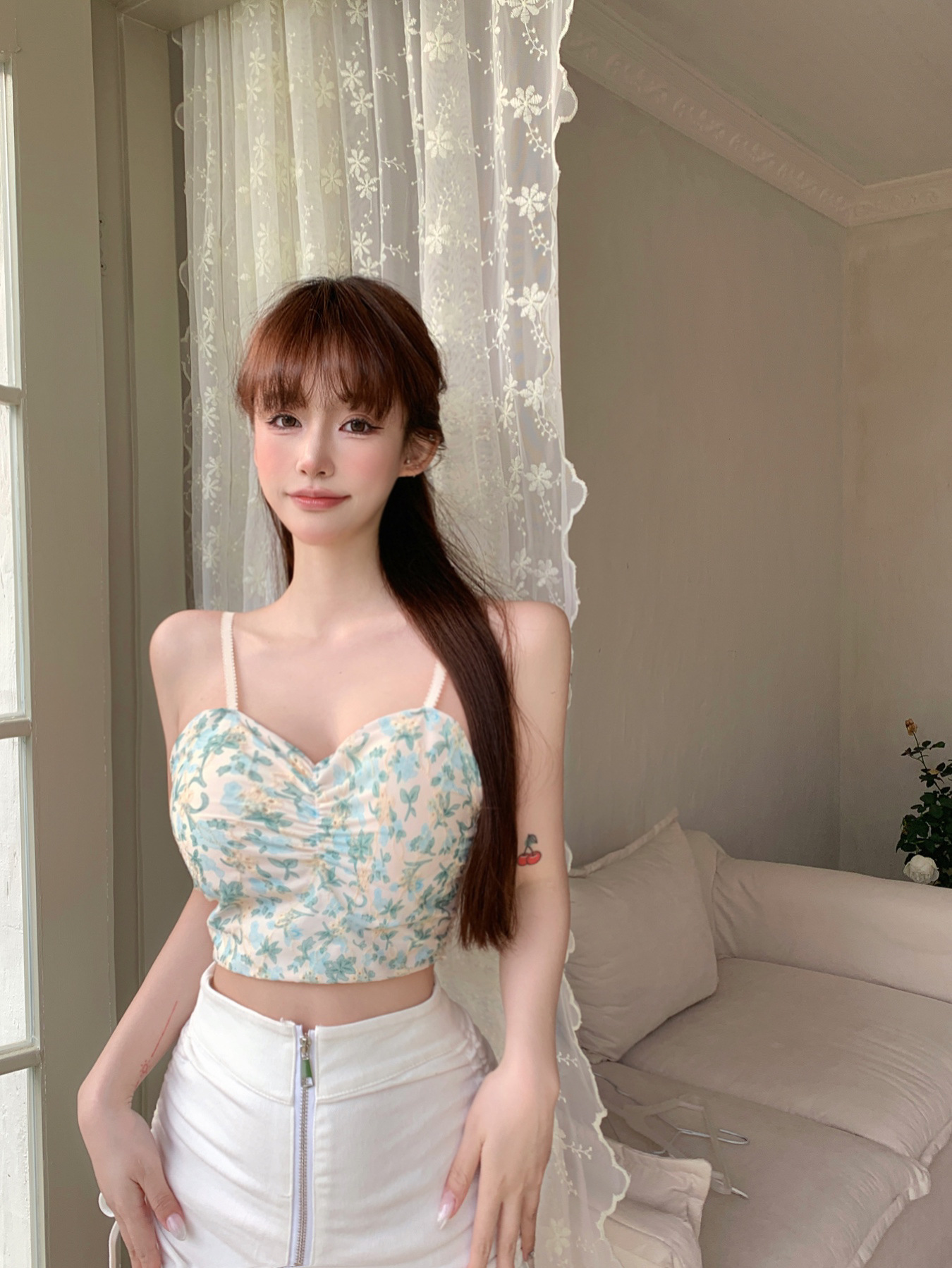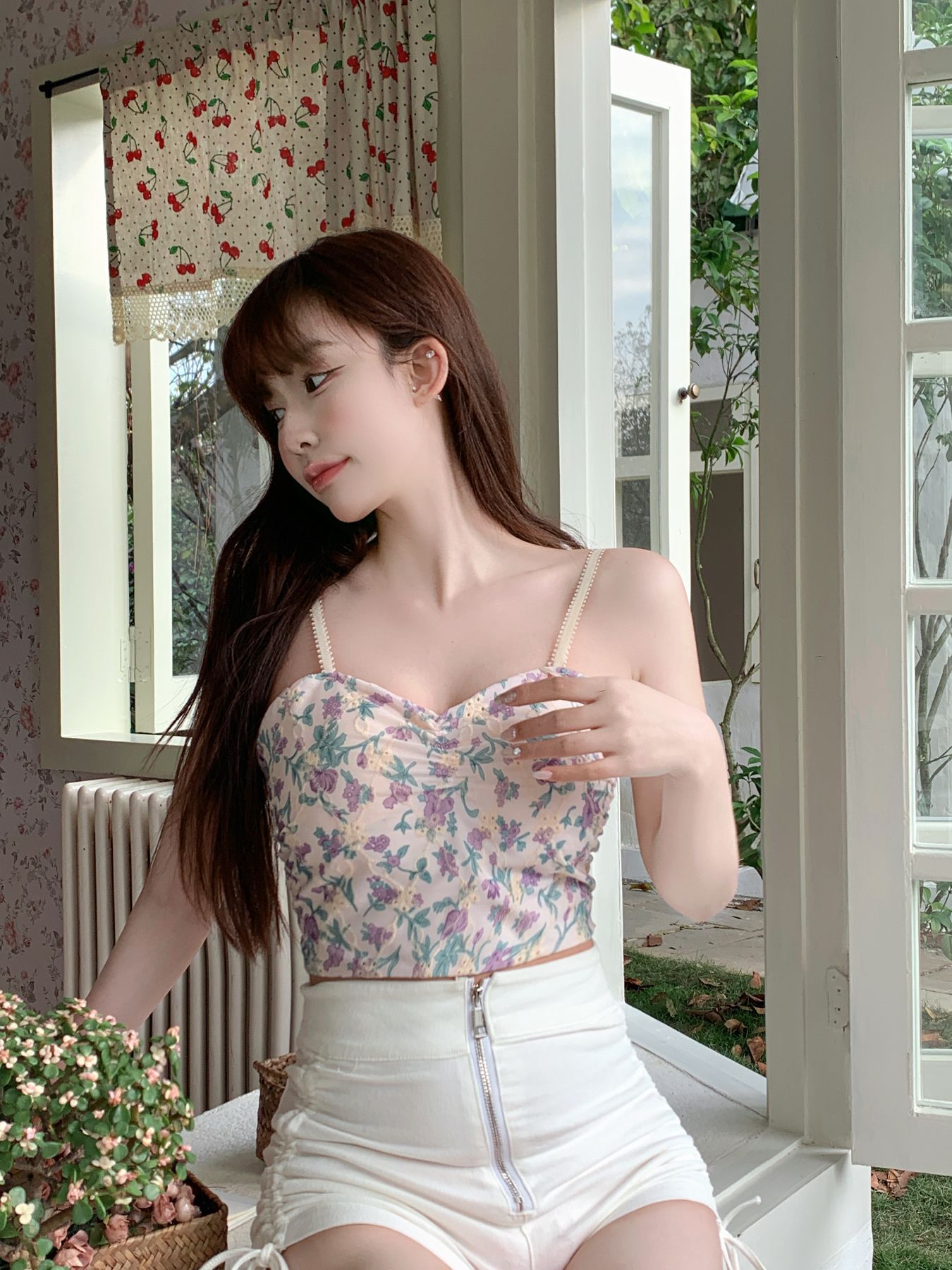 프랑스 스타일 작은 꽃 아름다운 등 슬링 조끼 여성용 벨트 가슴 패드 모든 일치 바닥 튜브 탑 여름 섹시한 달콤한 탑