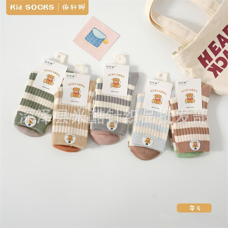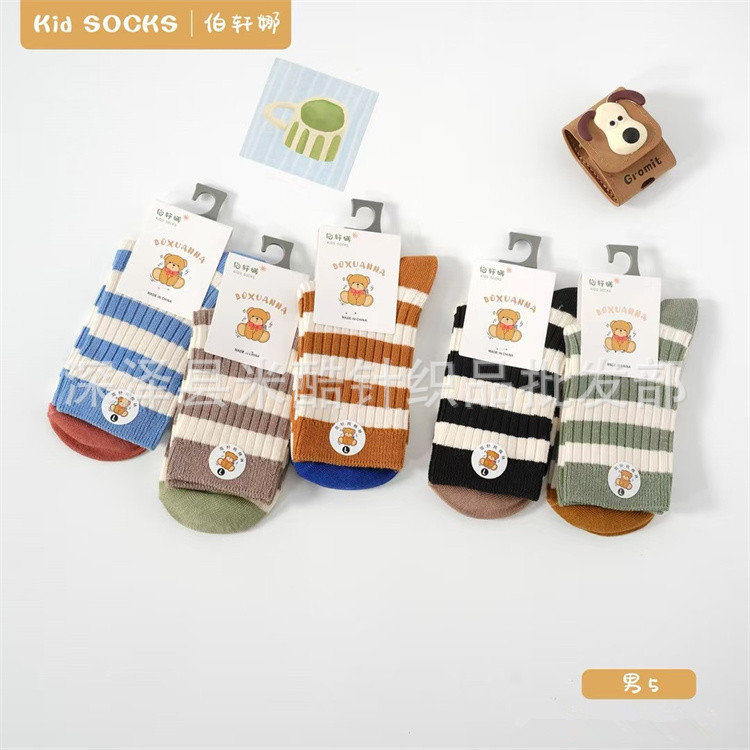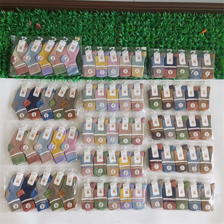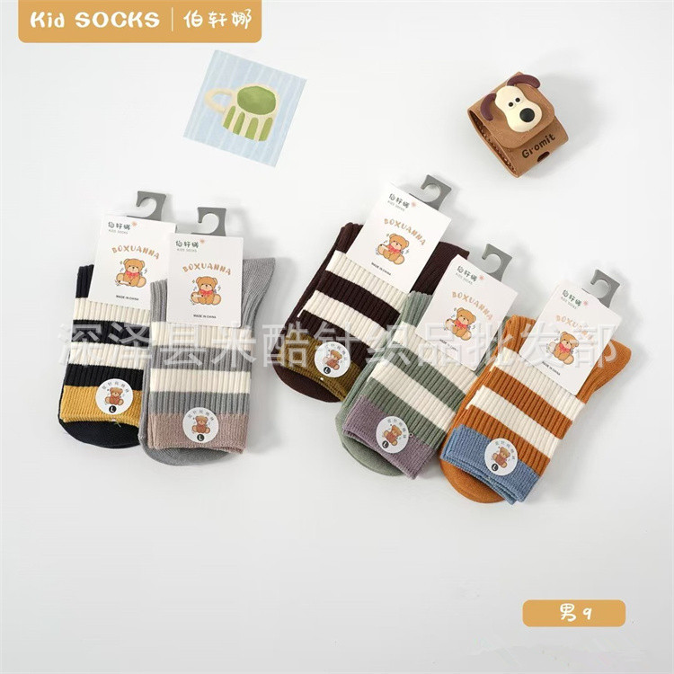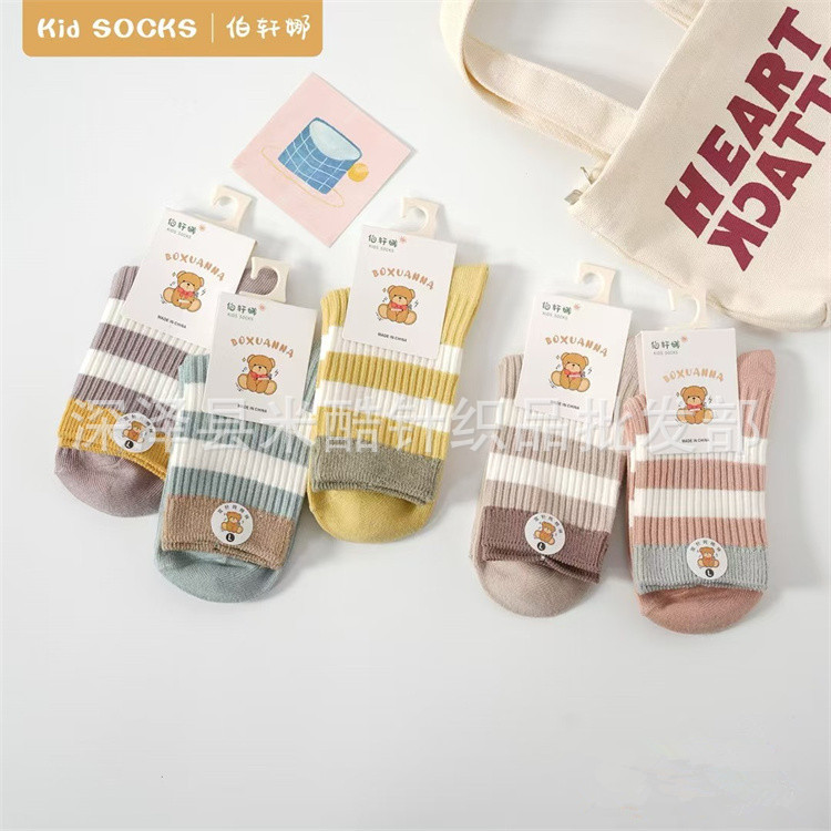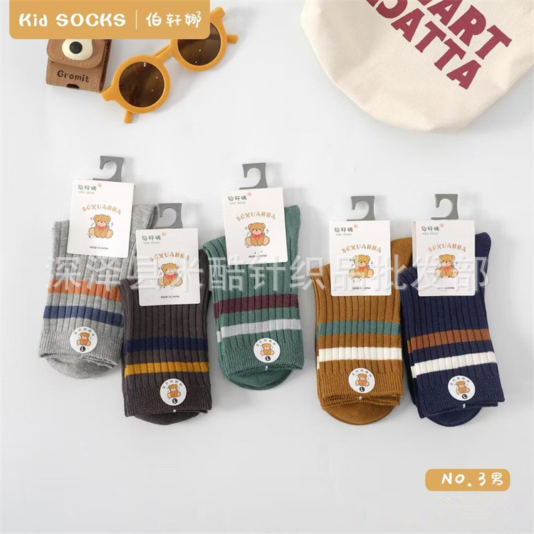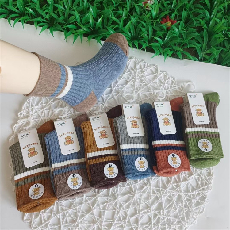 어린이 가을 겨울 신상품 이중 바늘 두꺼운 중간 길이 면 양말 배색 줄무늬 남녀 아기 양말 도매 공급스토어 가기