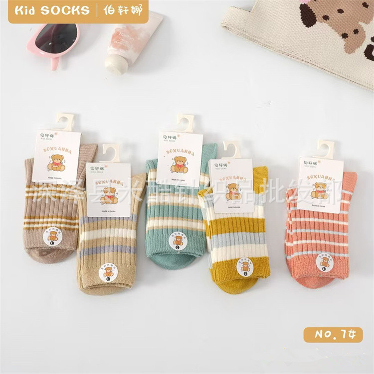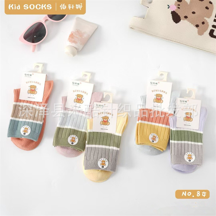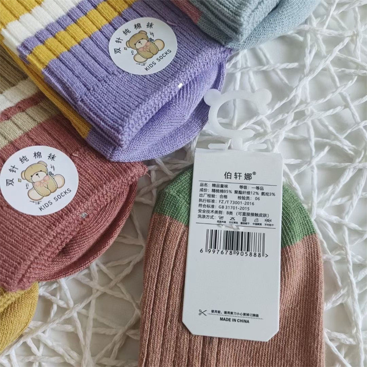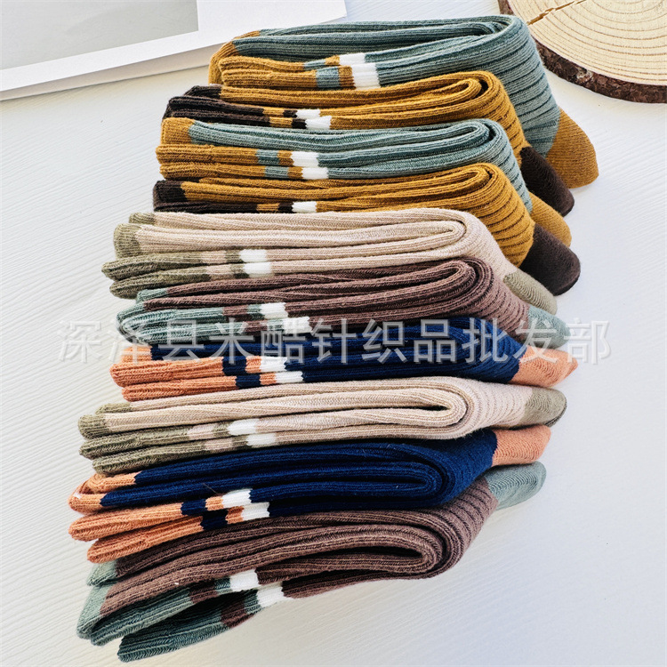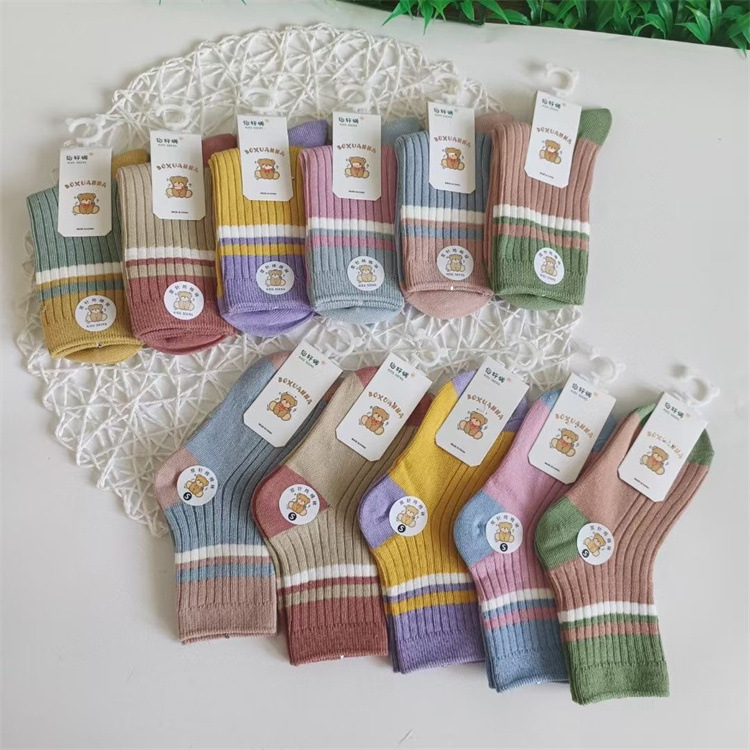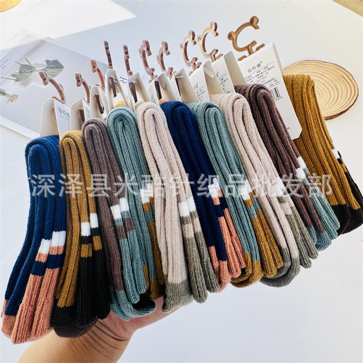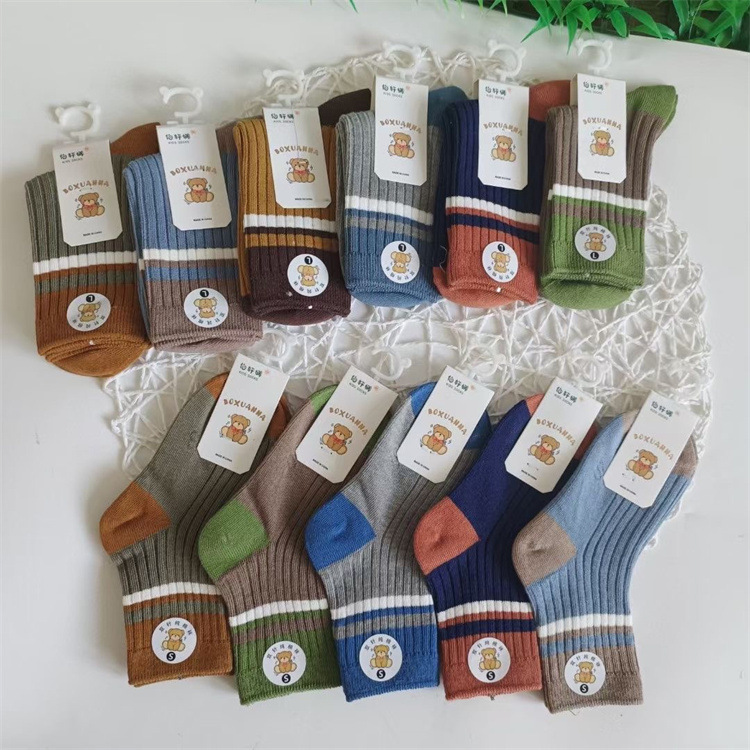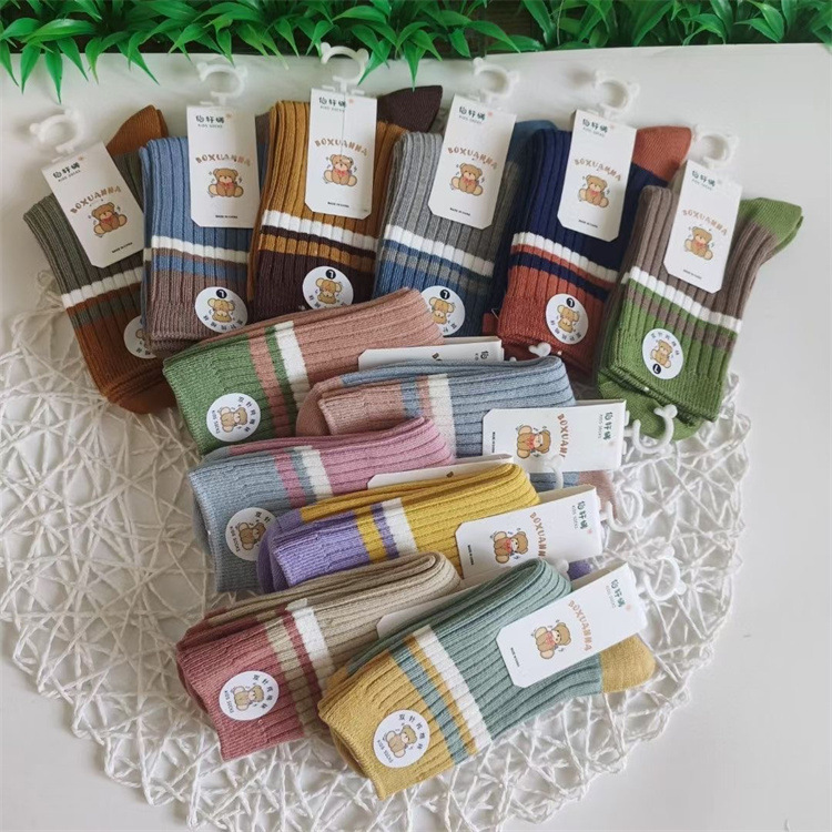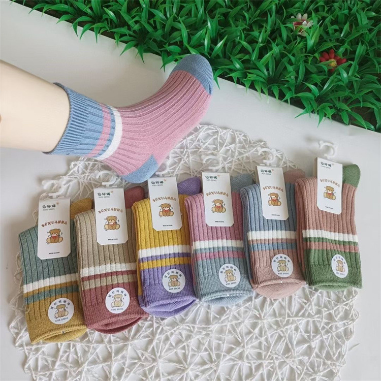 어린이 가을 겨울 신상품 이중 바늘 두꺼운 중간 길이 면 양말 배색 줄무늬 남녀 아기 양말 도매 공급
