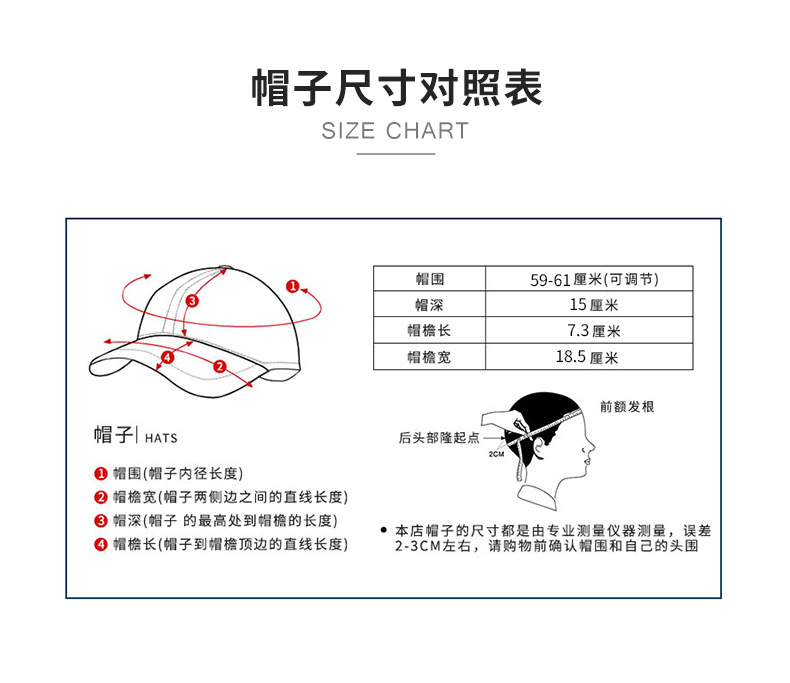产品尺寸帽檐长7.3cm,帽檐宽18.5cm重 量约100g