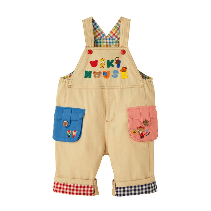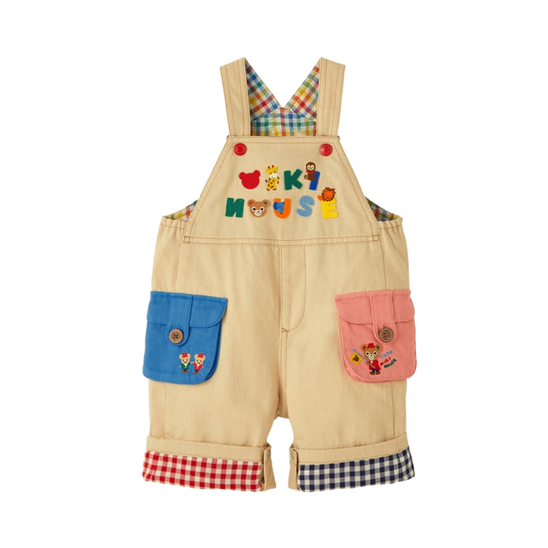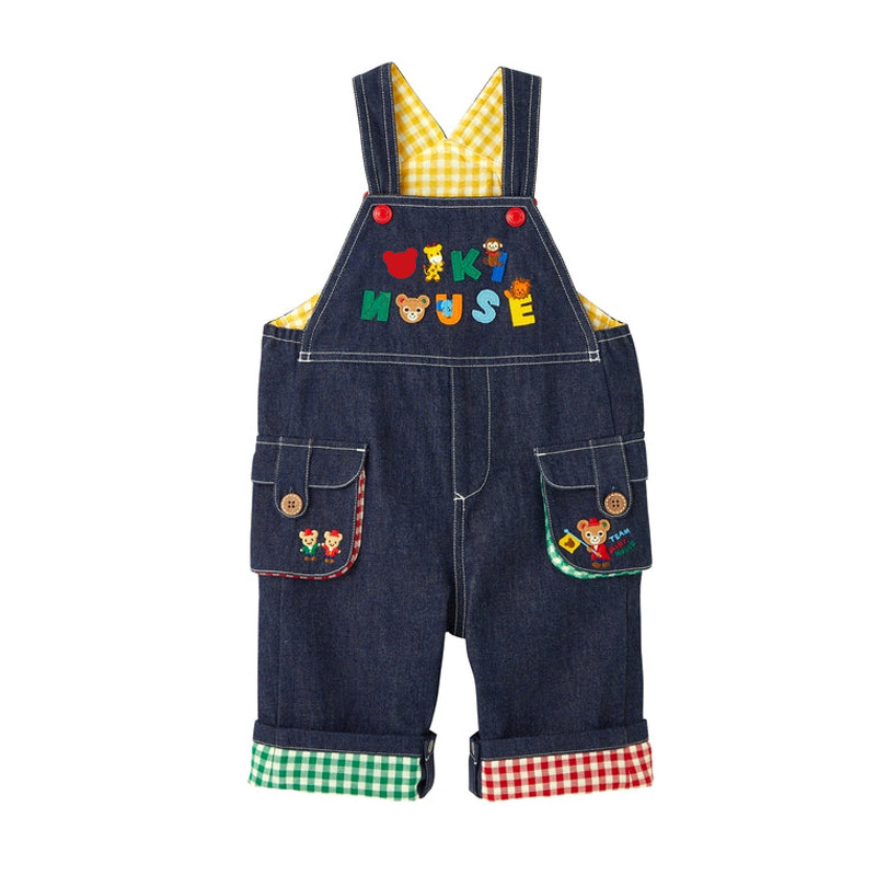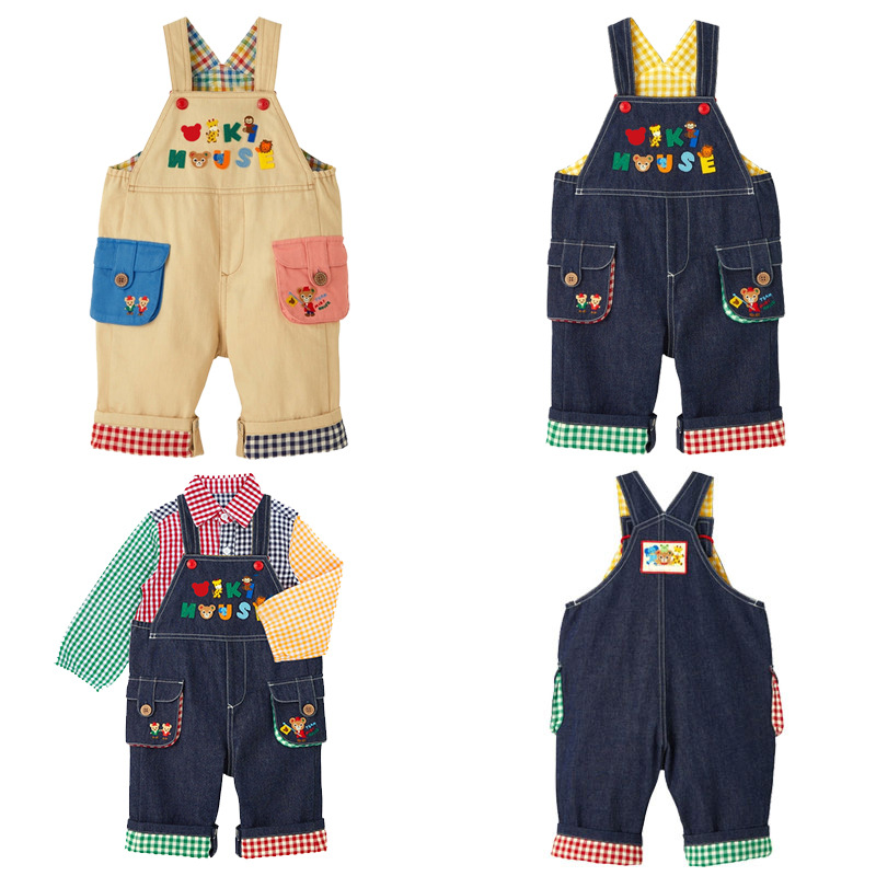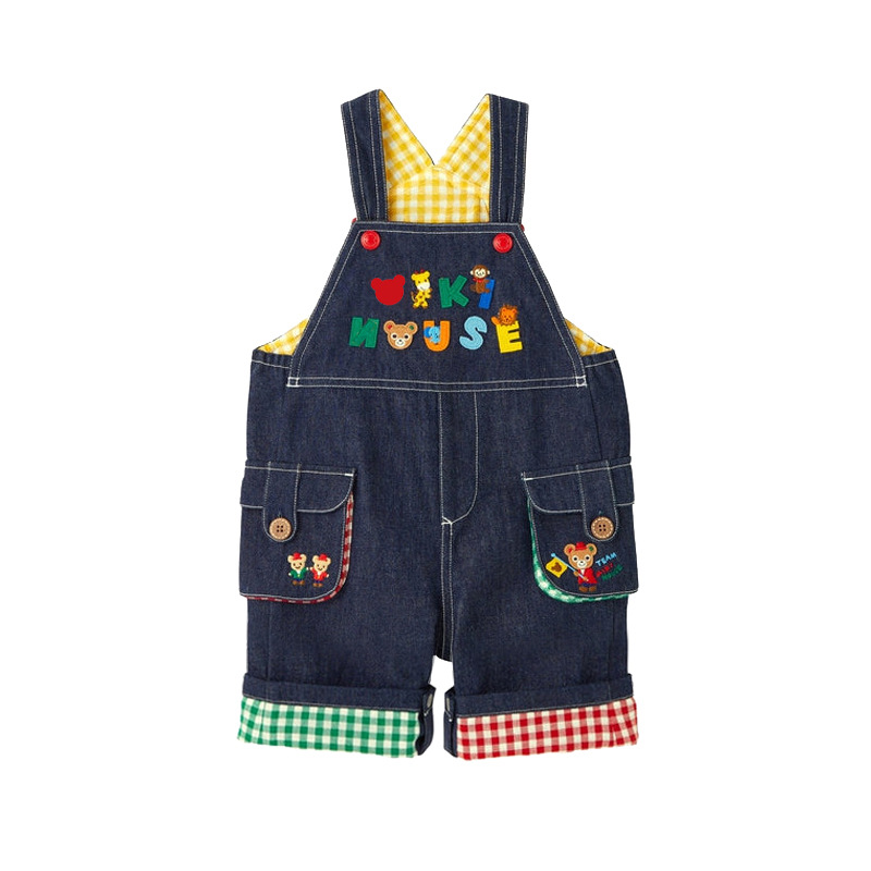 아기 데님 멜빵바지 어린이 만화 곰 레터 패치 컬러풀 체크무늬 멜빵바지 긴바지 도매스토어 가기