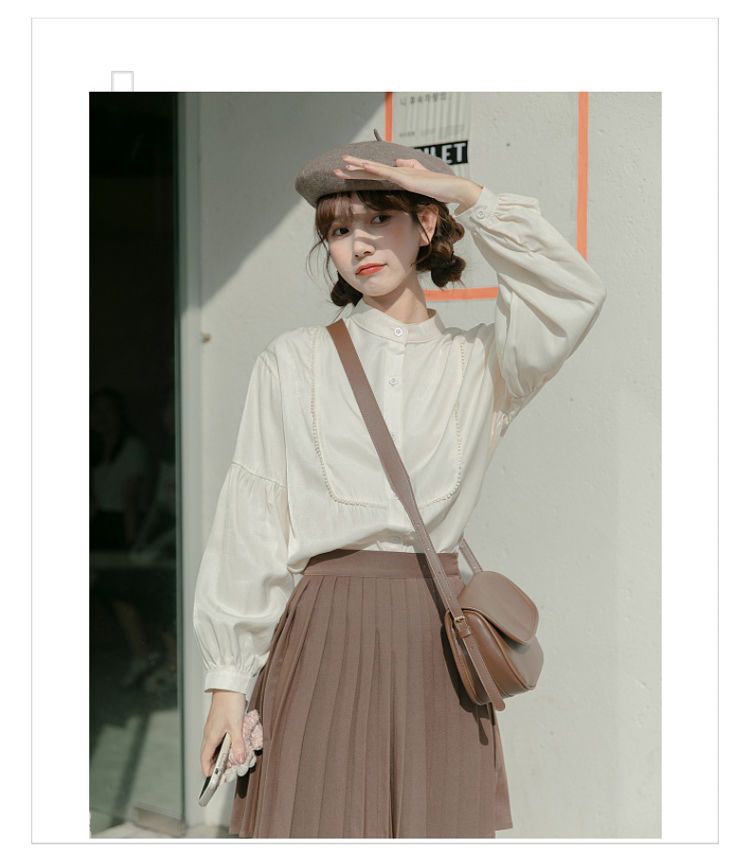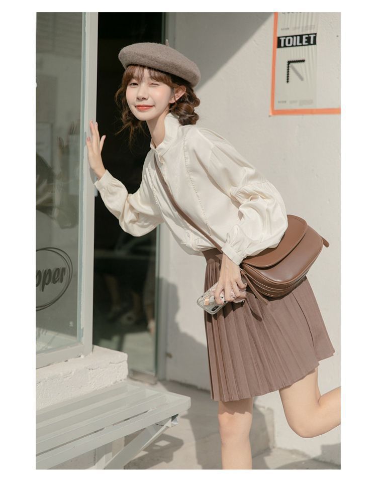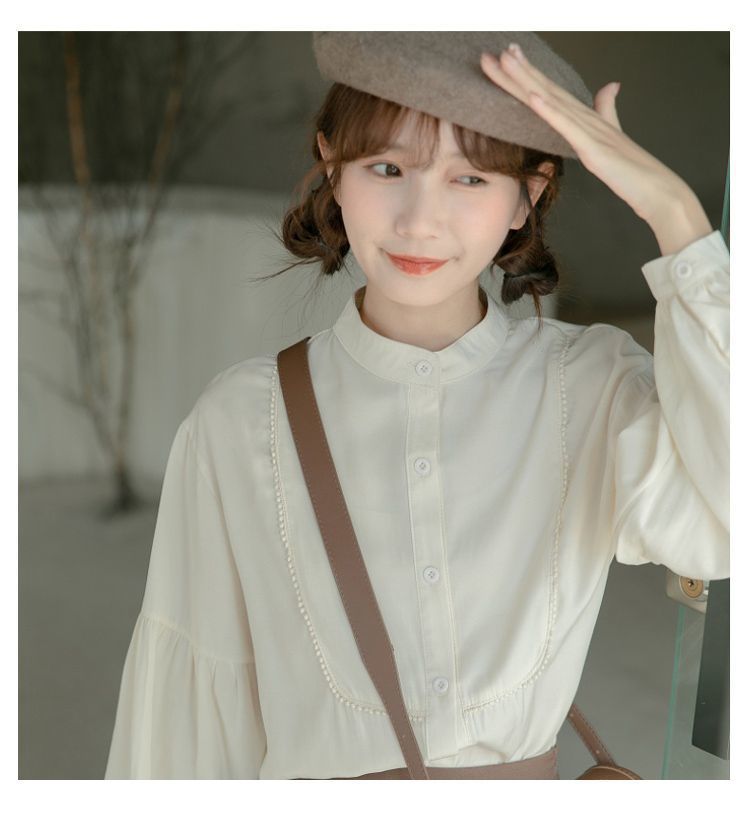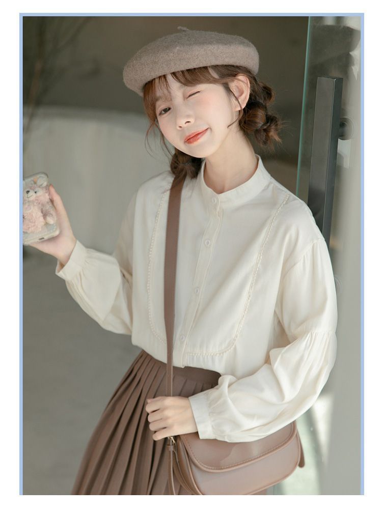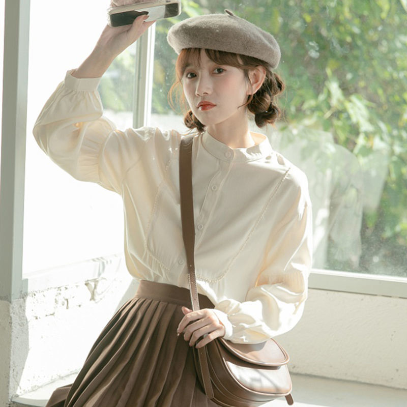스탠드 칼라 셔츠 여성 디자인 느슨한 긴팔 셔츠 2025 새로운 봄, 가을 프랑스 학생 랜턴 슬리브 탑스토어 가기