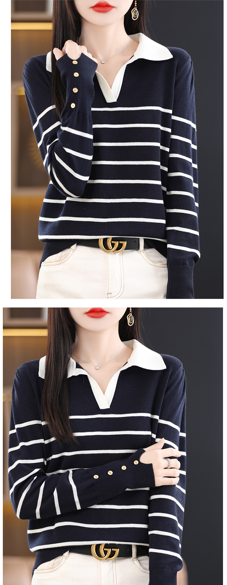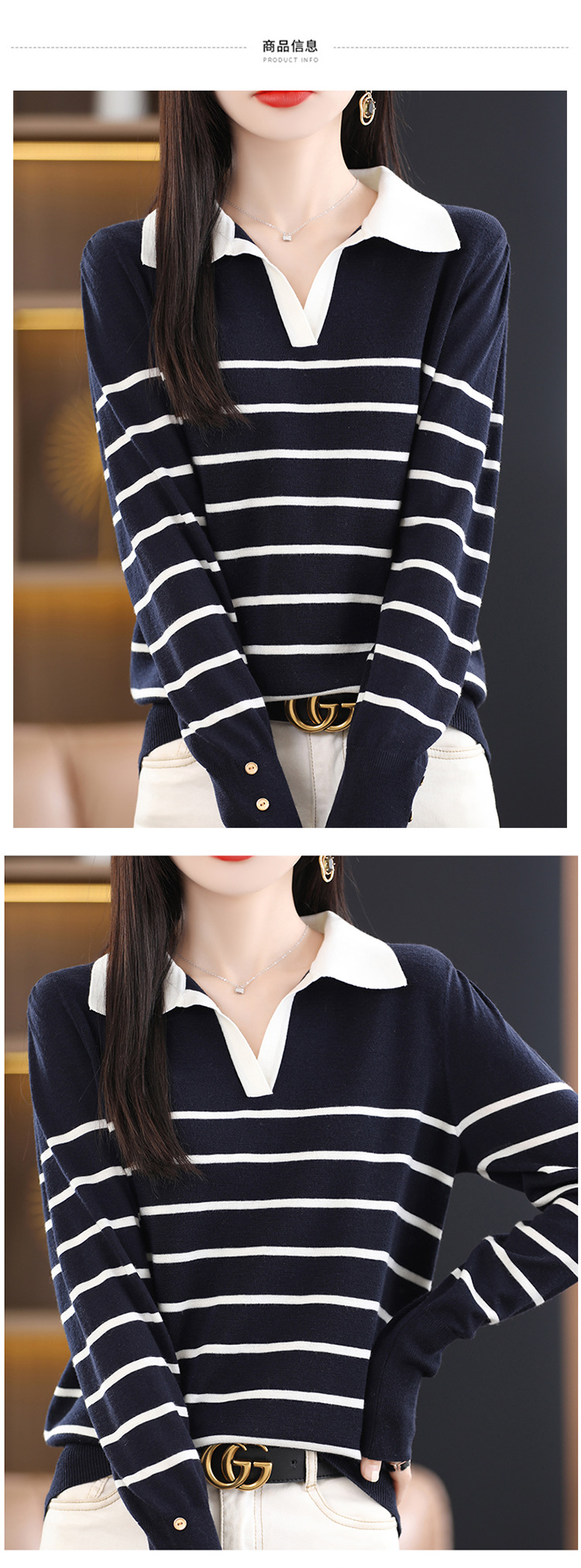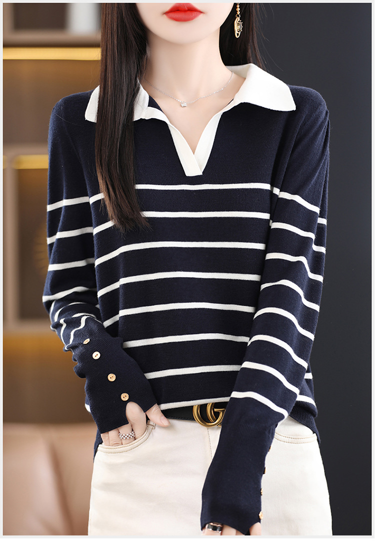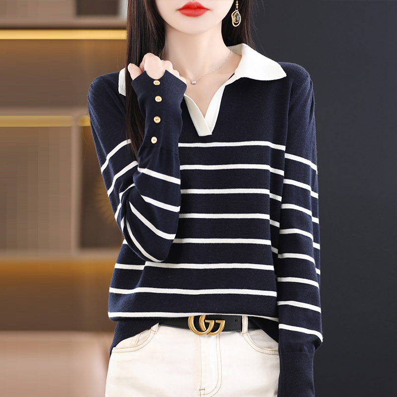 봄 2023 새로운 한국식 네이비 스타일 스웨터 스트라이프 에이지 감소 하프 오픈 칼라 울 스웨터 긴팔