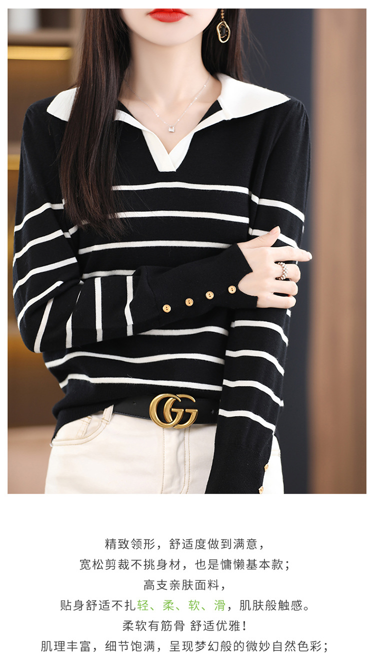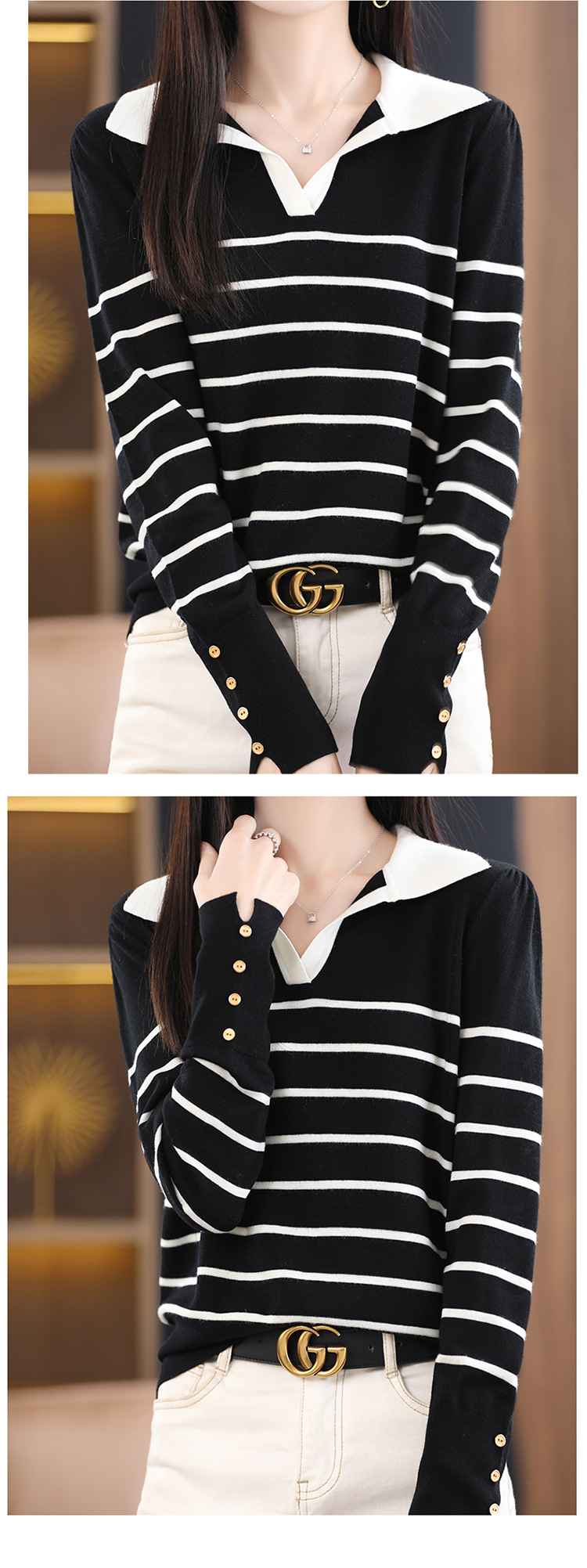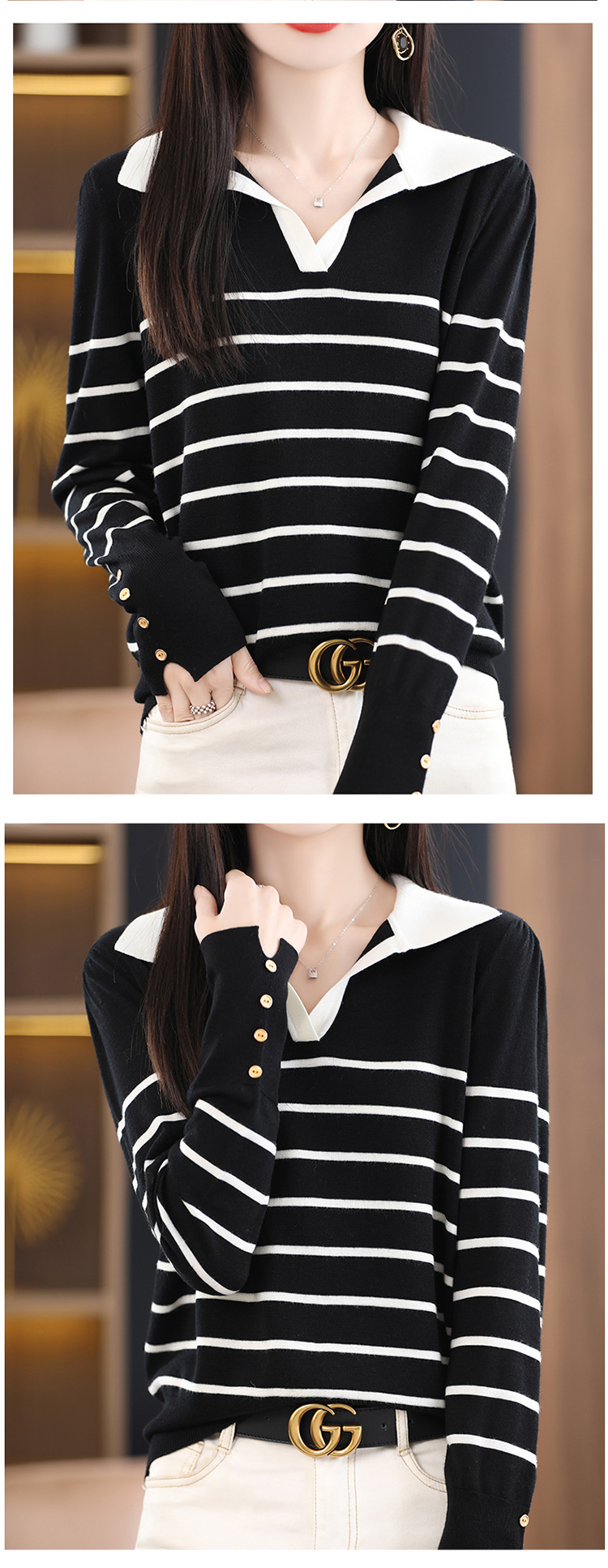 봄 2023 새로운 한국식 네이비 스타일 스웨터 스트라이프 에이지 감소 하프 오픈 칼라 울 스웨터 긴팔