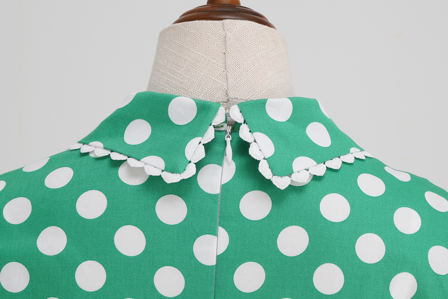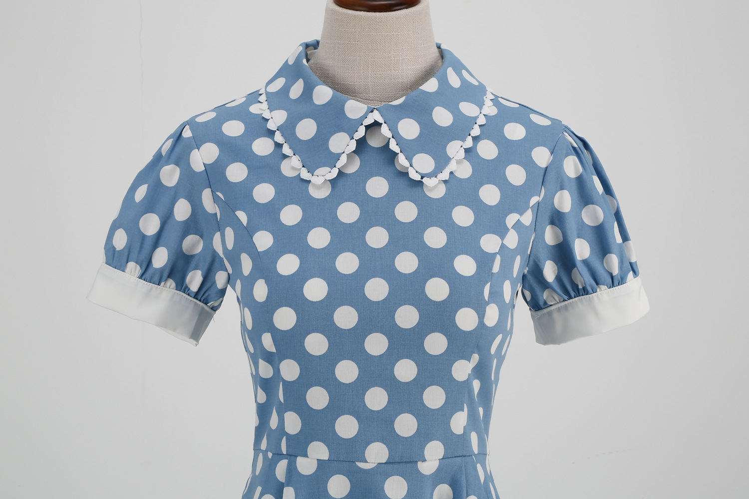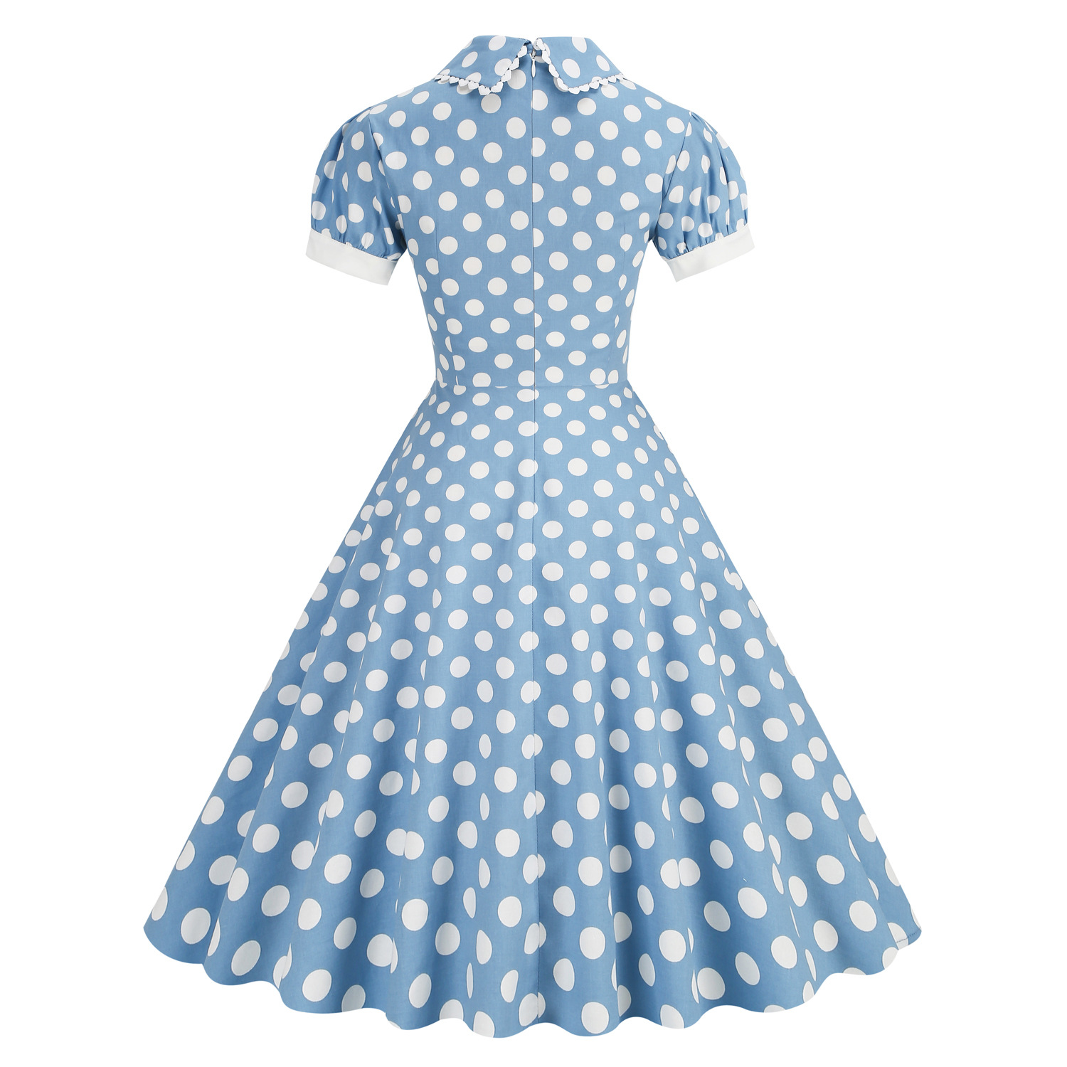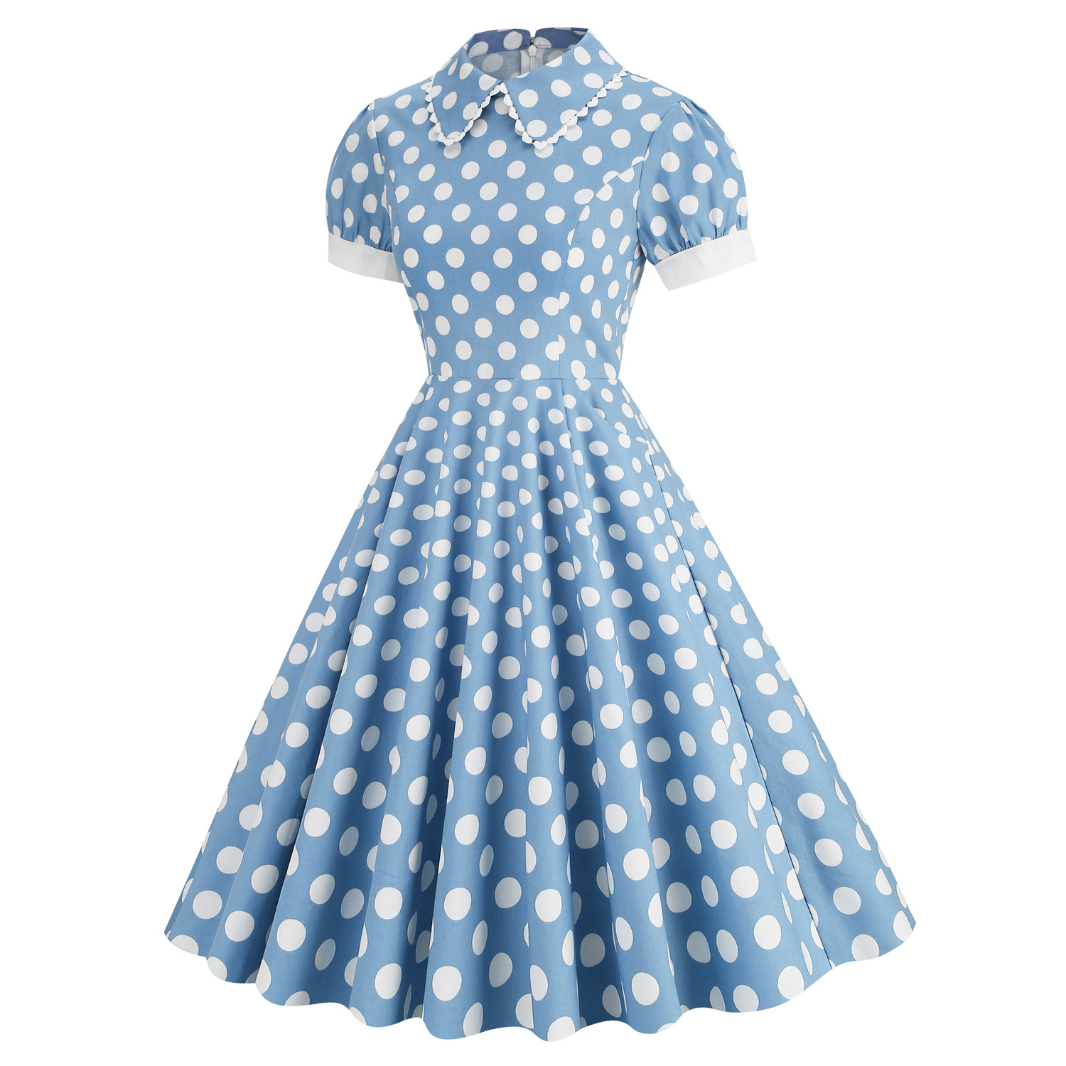 햅번 스타일 복고풍 코트 허리 꽉 웨이브 도트 인형 칼라 레이스 빛 원피스 반팔 의상 대형 원피스 여성스토어 가기