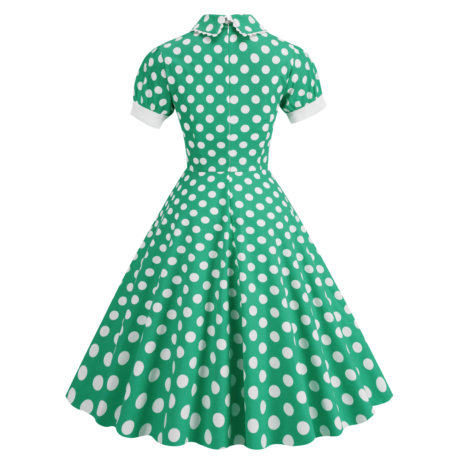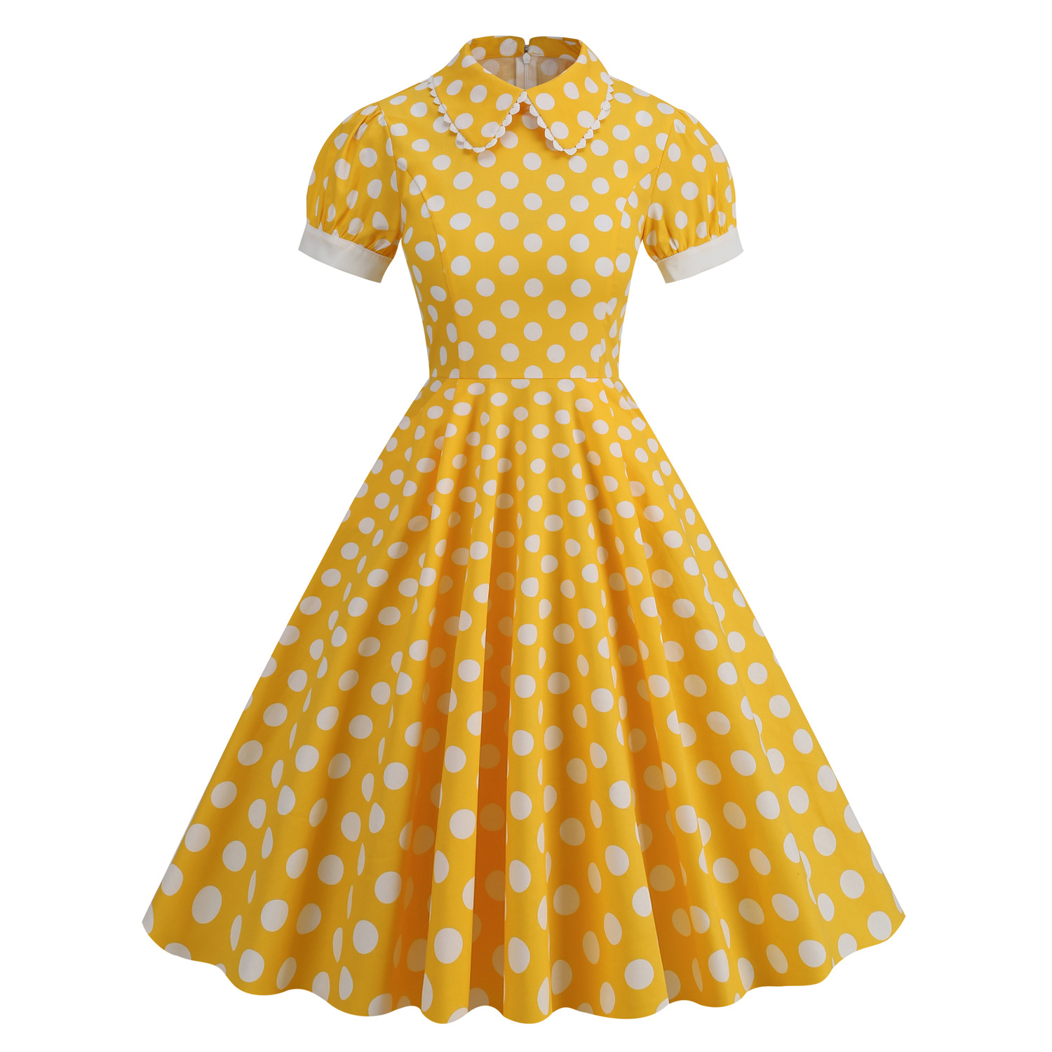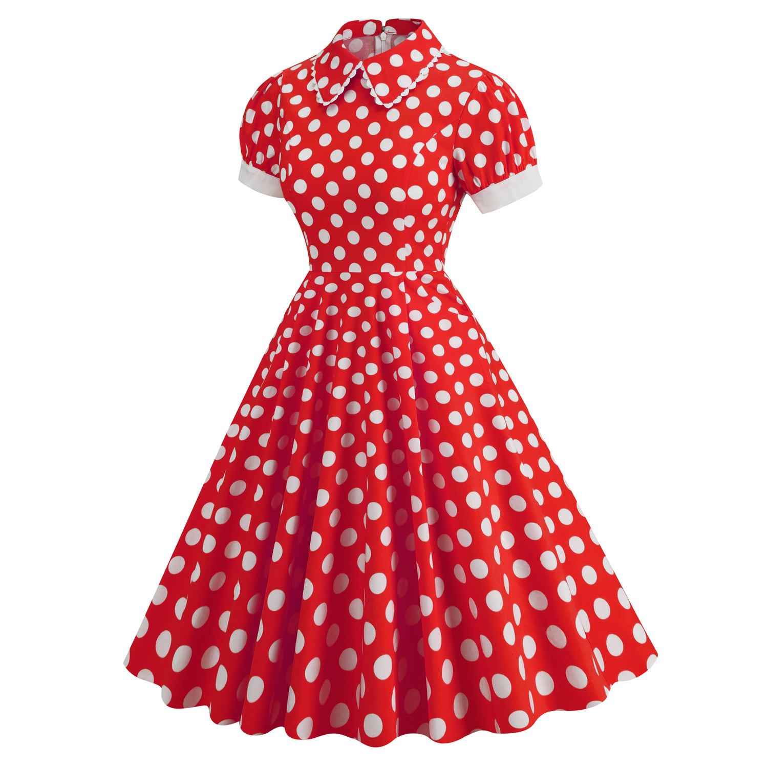 햅번 스타일 복고풍 코트 허리 꽉 웨이브 도트 인형 칼라 레이스 빛 원피스 반팔 의상 대형 원피스 여성