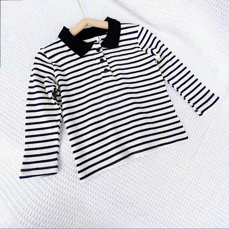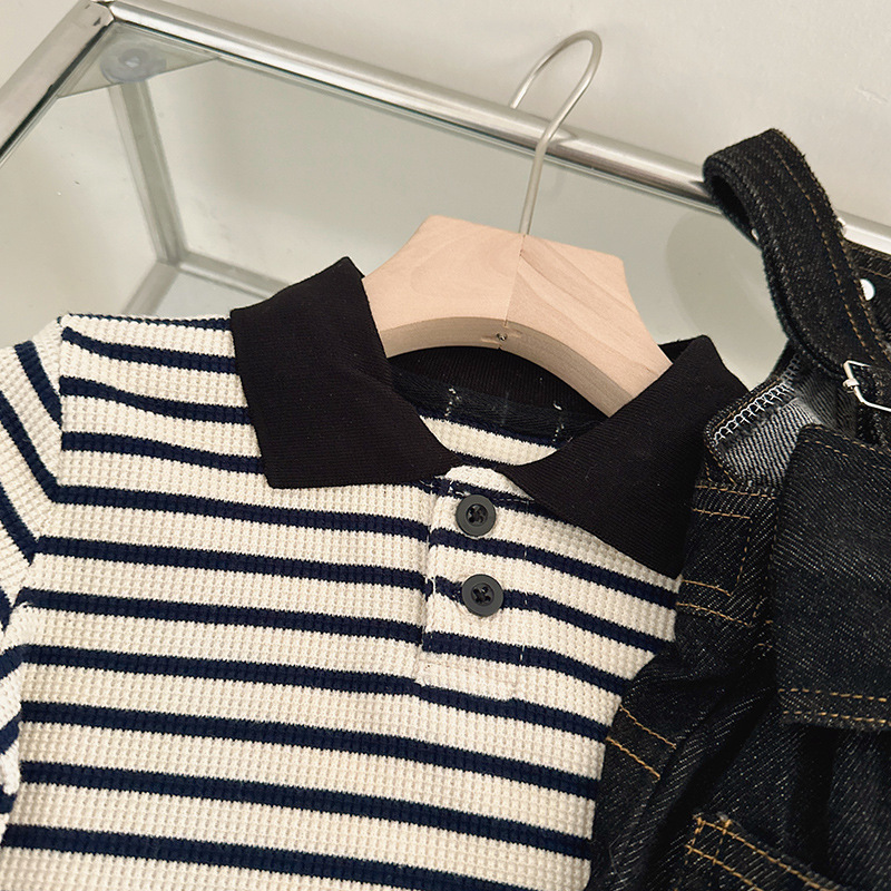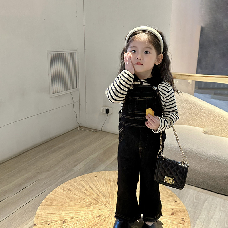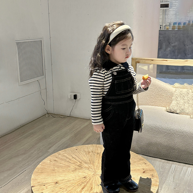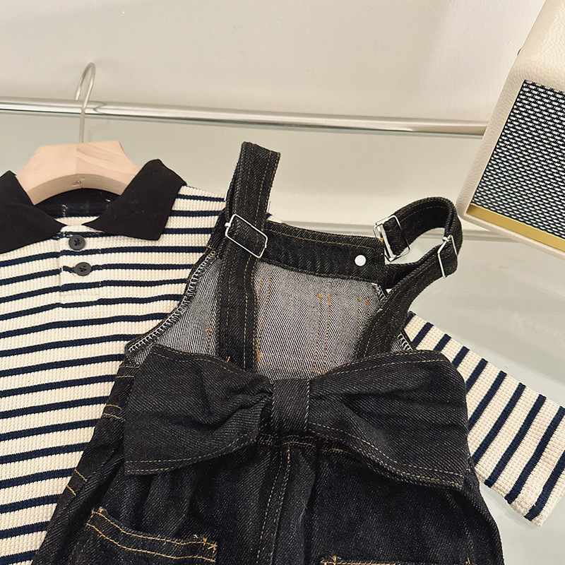 한국 아동복 봄과 가을 아기 소녀의 스플릿 데님 스트랩 바지 여아 스트라이프 폴로 셔츠 긴 소매 어린이 투피스 세트