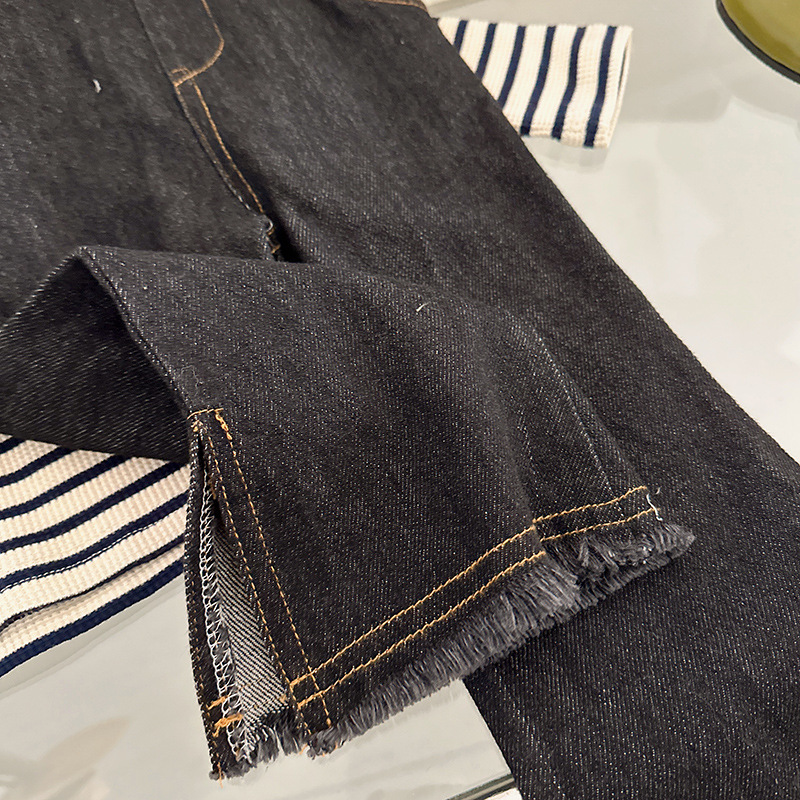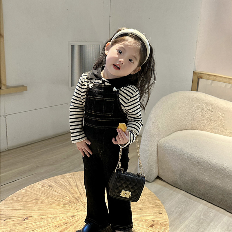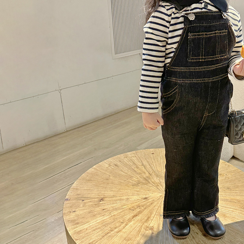 한국 아동복 봄과 가을 아기 소녀의 스플릿 데님 스트랩 바지 여아 스트라이프 폴로 셔츠 긴 소매 어린이 투피스 세트스토어 가기