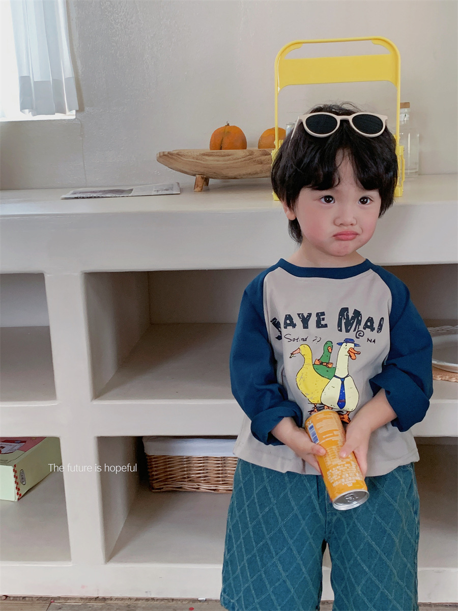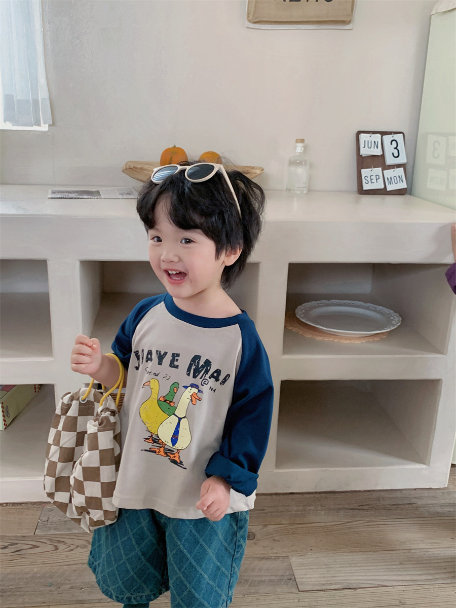 Jiaye 어린이 제품 2025 어린이 봄 라글란 슬리브 만화 프린트 티셔츠 소년과 소녀를위한 세련된 긴팔 바닥 셔츠