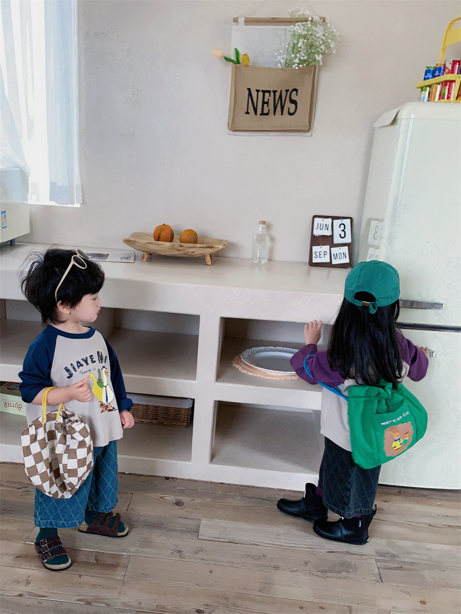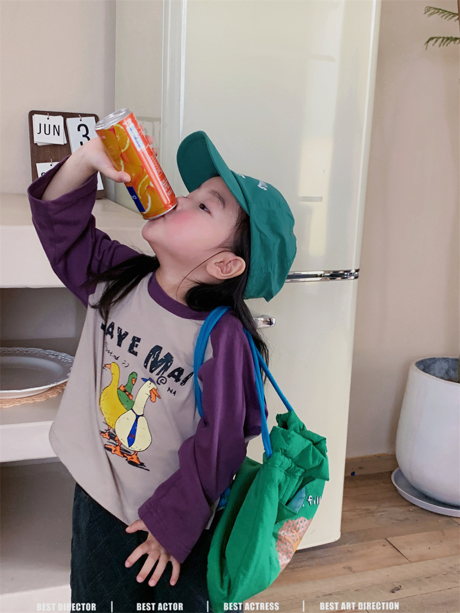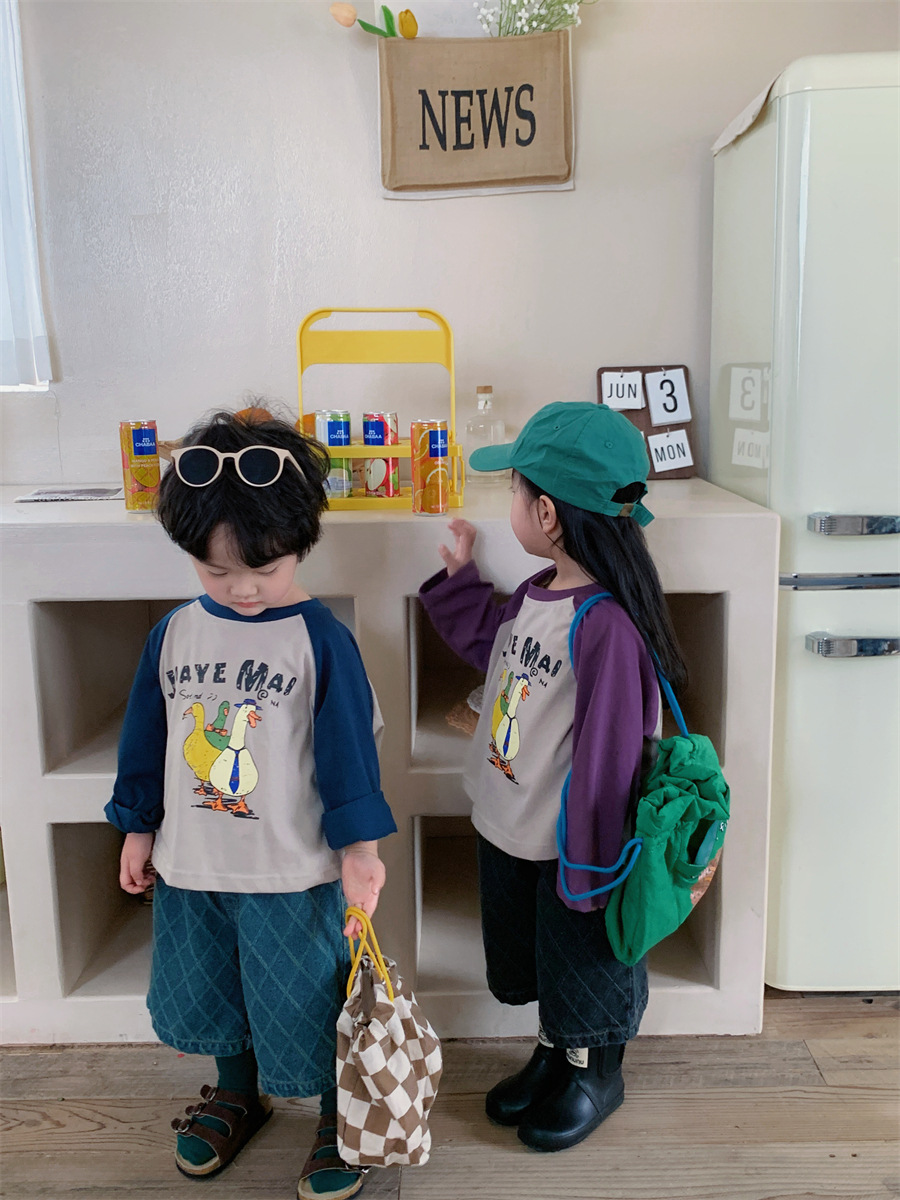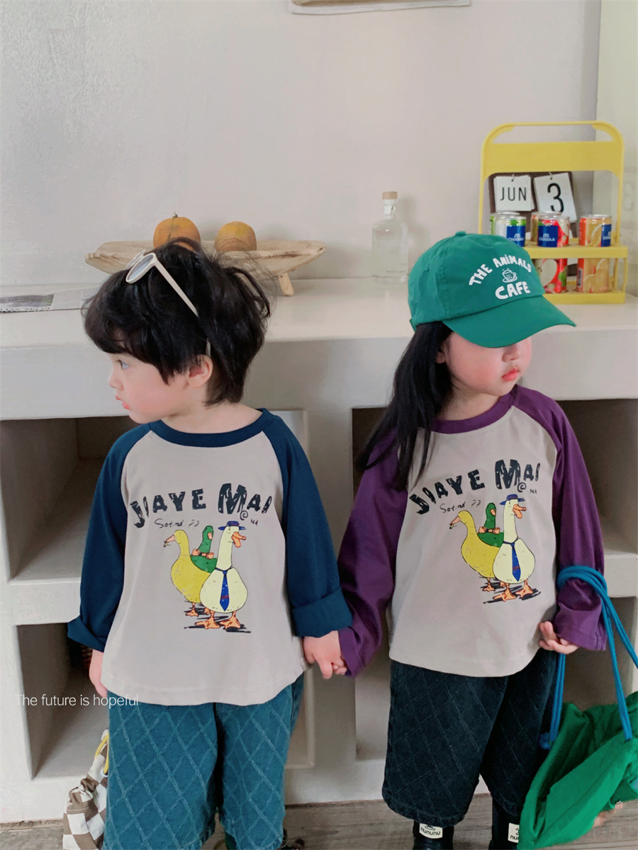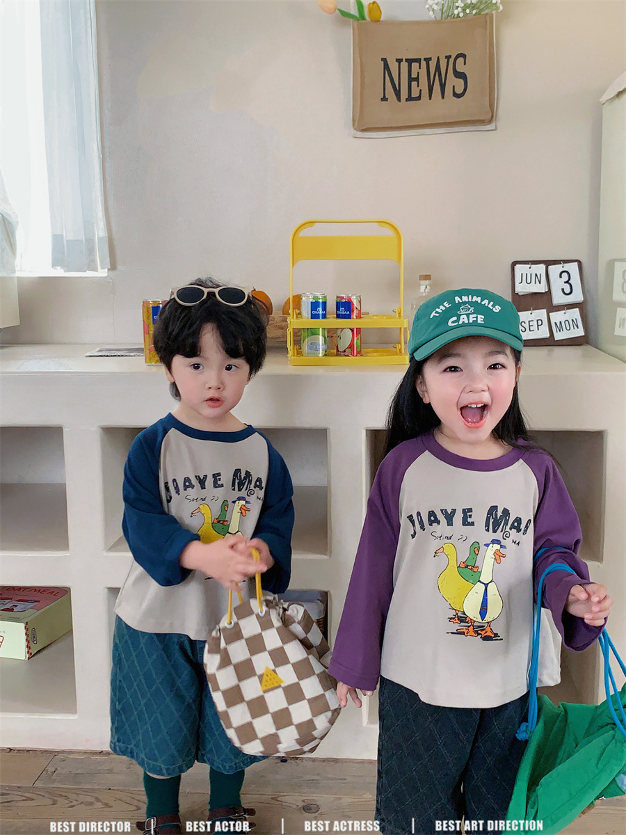Jiaye 어린이 제품 2025 어린이 봄 라글란 슬리브 만화 프린트 티셔츠 소년과 소녀를위한 세련된 긴팔 바닥 셔츠스토어 가기