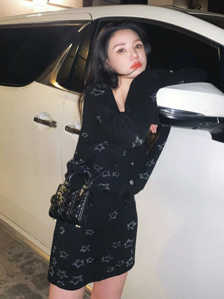 2160 Haiye 별이 빛나는 블랙 니트 원피스 여자의 2023 봄 새로운 복고풍 카디건 스커트 투피스 세트스토어 가기