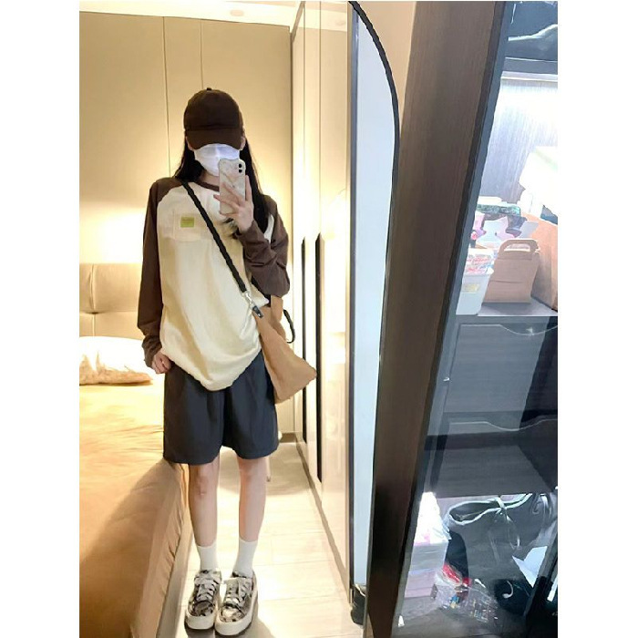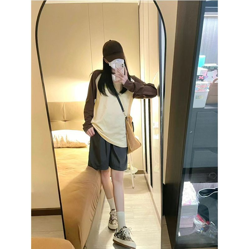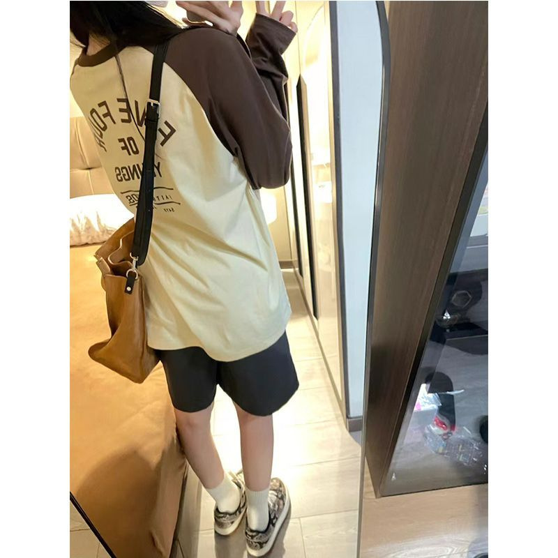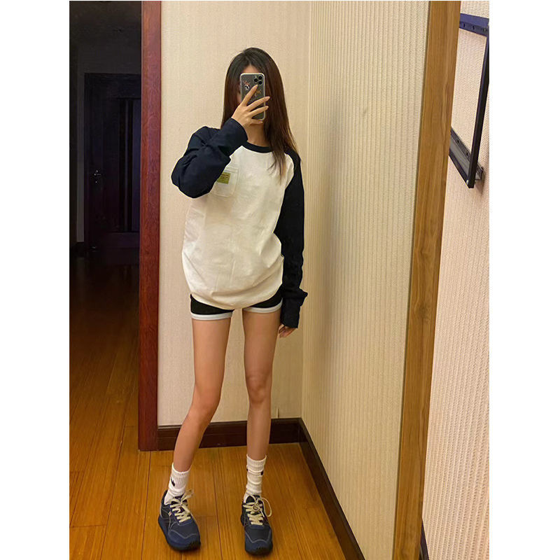 2023 코튼 스티칭 대비 긴팔 티셔츠 여성용 오버사이즈 아메리칸 스타일 레트로 디자인 센스 여성용 느슨한 캐주얼 탑