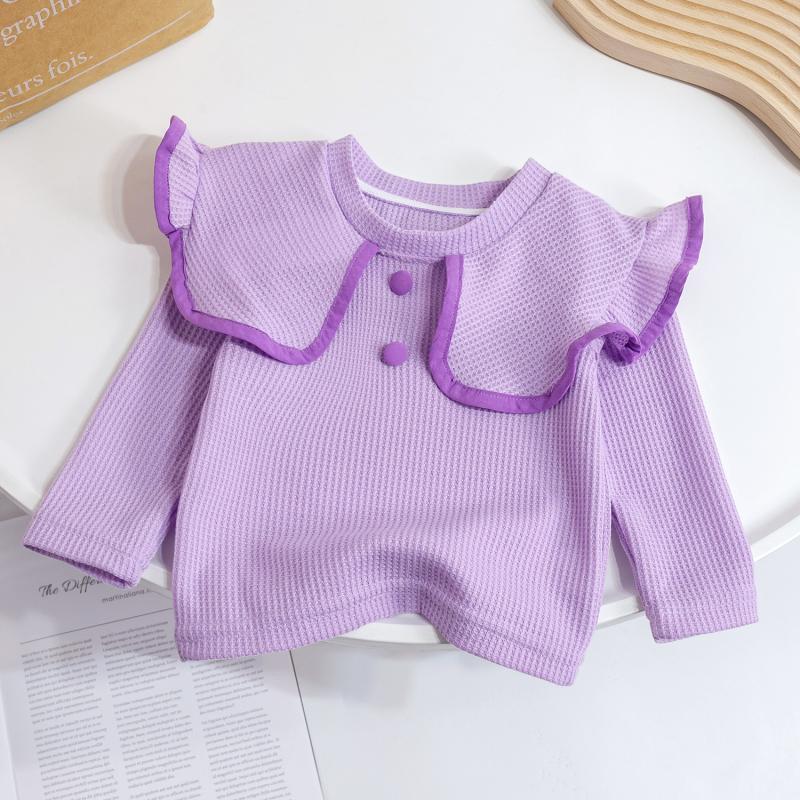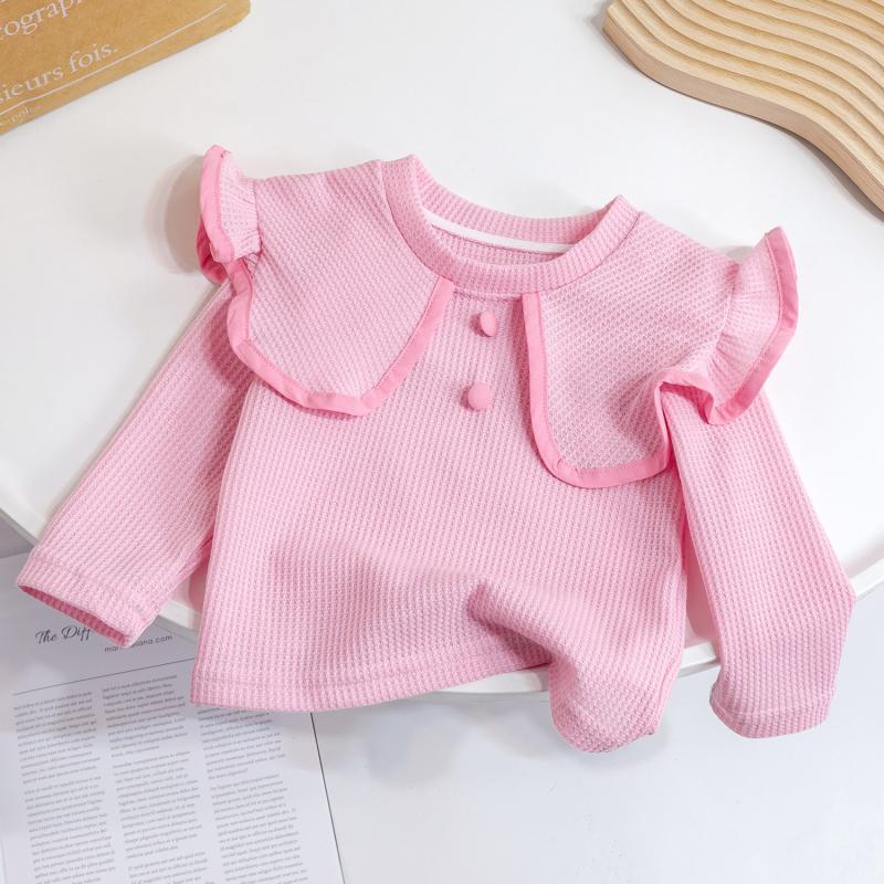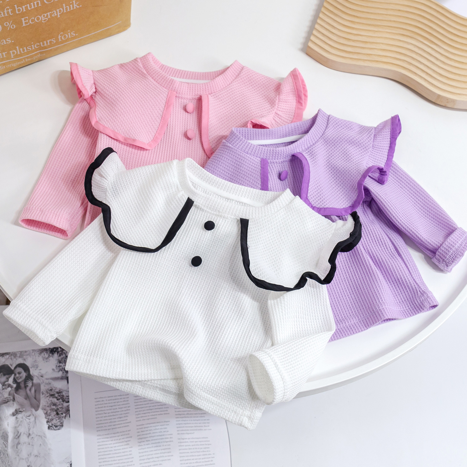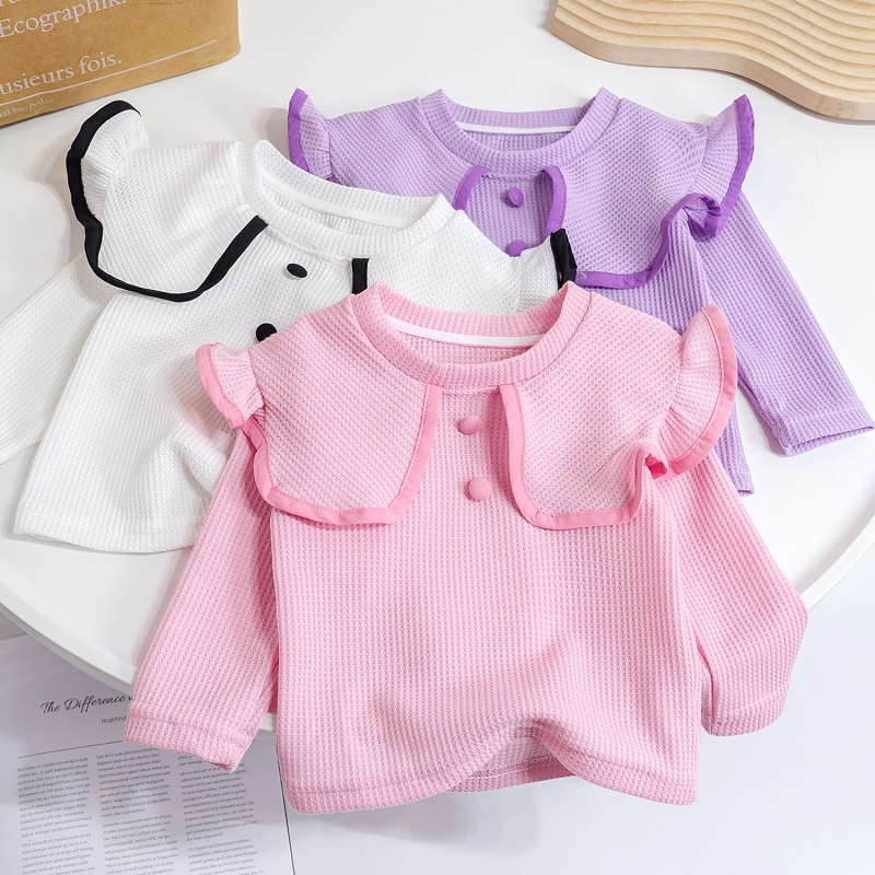 여아베이스 셔츠 봄 2023 새로운 어린이 한국 스타일 서양 레이스 단색 긴 소매 티셔츠