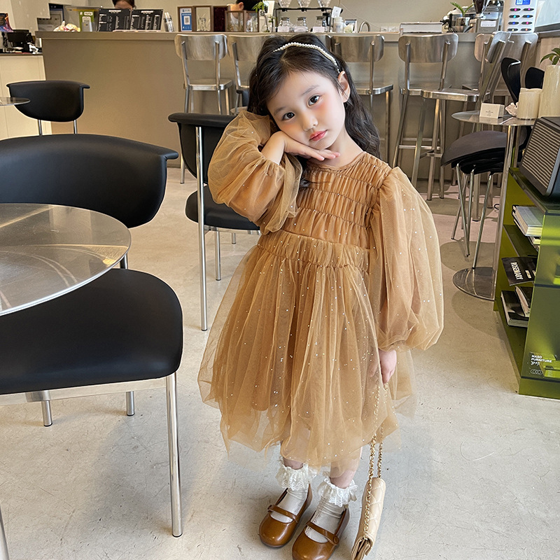 여자 카키 원피스 2023 봄과 가을 새로운 소녀 패션 세련된 메쉬 원피스 아기 생일 원피스스토어 가기
