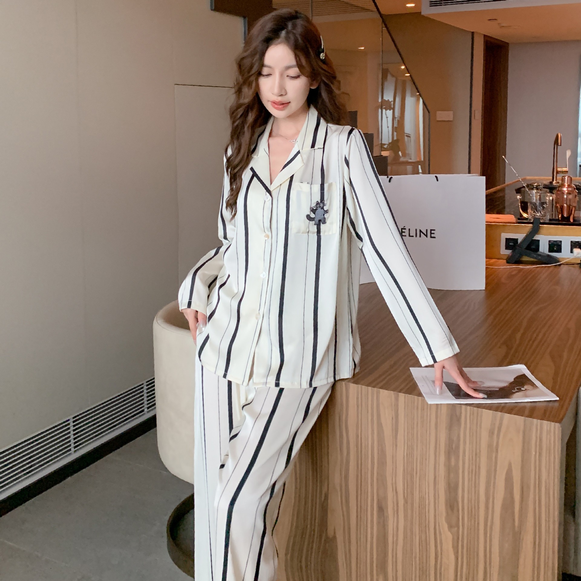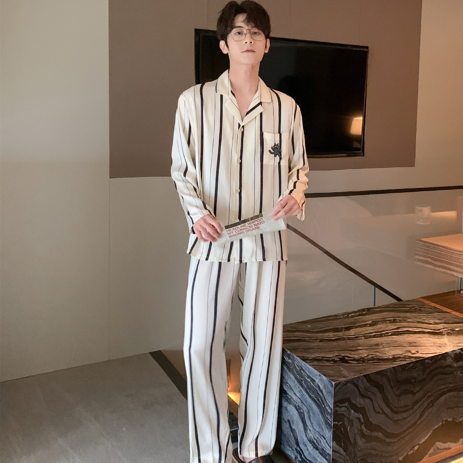 커플 잠옷 여자의 봄과 가을 얼음 실크 가정 옷 여름 남자의 긴 소매 모조 실크 인쇄 만화 가정 옷스토어 가기