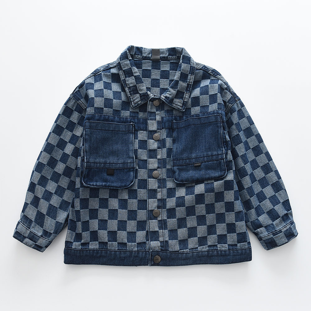 2023春季新款 时尚格子 男女中大童口袋牛仔服夹克外套