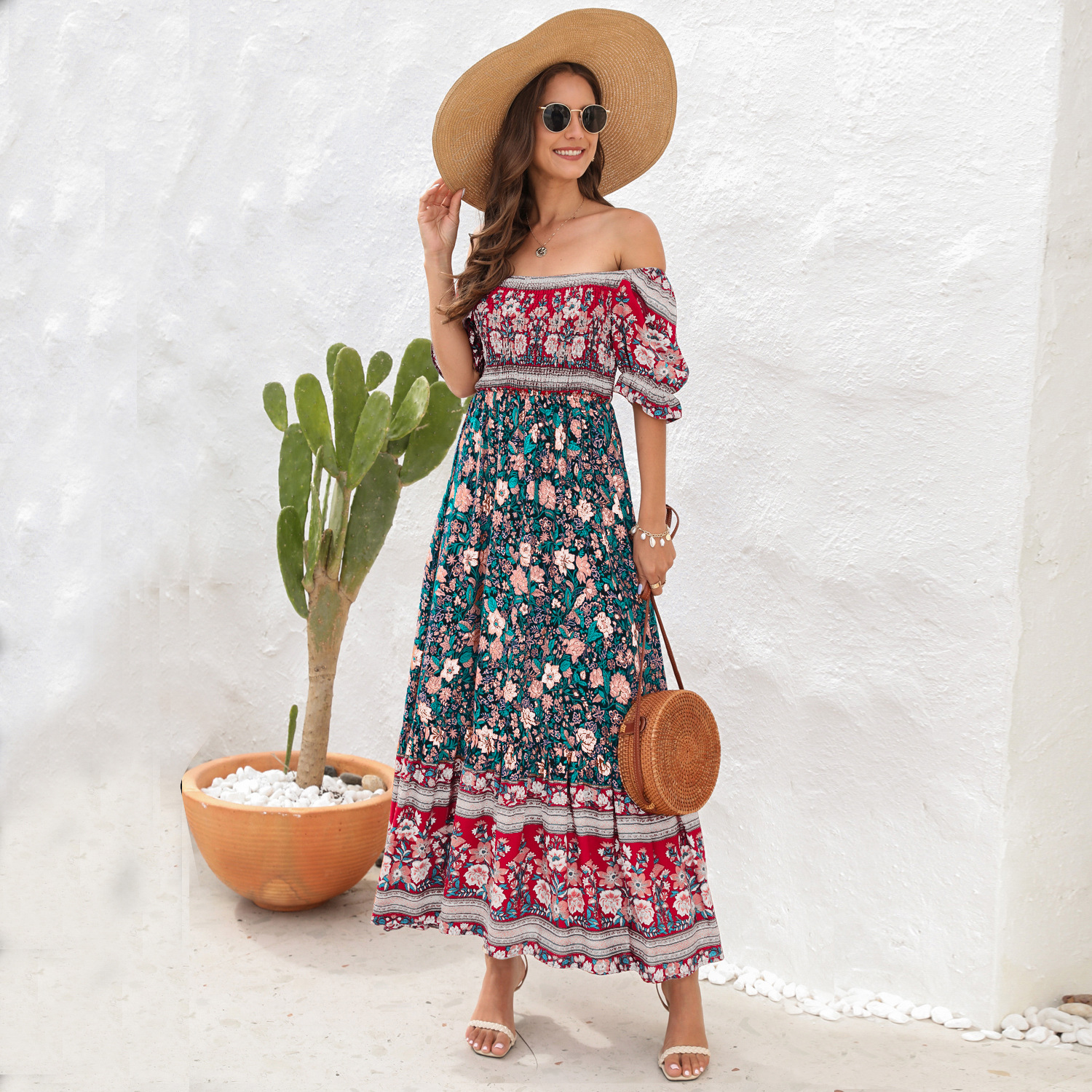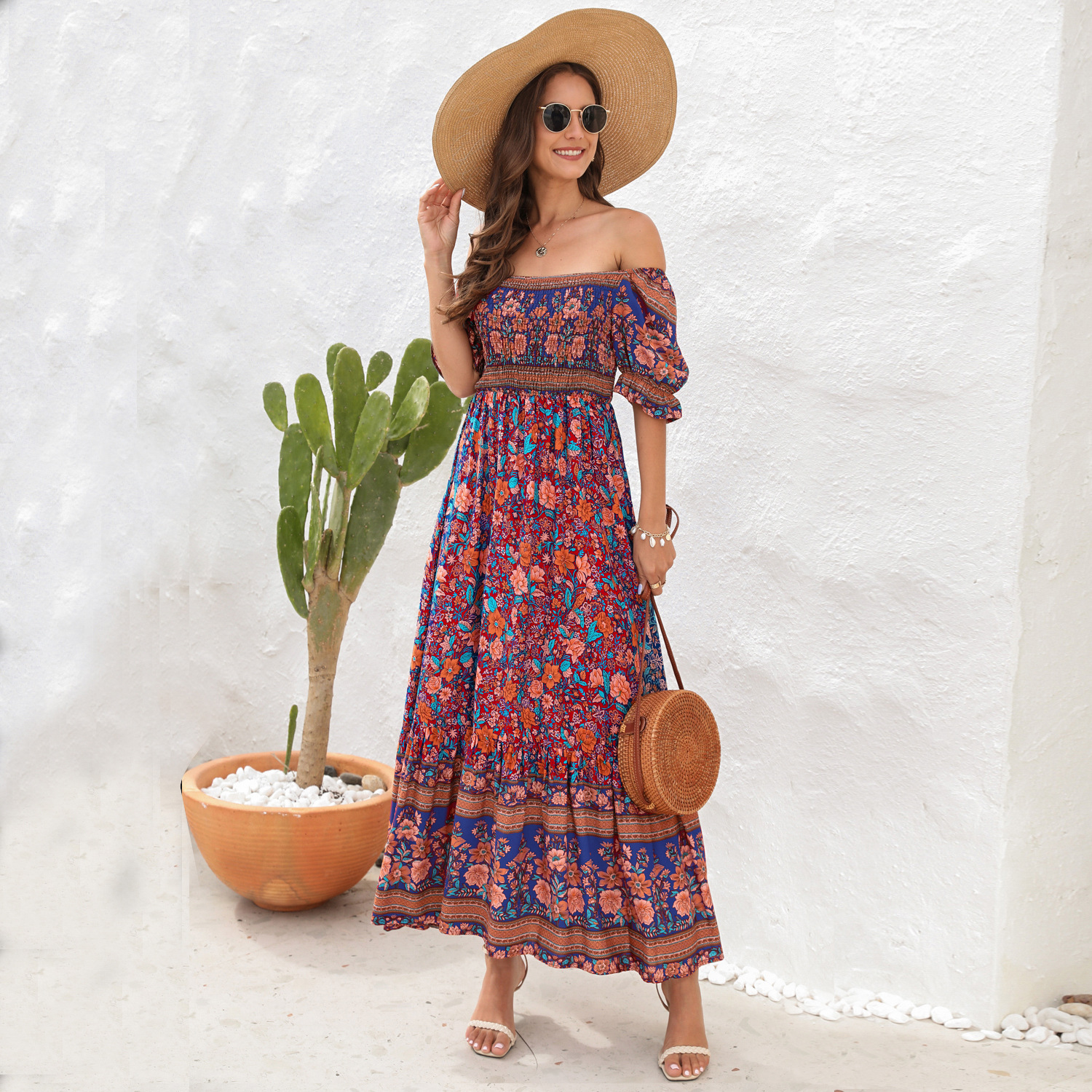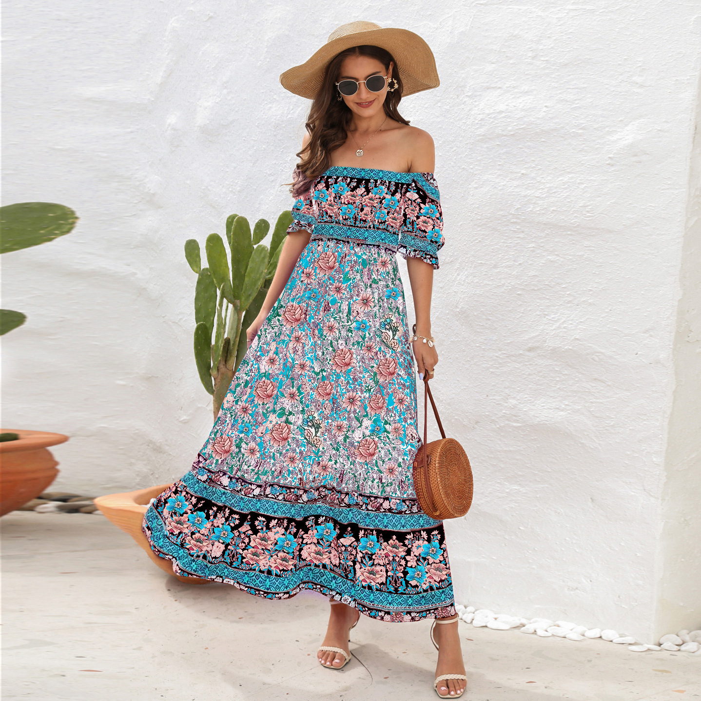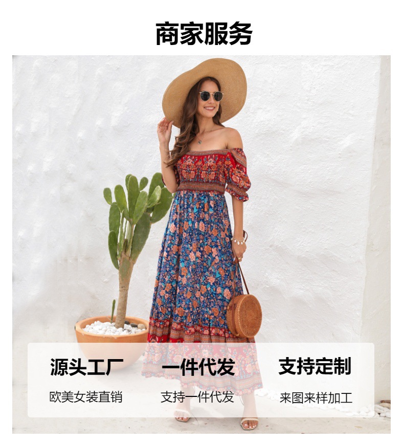아마존 보헤미안 비치 홀리데이 원피스 오프 숄더 버블 슬리브 유럽과 미국 스타일 긴 원피스