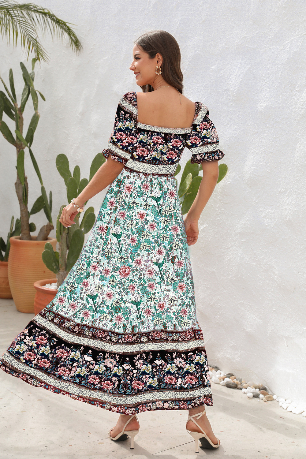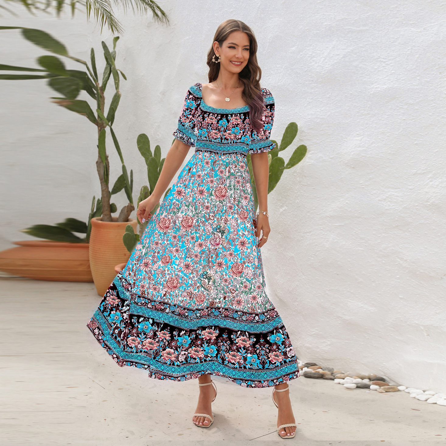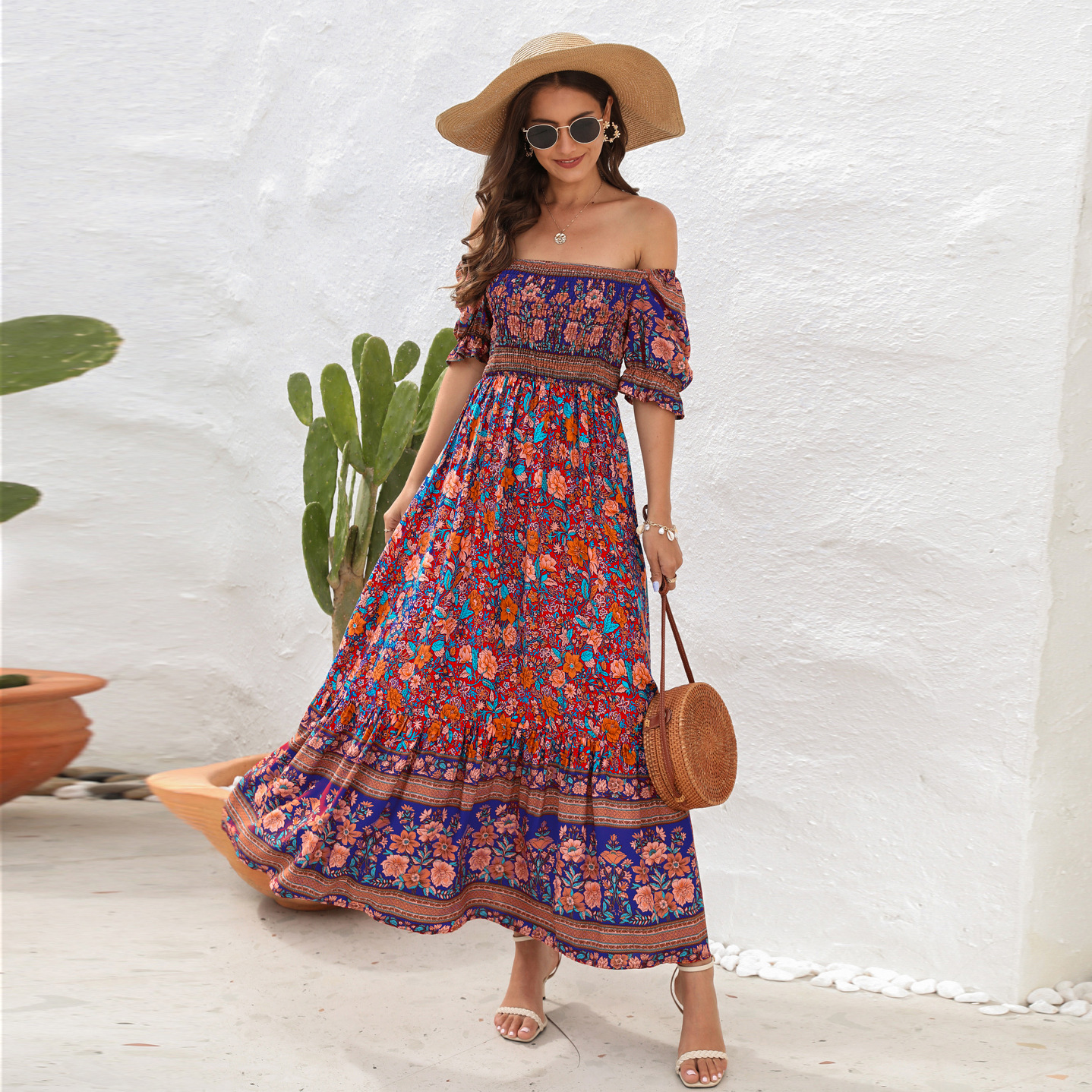 아마존 보헤미안 비치 홀리데이 원피스 오프 숄더 버블 슬리브 유럽과 미국 스타일 긴 원피스