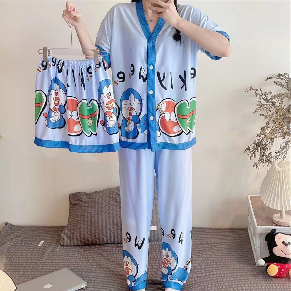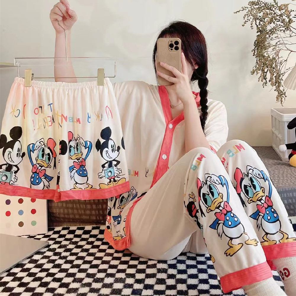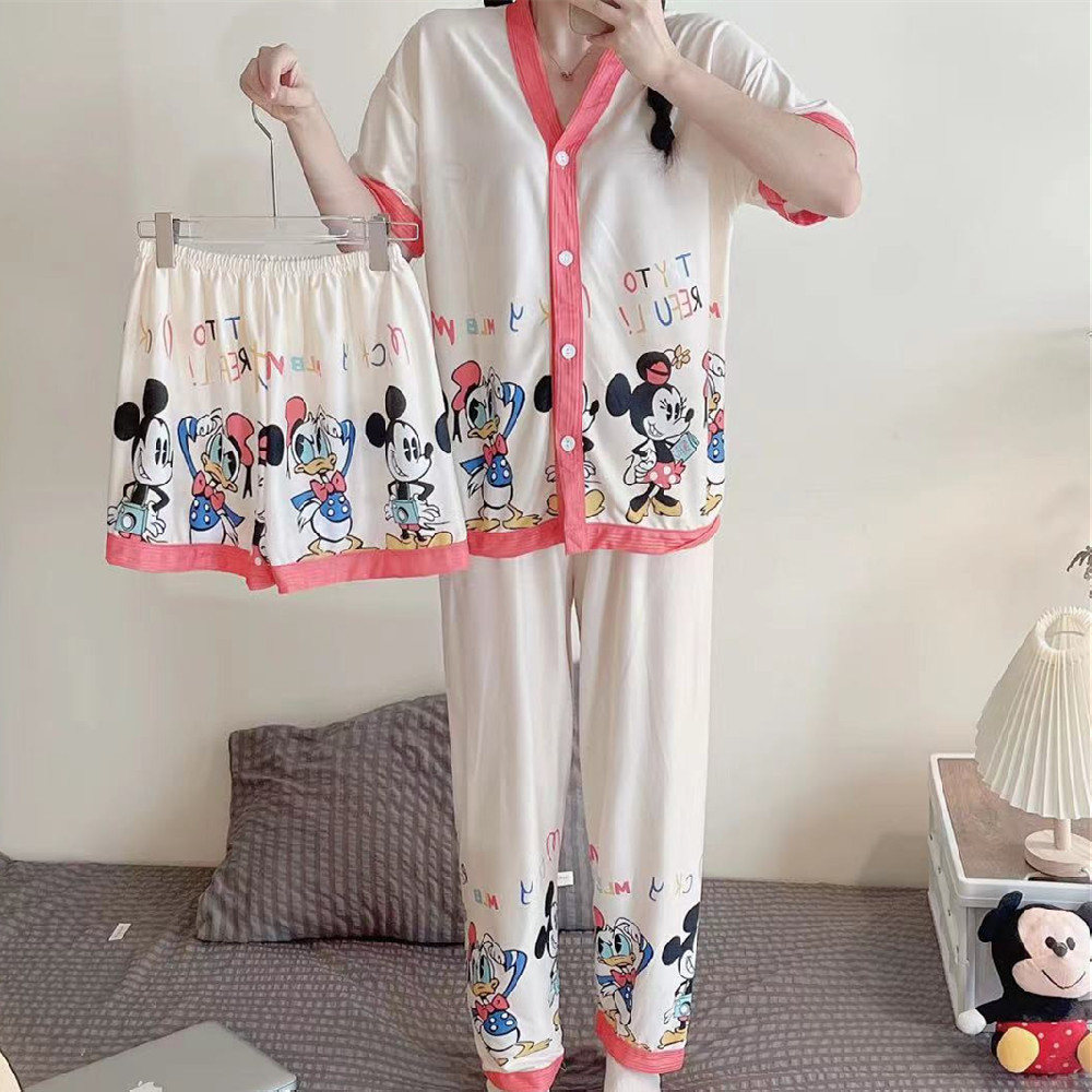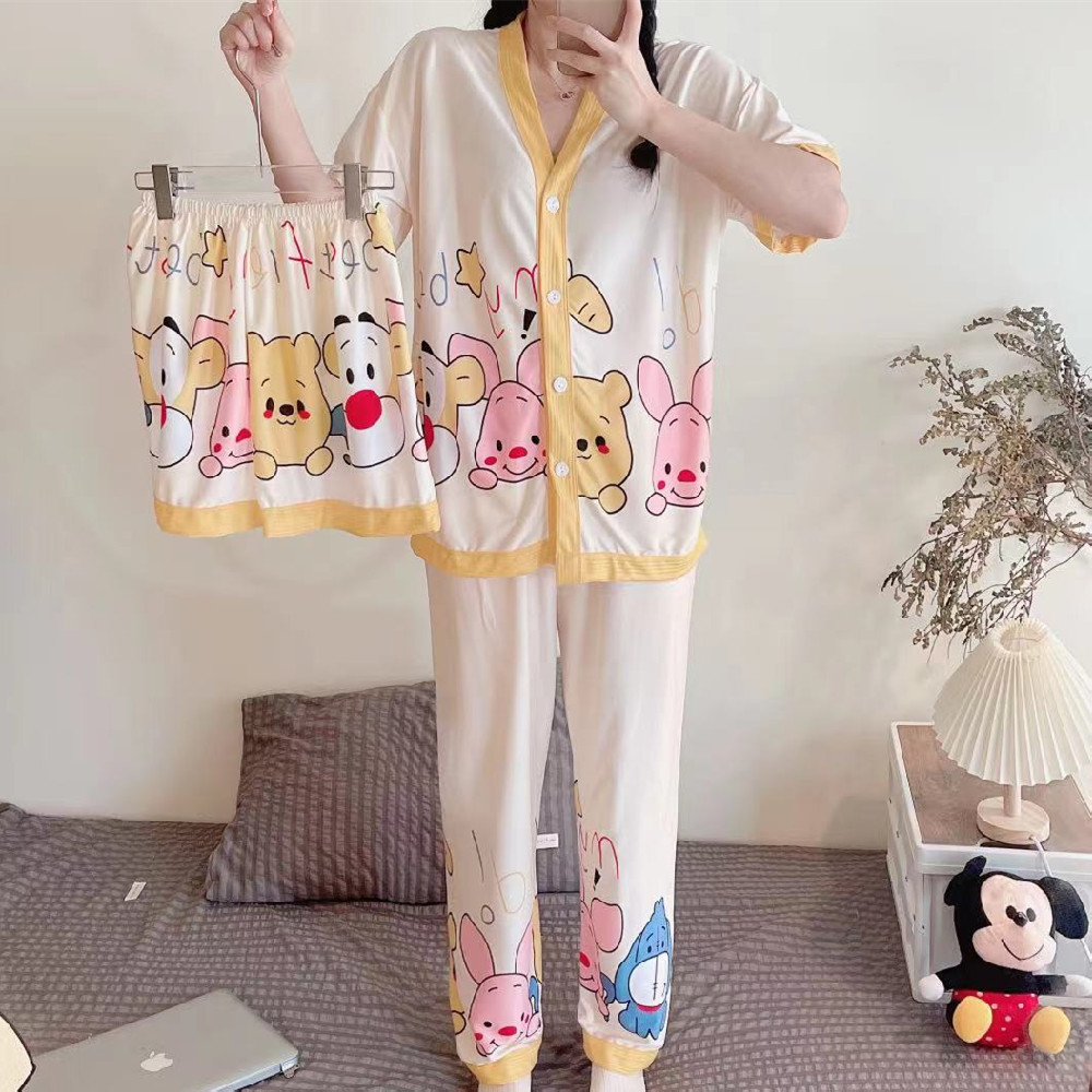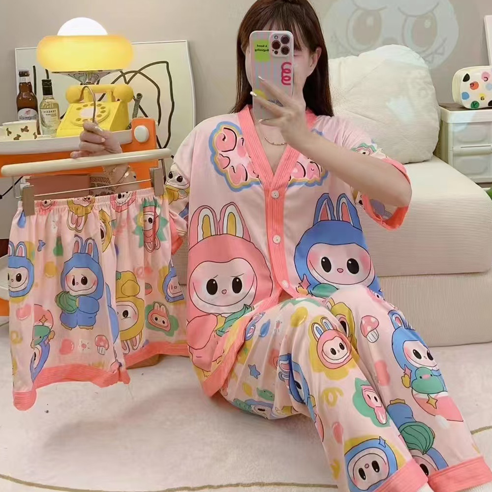쓰리 피스 홈 의류 대외 무역 반팔 가디건 봄과 여름 얇은 만화 학생의 샤넬 스타일 아웃웨어 여성 잠옷