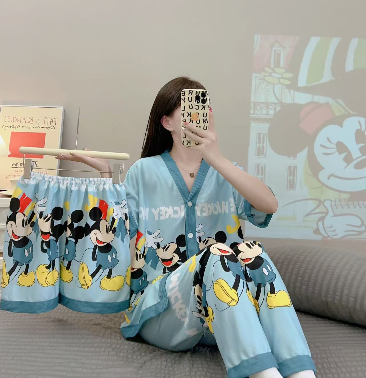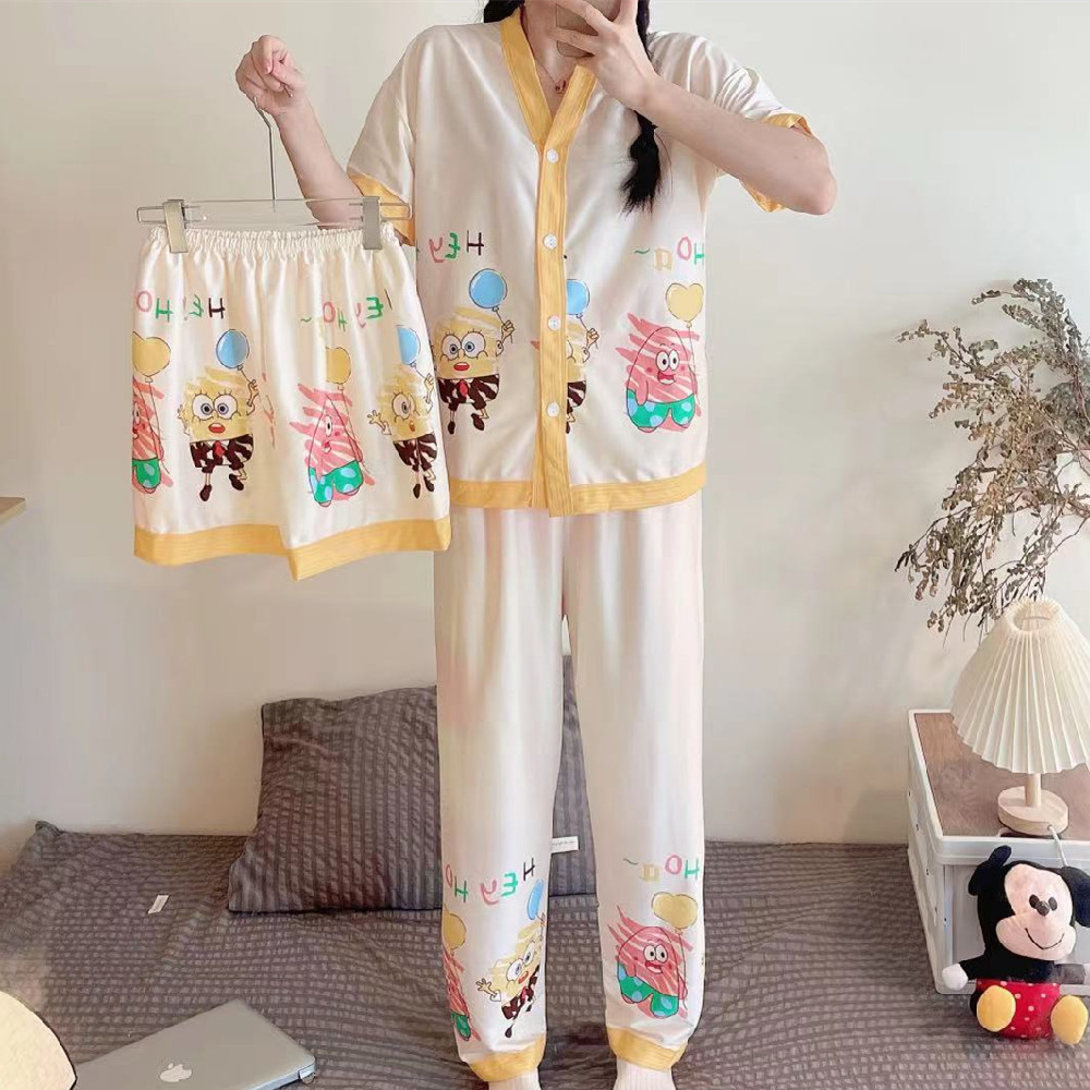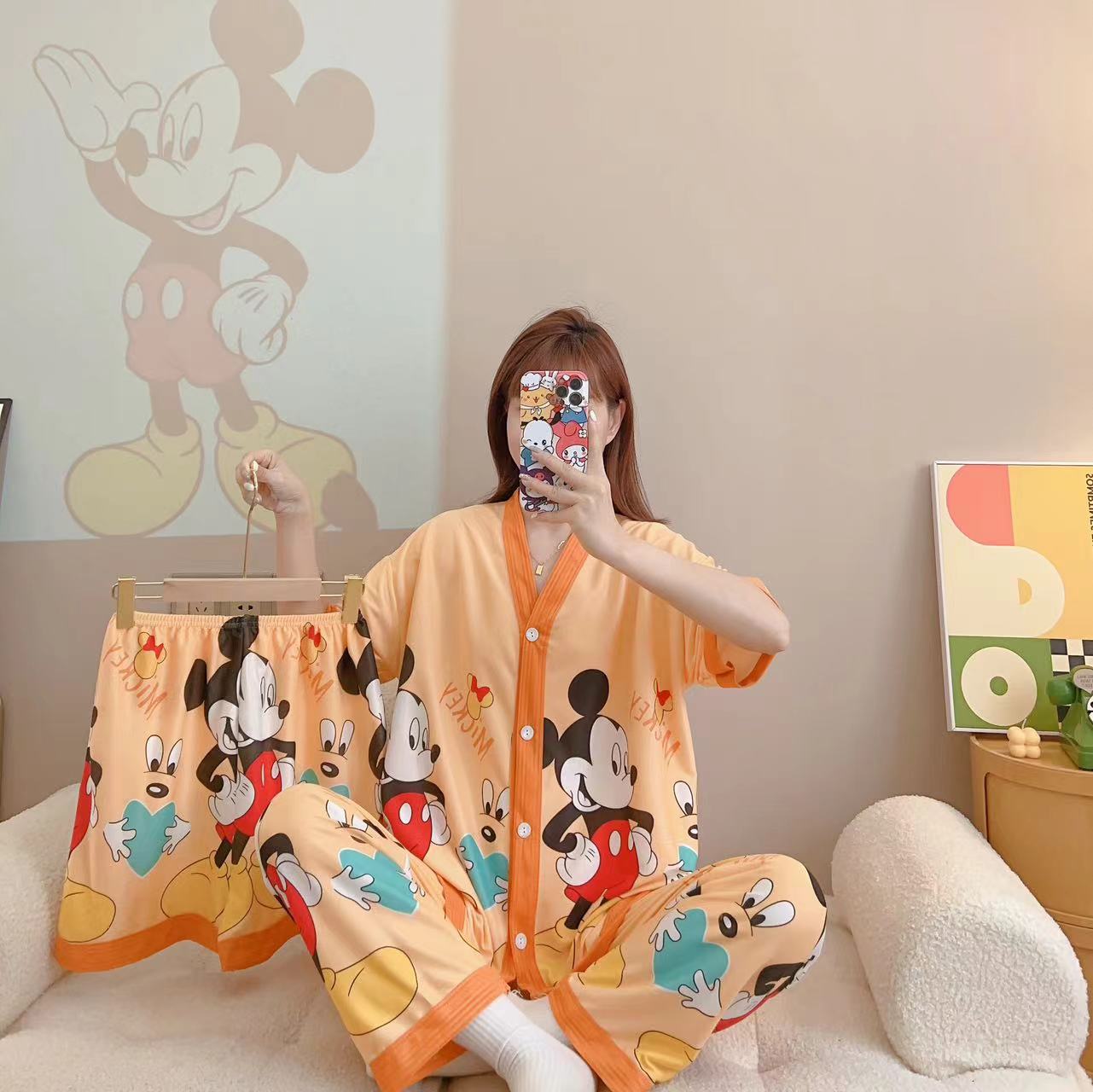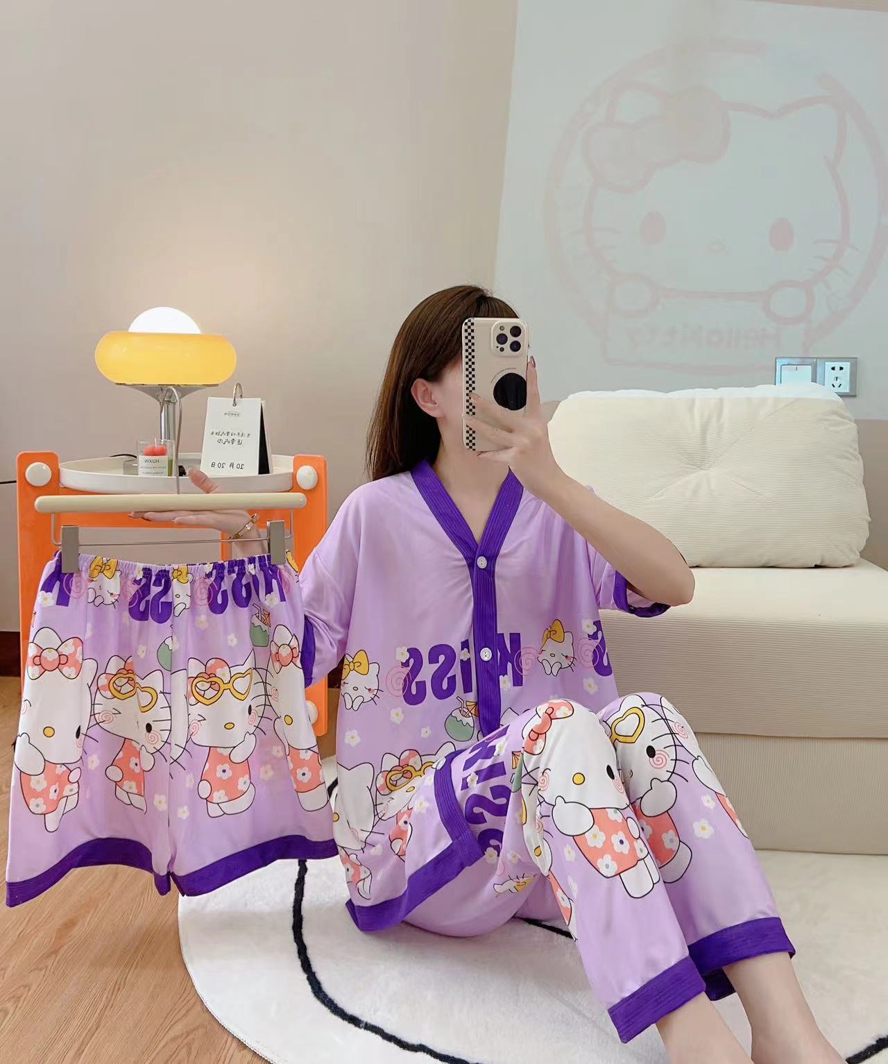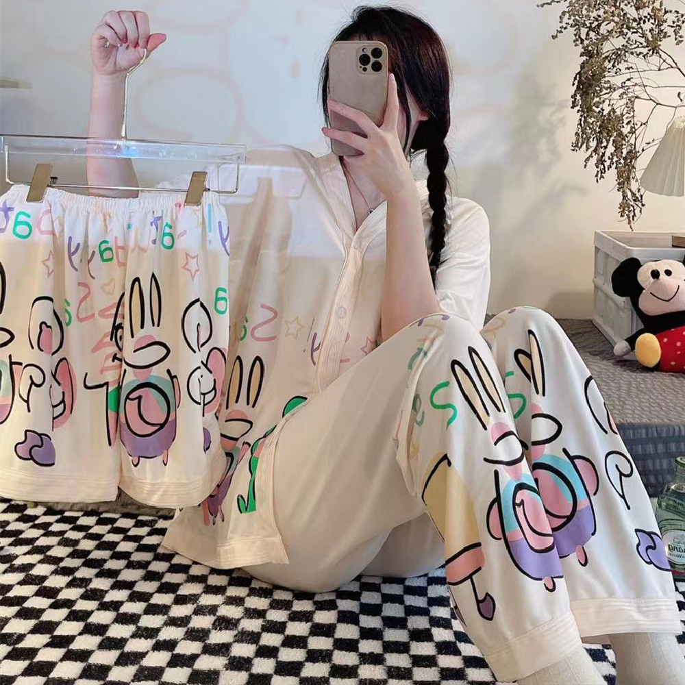 쓰리 피스 홈 의류 대외 무역 반팔 가디건 봄과 여름 얇은 만화 학생의 샤넬 스타일 아웃웨어 여성 잠옷