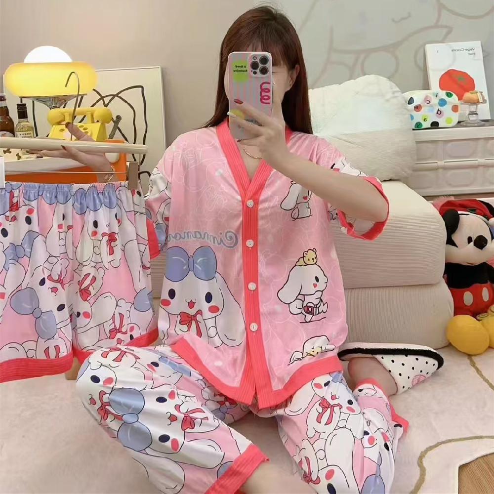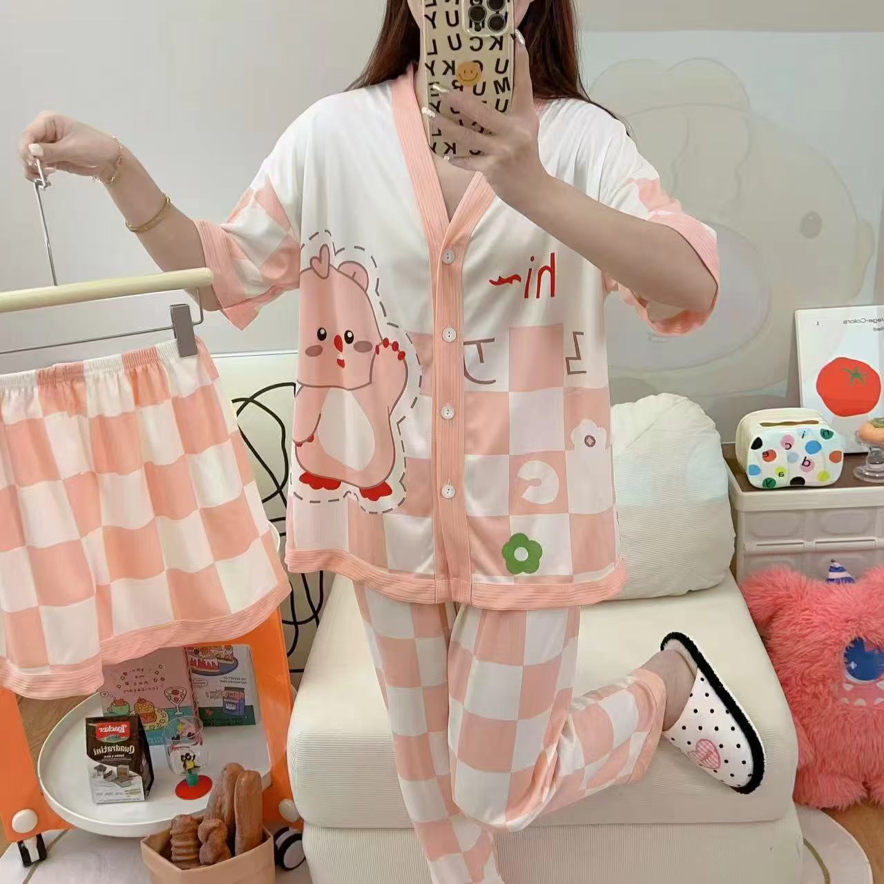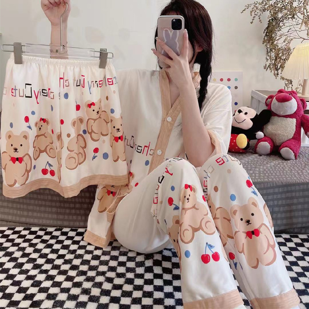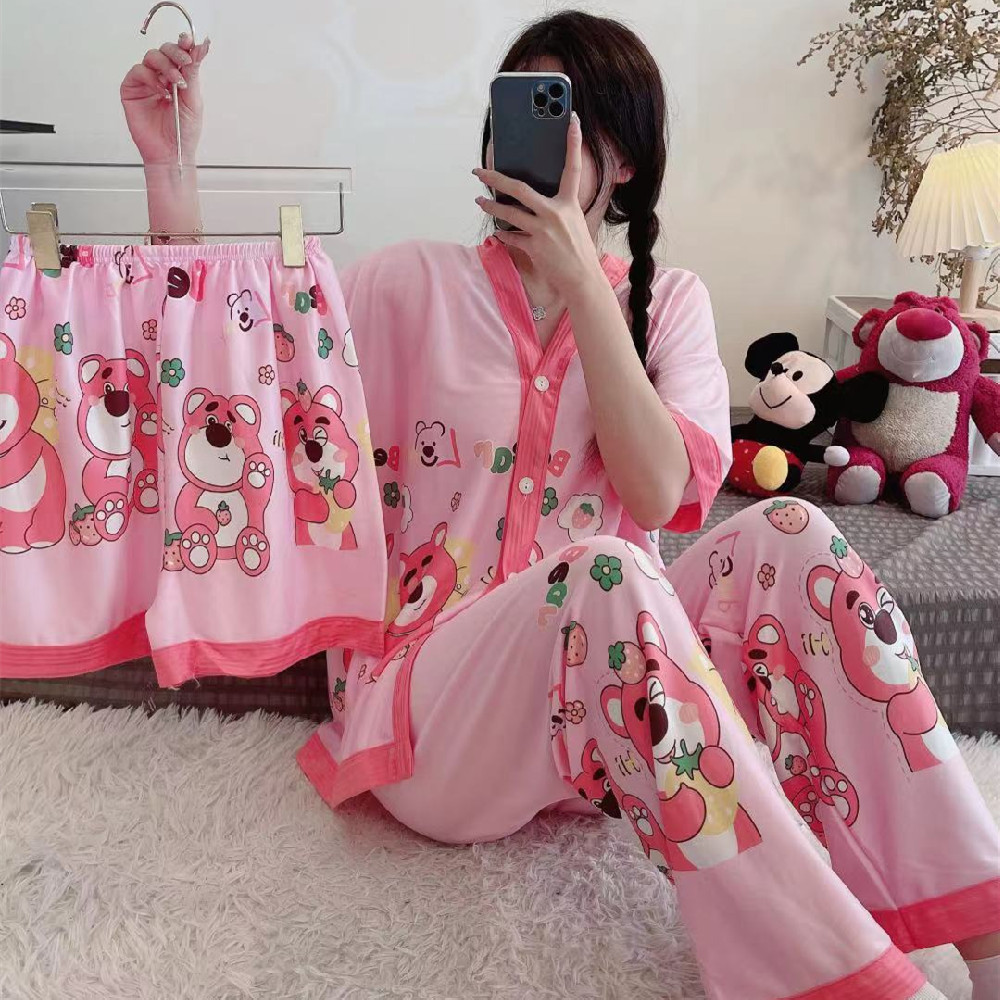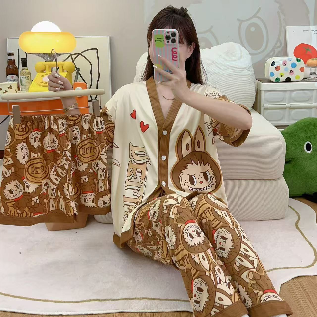 쓰리 피스 홈 의류 대외 무역 반팔 가디건 봄과 여름 얇은 만화 학생의 샤넬 스타일 아웃웨어 여성 잠옷스토어 가기