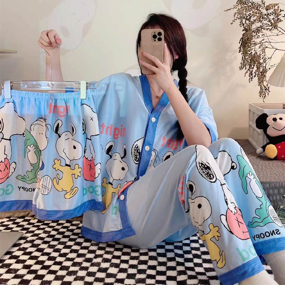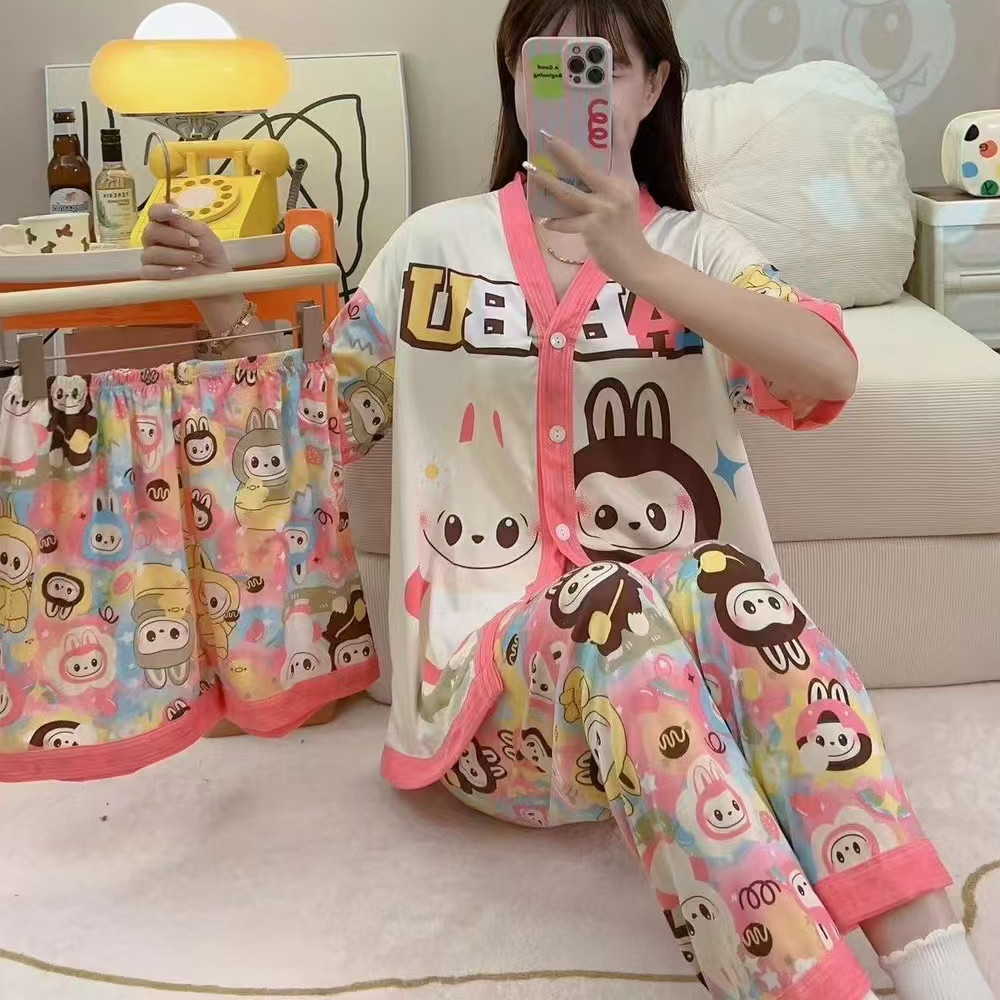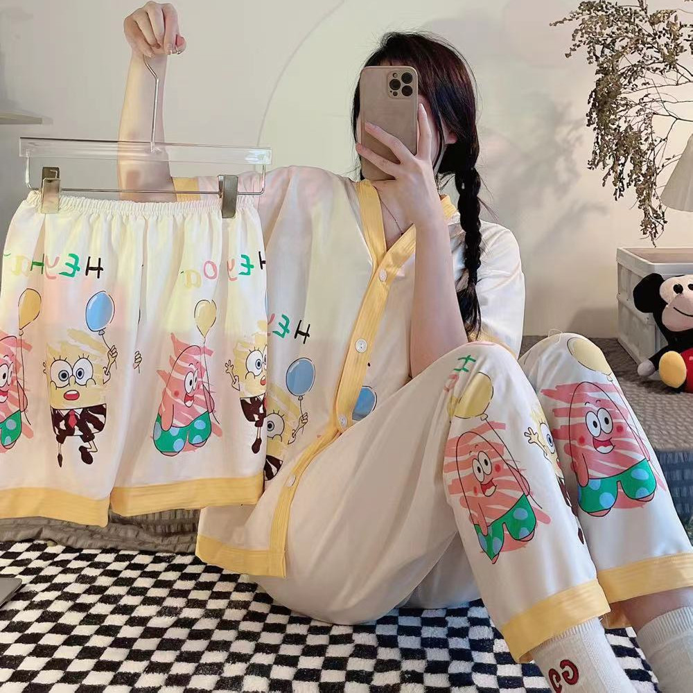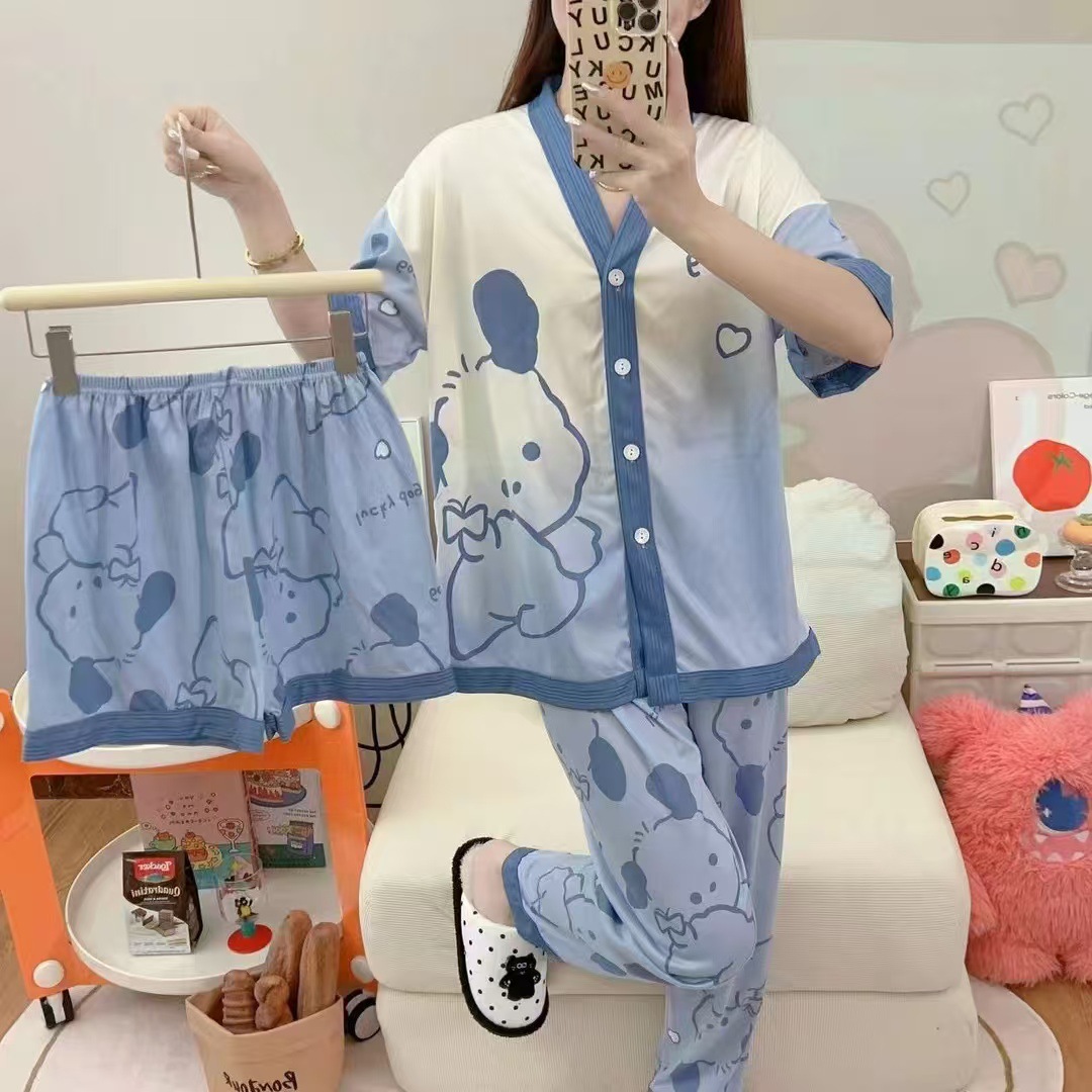 쓰리 피스 홈 의류 대외 무역 반팔 가디건 봄과 여름 얇은 만화 학생의 샤넬 스타일 아웃웨어 여성 잠옷스토어 가기