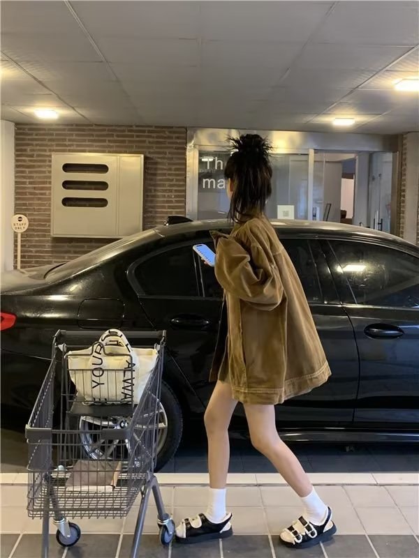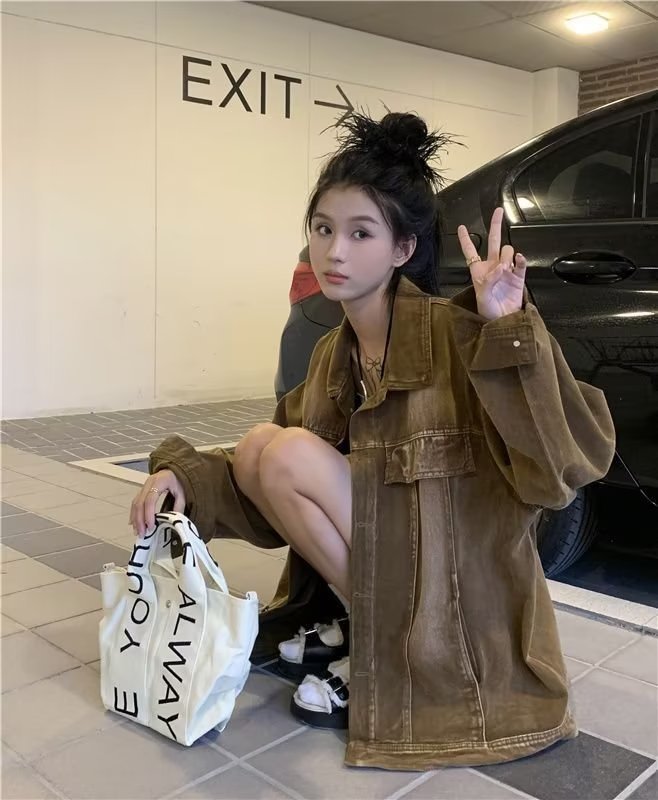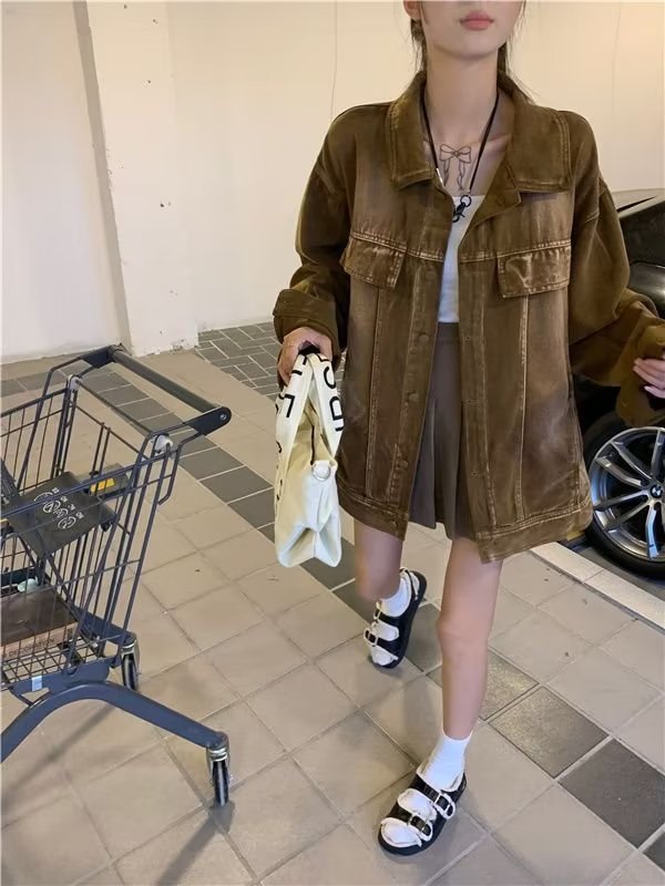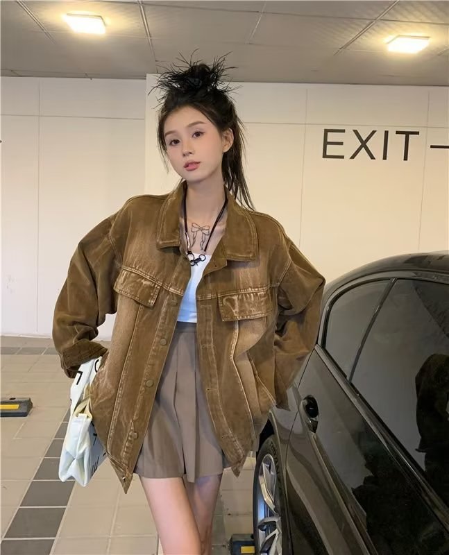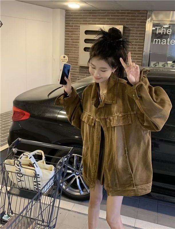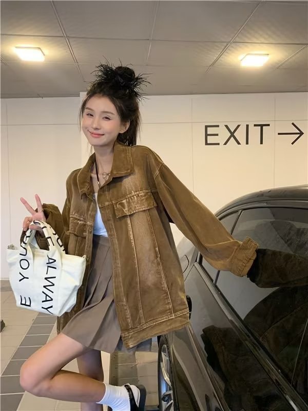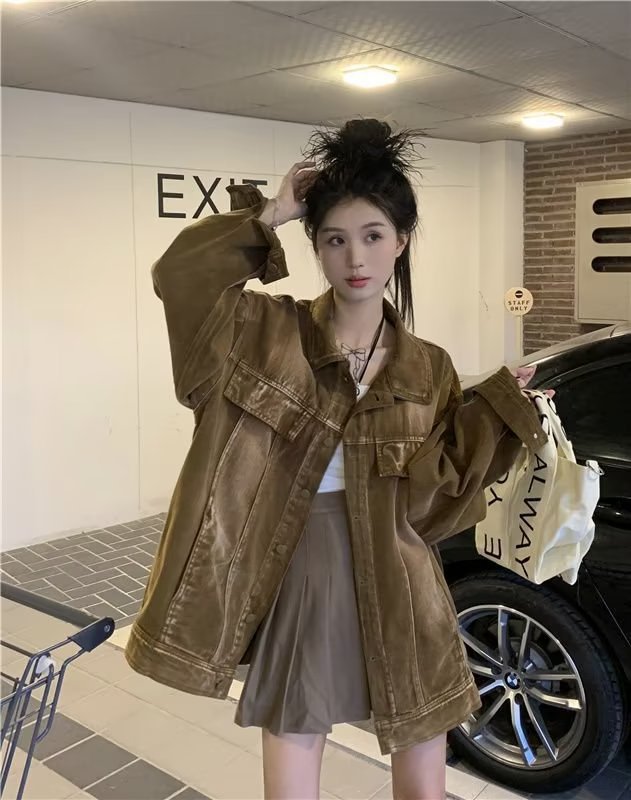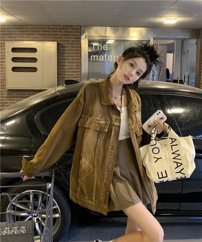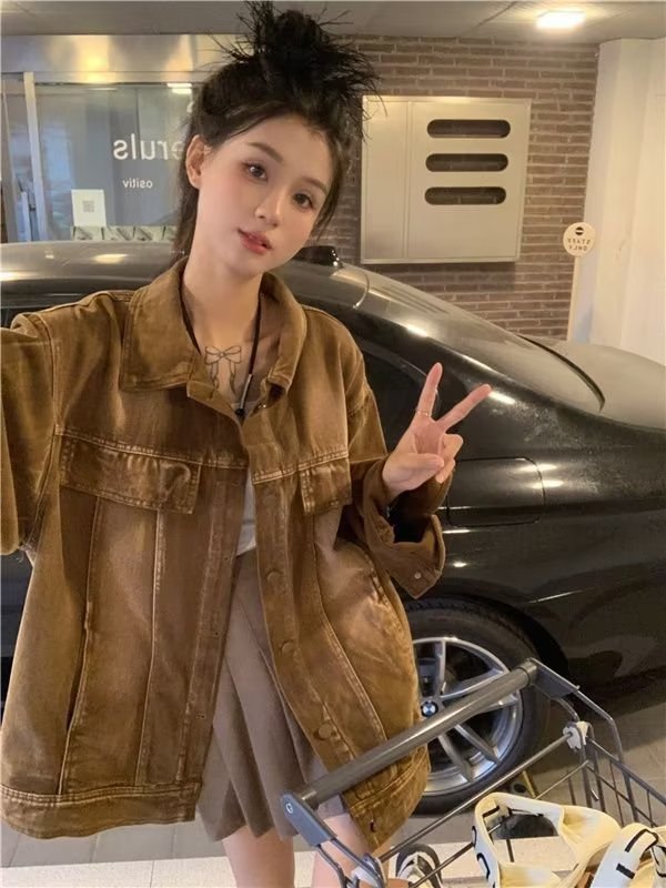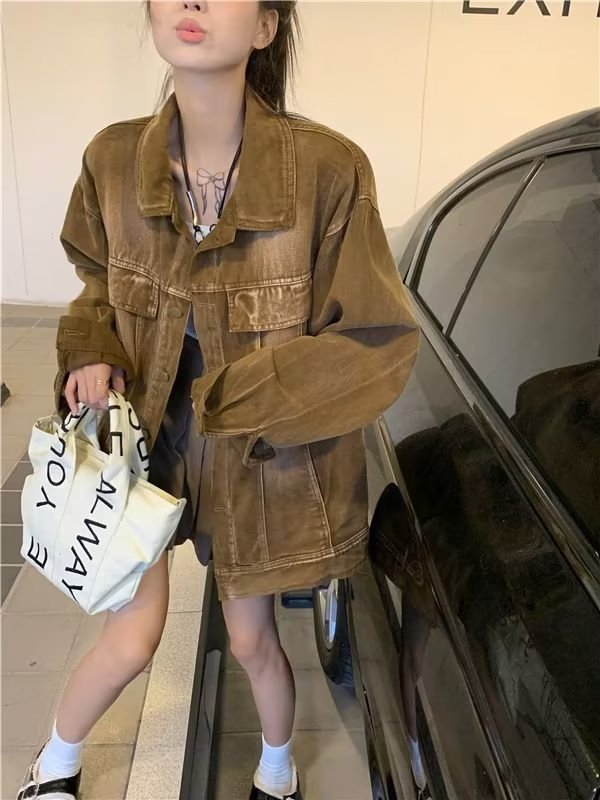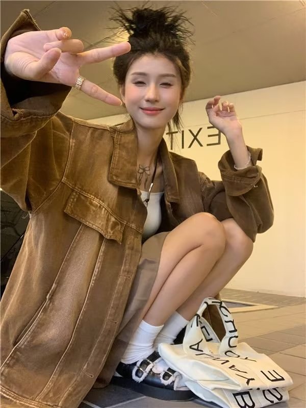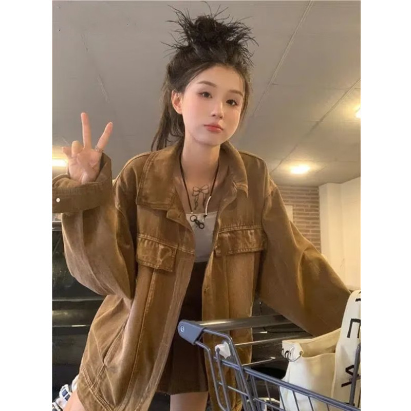 아메리칸 스타일 레트로 다크 브라운 데님 코트 여성의 봄 가을과 겨울 느슨한 모든 일치 빈티지 작업 재킷 탑 인 트렌디스토어 가기