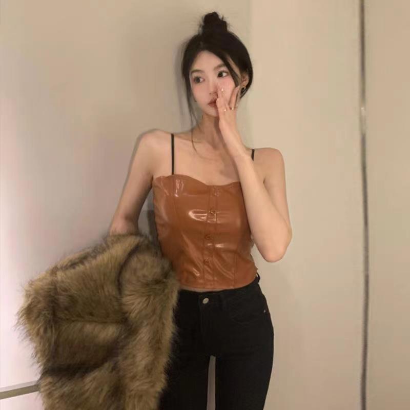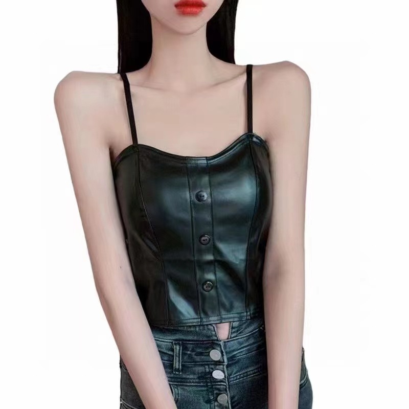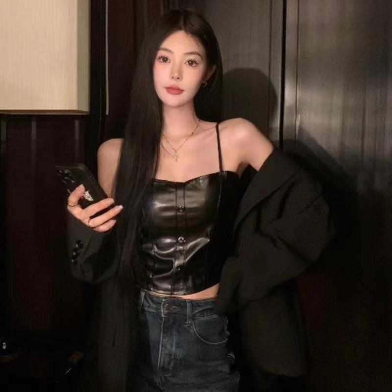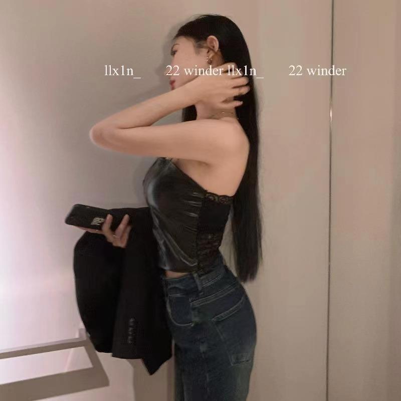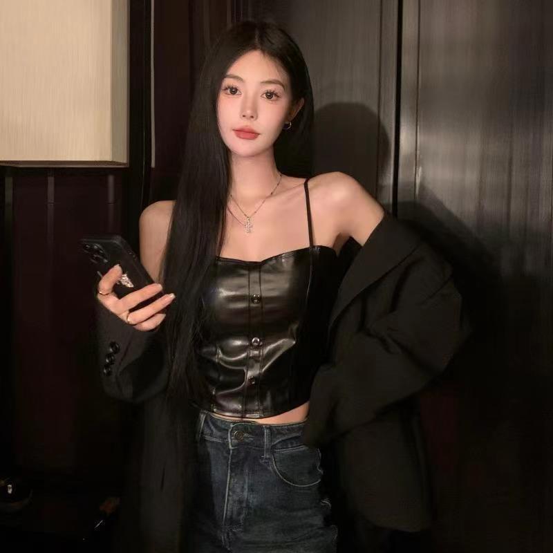 핫 걸스 Puleather 캐미솔 여성용 가을과 겨울 블랙 기질 가슴 패드 짧은 내부 탑 베이스 셔츠 겉옷