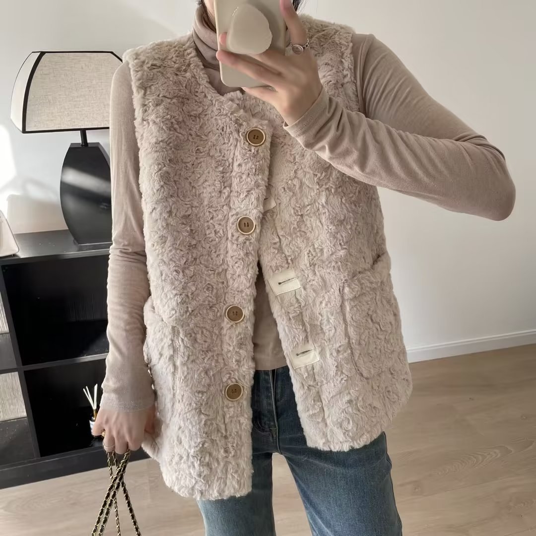 2023 봄과 가을 새로운 느슨한 Lambswool 조끼 외부 착용 모피 원피스 조끼 재킷 여성용