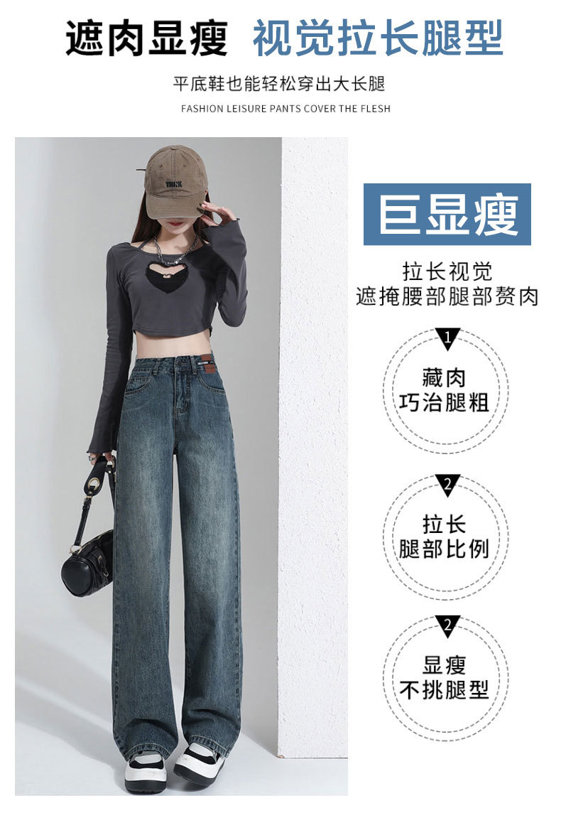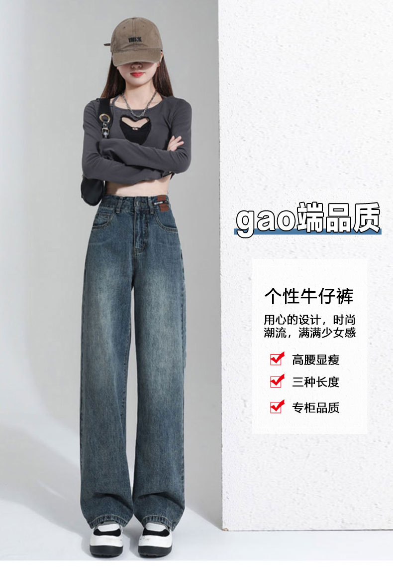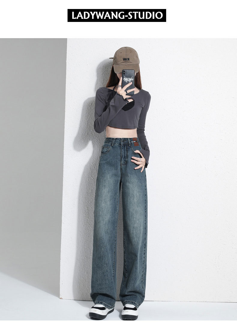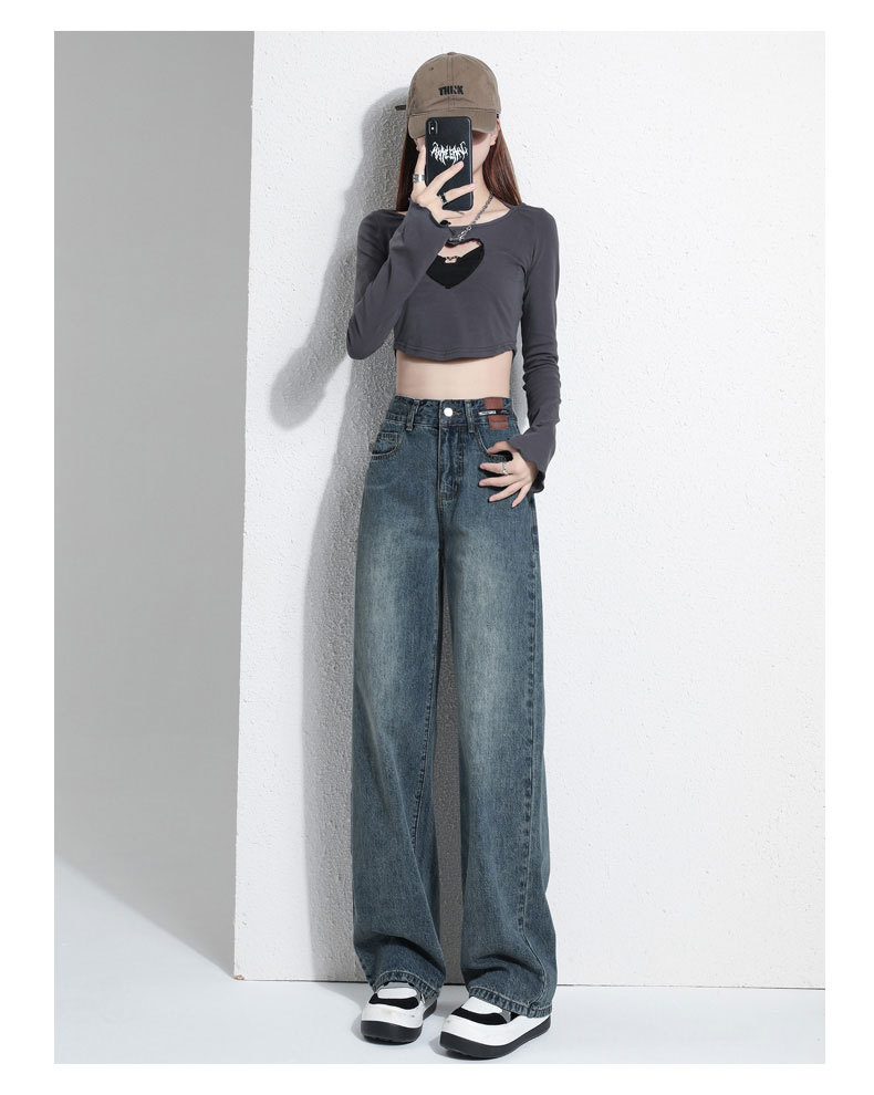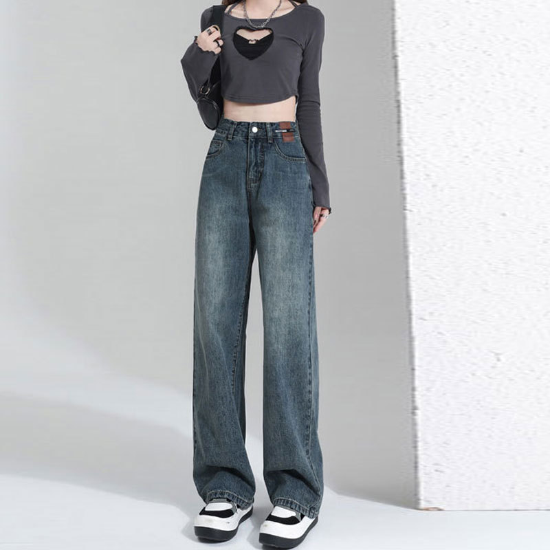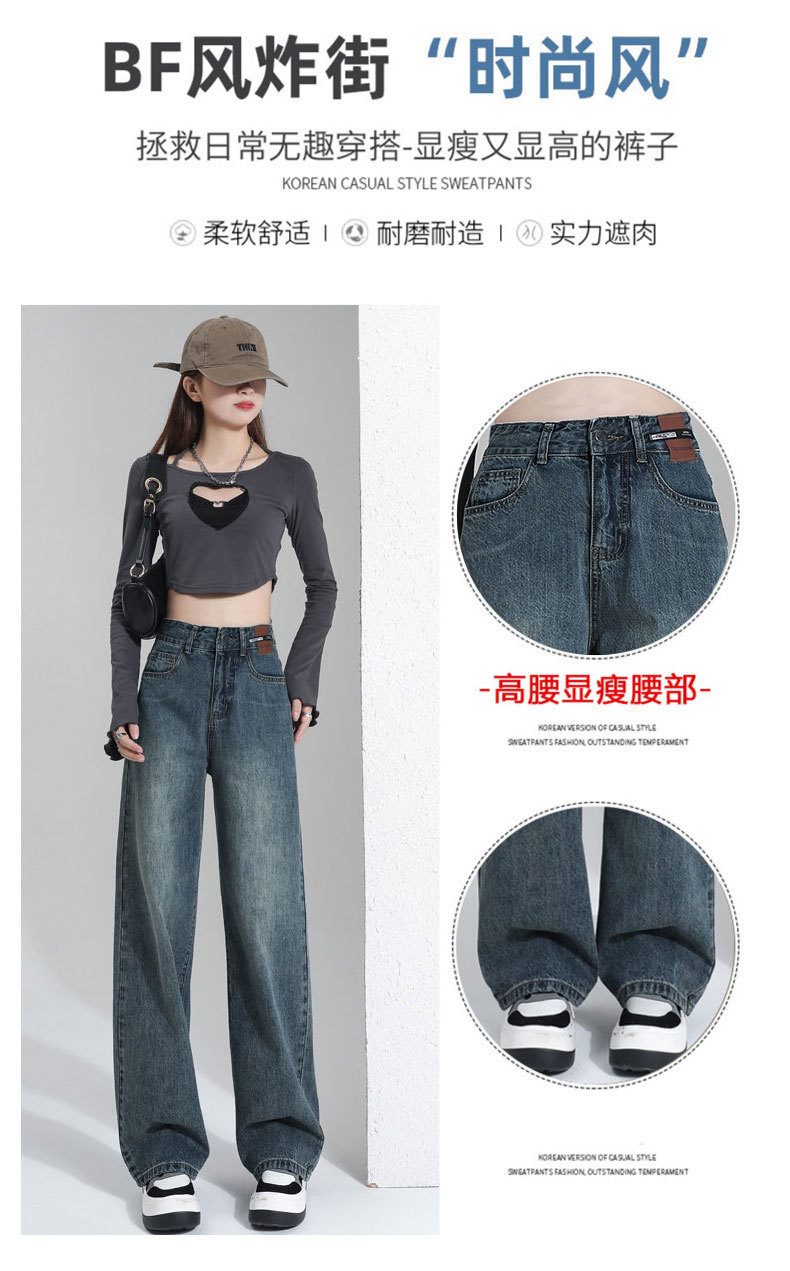 디자인 가죽 청바지 여성 하이 웨이스트 느슨한 모든 매치 캐주얼 하이 스트리트 스트레이트 팬츠 작은 걸레 와이드 레그 팬츠스토어 가기