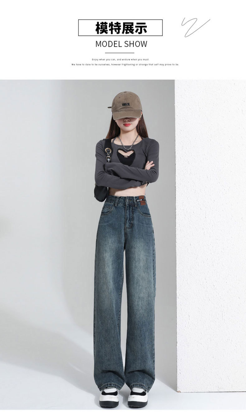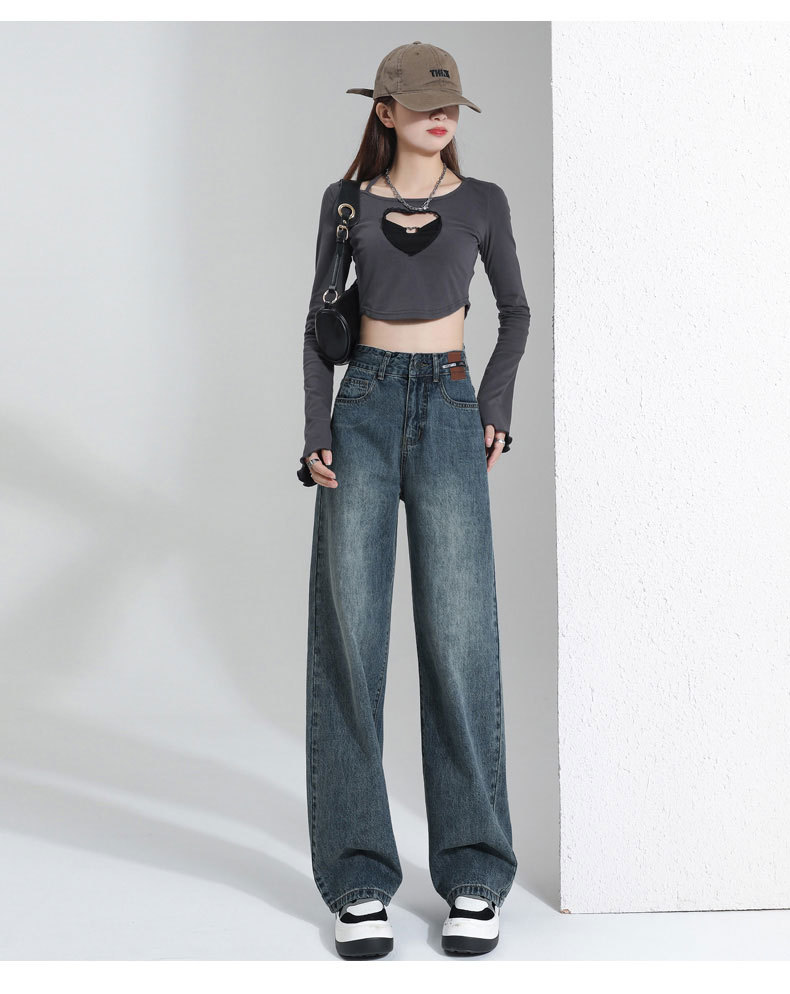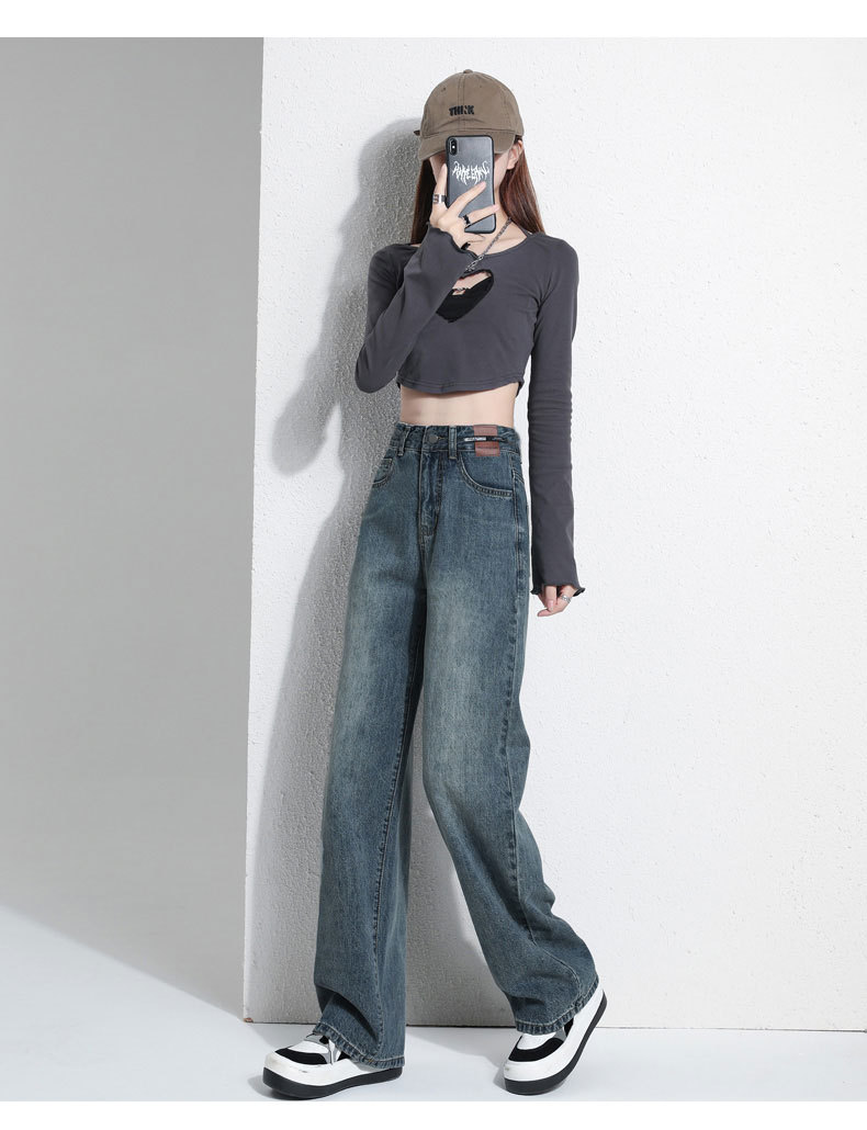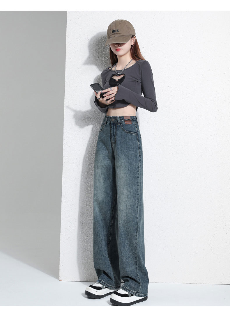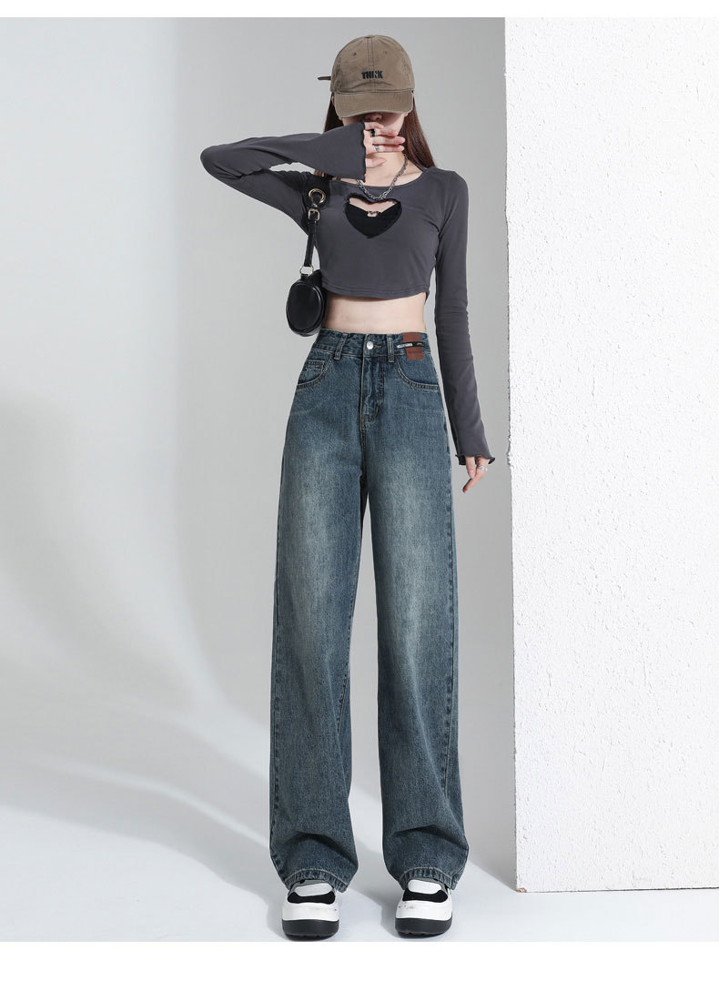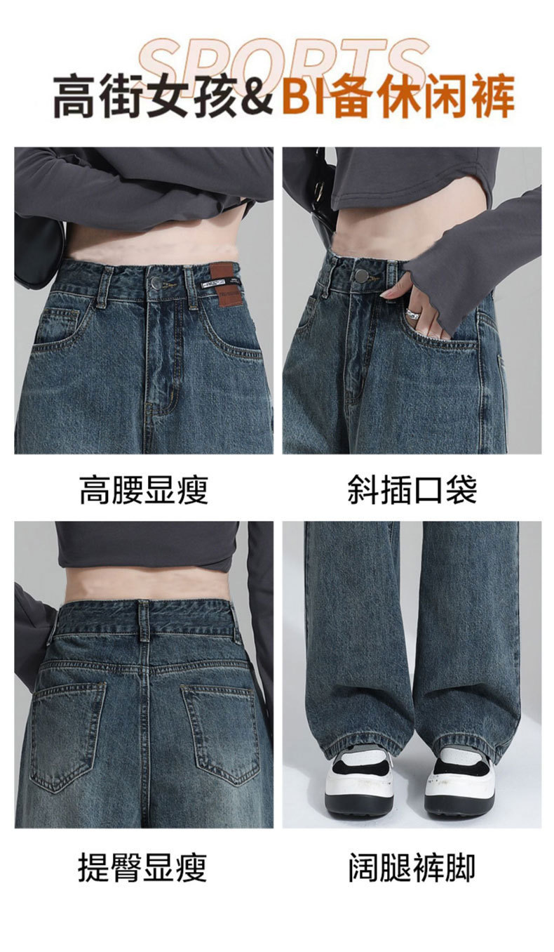 디자인 가죽 청바지 여성 하이 웨이스트 느슨한 모든 매치 캐주얼 하이 스트리트 스트레이트 팬츠 작은 걸레 와이드 레그 팬츠스토어 가기