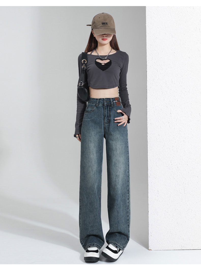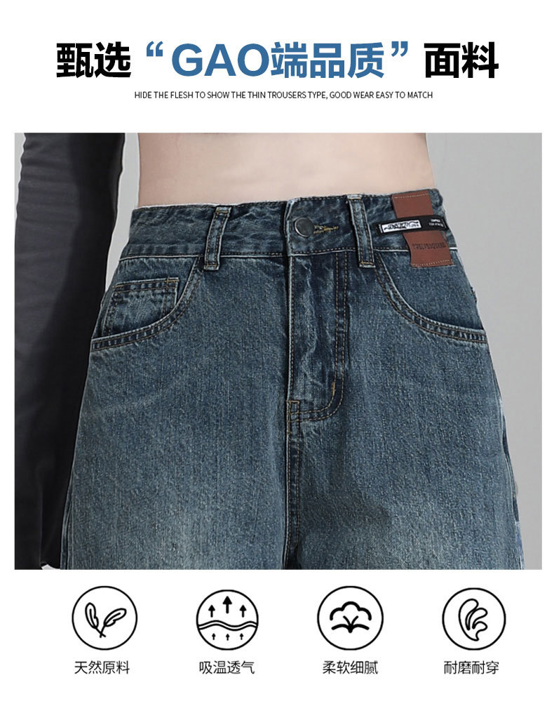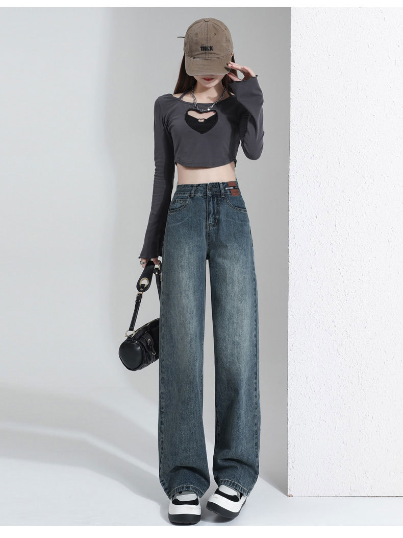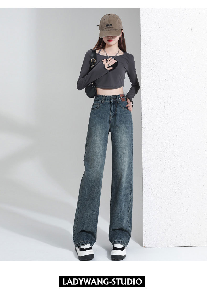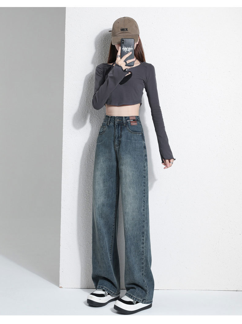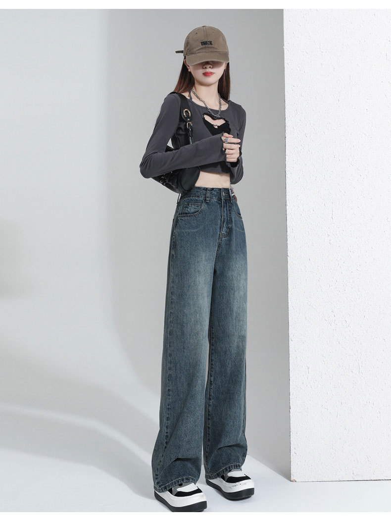 디자인 가죽 청바지 여성 하이 웨이스트 느슨한 모든 매치 캐주얼 하이 스트리트 스트레이트 팬츠 작은 걸레 와이드 레그 팬츠스토어 가기