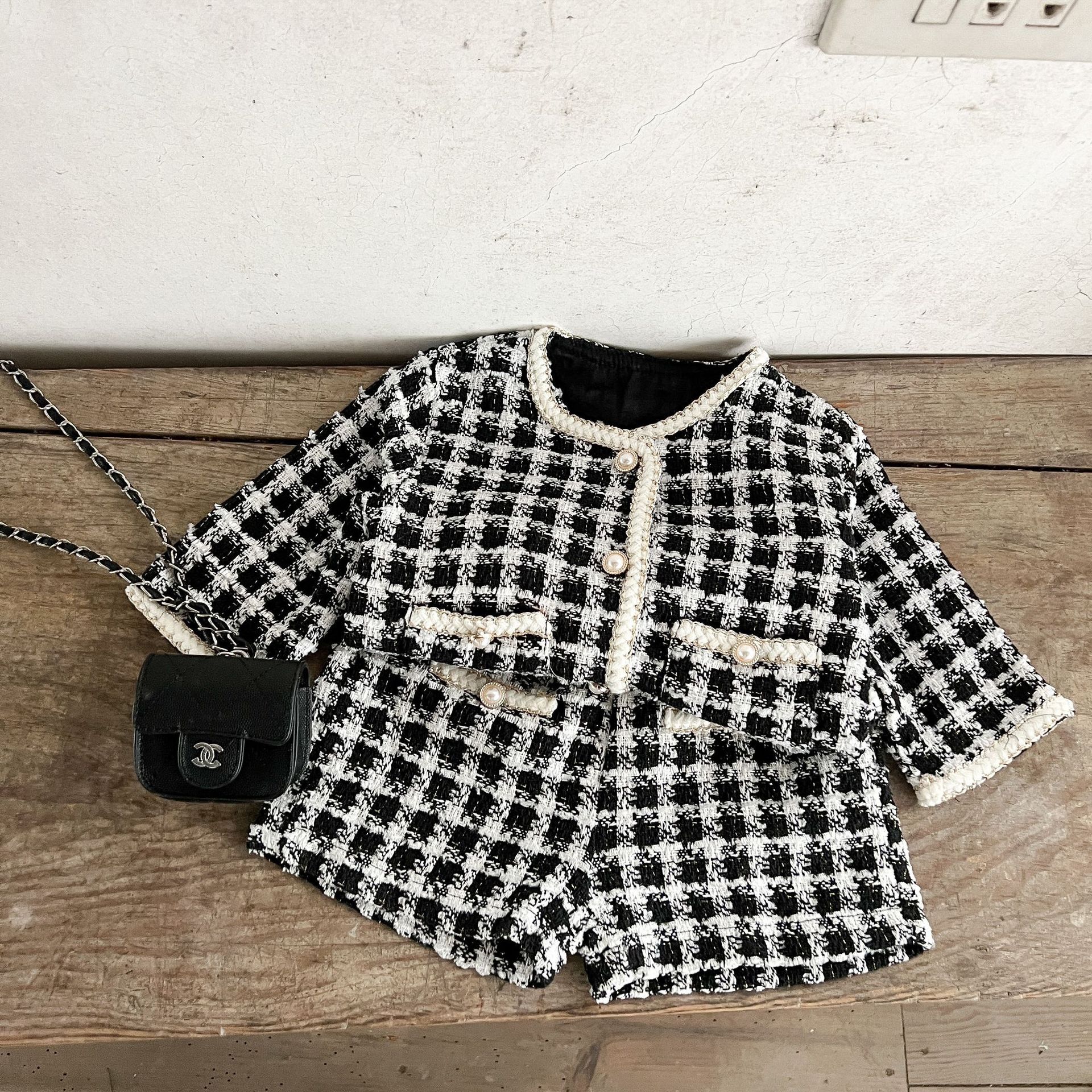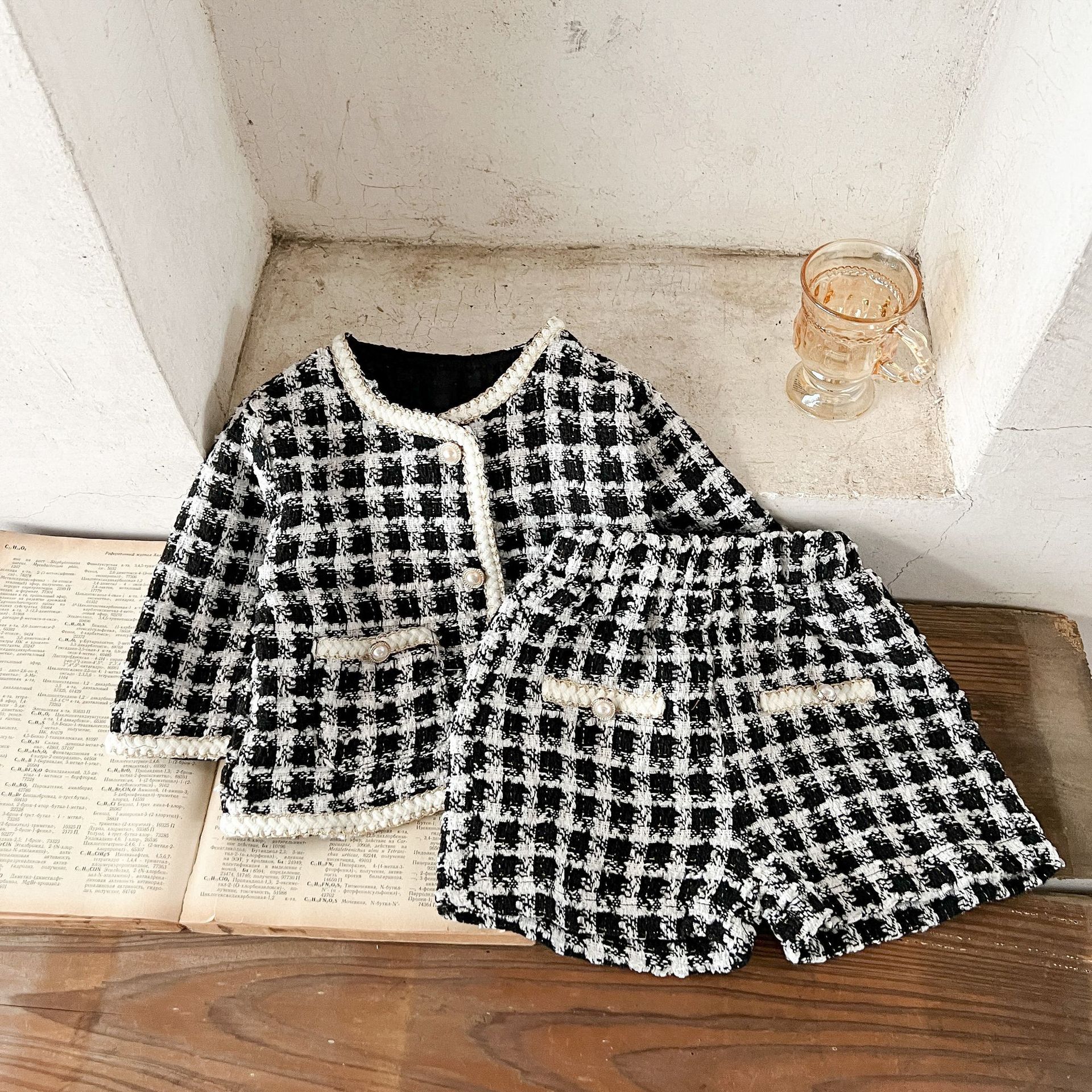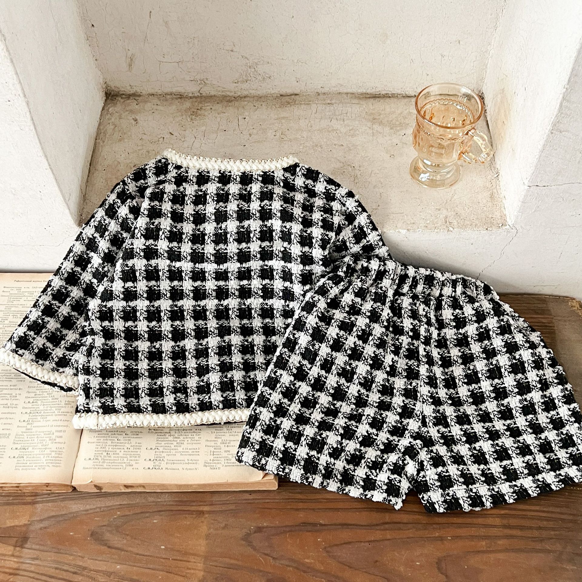 2023ins 봄 착용 아기 소녀 아기 트위드 격자 무늬 긴팔 셔츠 오픈 재킷 + 짧은 바지 투피스 세트